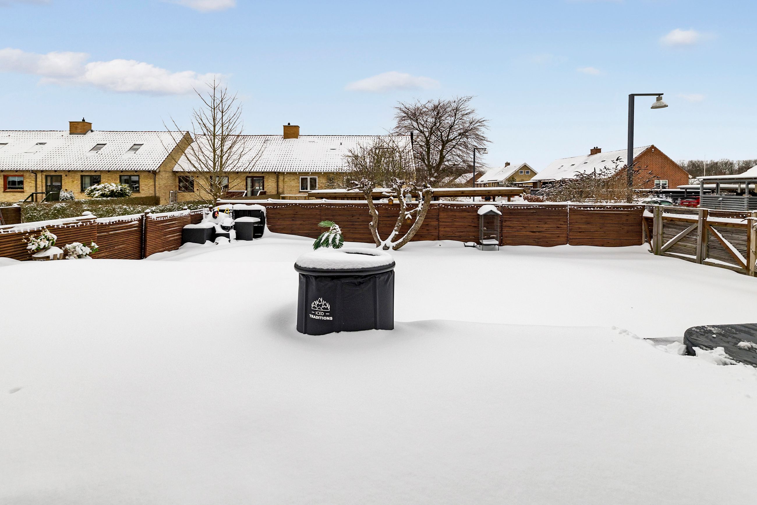 Boligarealet på 127 m2 byder i stueplan på stue- og køkkenalrum med direkte udgang til en stor træterrasse. Terrassen er indrettet med integreret spa og giver fine rammer for ophold og udeliv. Stueplanet rummer desuden to værelser, et kammer samt badeværelse.