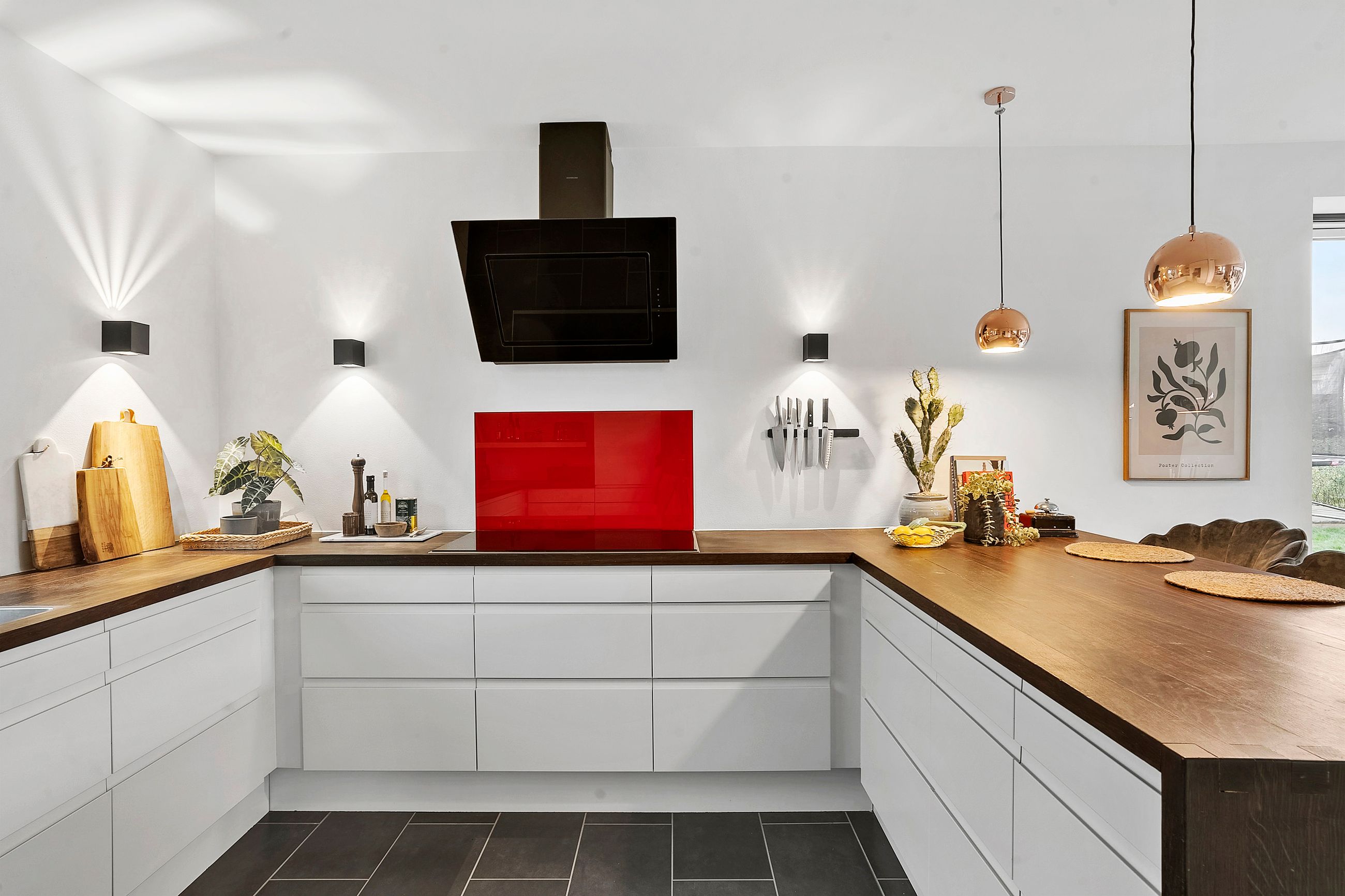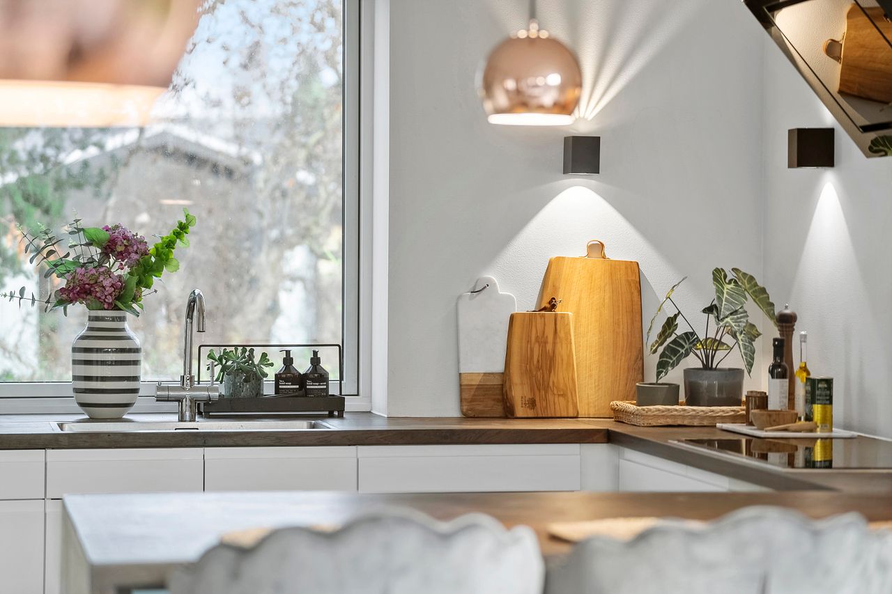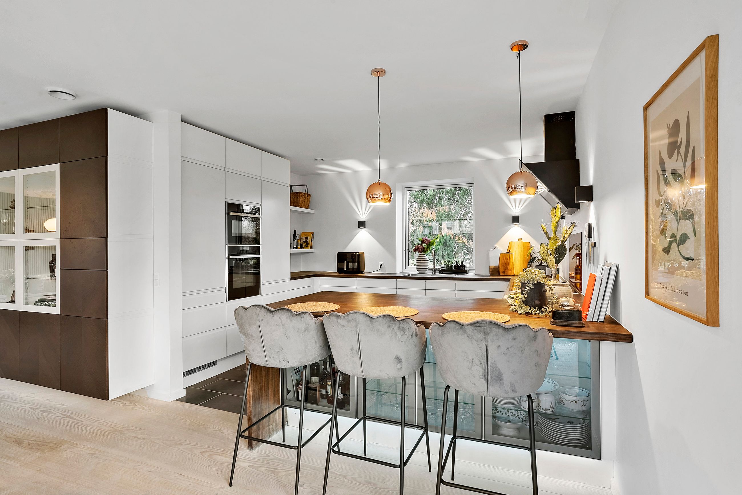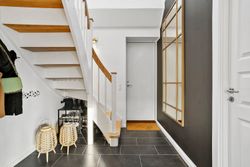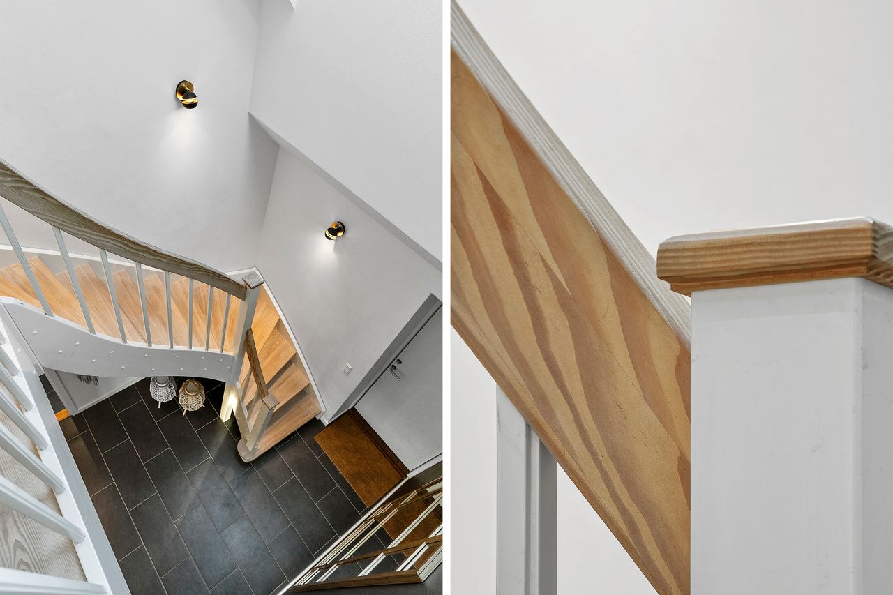 Når du træder ind i boligen, mødes du af en rummelig entré med imponerende 7 meter til loftet og synlige hanebånd, som giver en følelse af luftighed. Her er der god opbevaringsplads samt adgang til et praktisk bryggers. Boligen åbner sig hurtigt op mod det store, lyse køkken-alrum, hvor de massive 30 mm planke gulve i douglas fyr og den snedkerlavede bordplade i røget eg med fingertappede samlinger skaber en varm og tidløs atmosfære. De store vinduespartier giver et fantastisk lysindfald, og de to store foldedøre gør det muligt at udvide stue og have til ét sammenhængende rum.