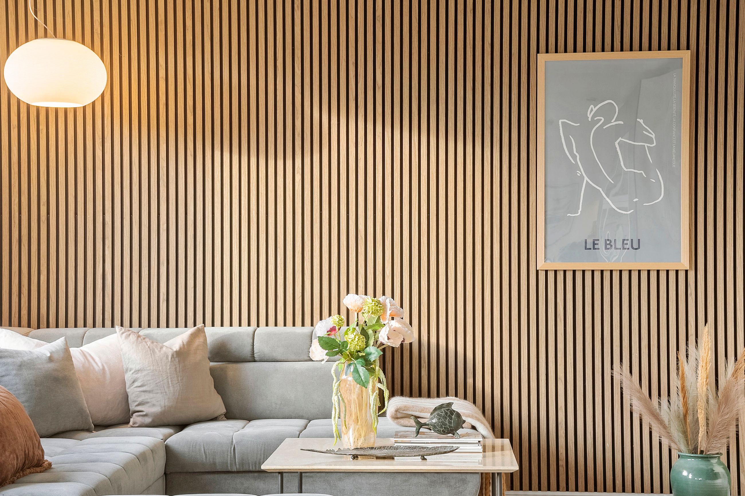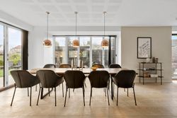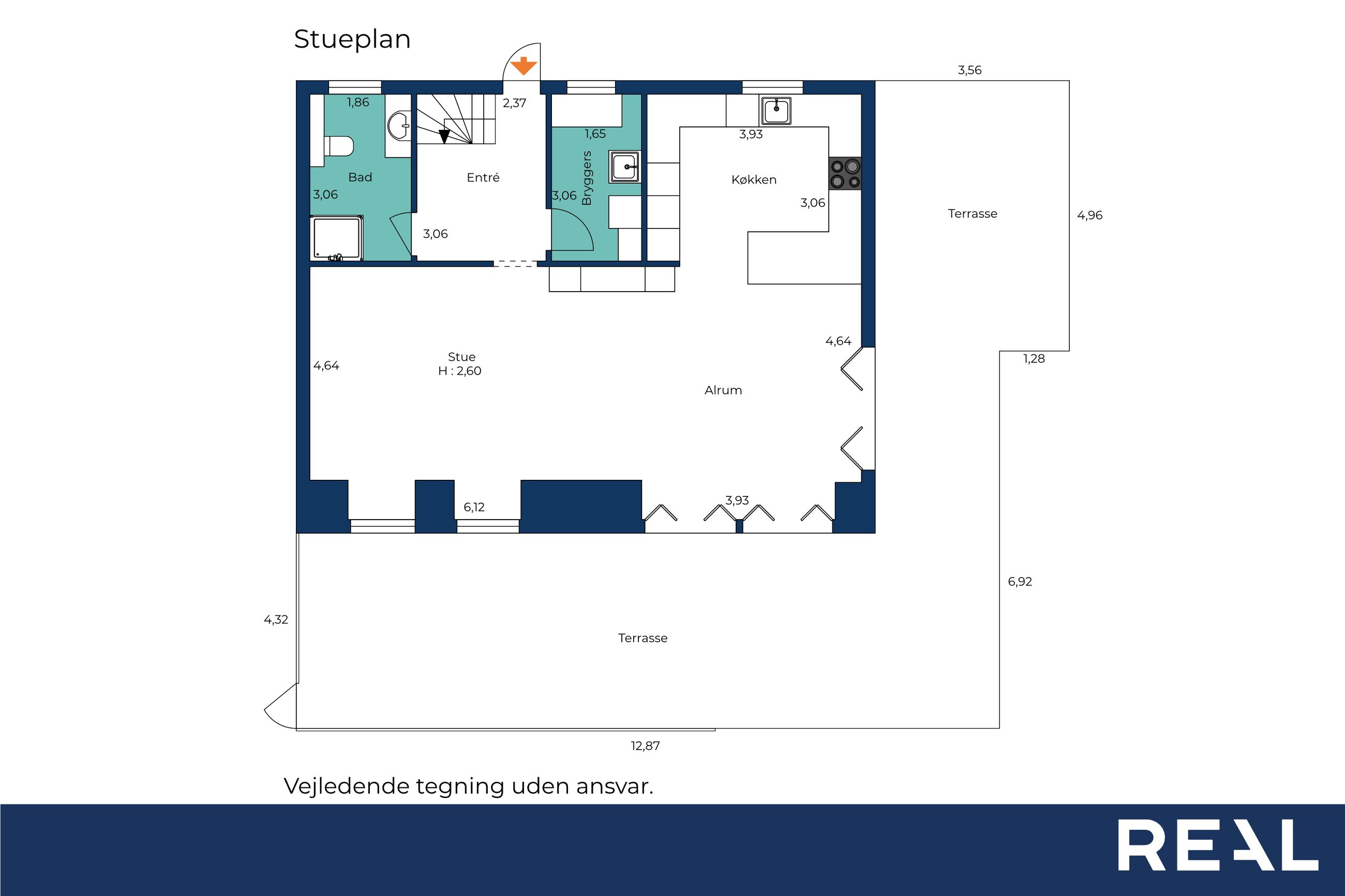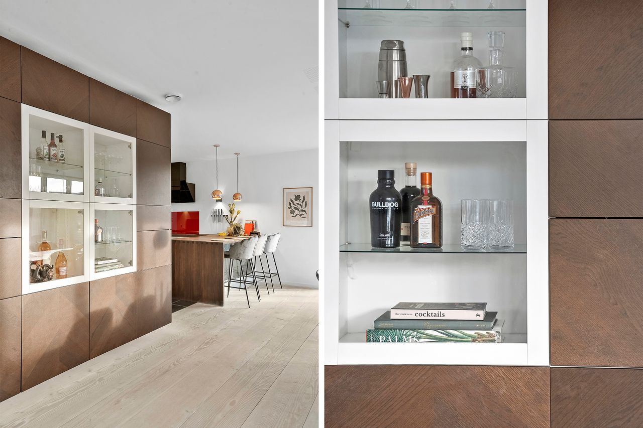 Når du træder ind i boligen, mødes du af en rummelig entré med imponerende 7 meter til loftet og synlige hanebånd, som giver en følelse af luftighed. Her er der god opbevaringsplads samt adgang til et praktisk bryggers. Boligen åbner sig hurtigt op mod det store, lyse køkken-alrum, hvor de massive 30 mm planke gulve i douglas fyr og den snedkerlavede bordplade i røget eg med fingertappede samlinger skaber en varm og tidløs atmosfære. De store vinduespartier giver et fantastisk lysindfald, og de to store foldedøre gør det muligt at udvide stue og have til ét sammenhængende rum.