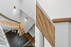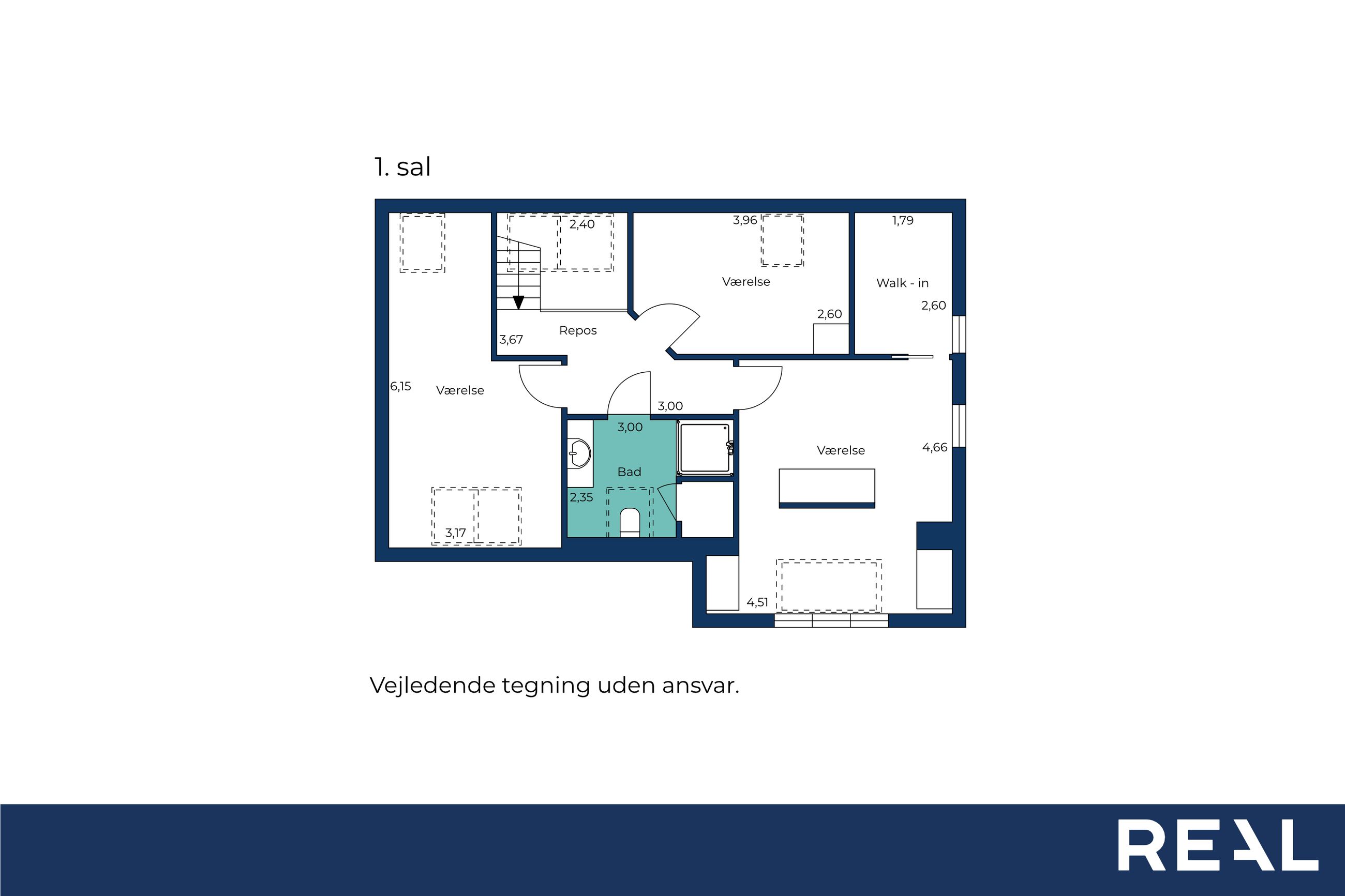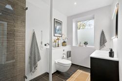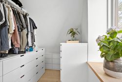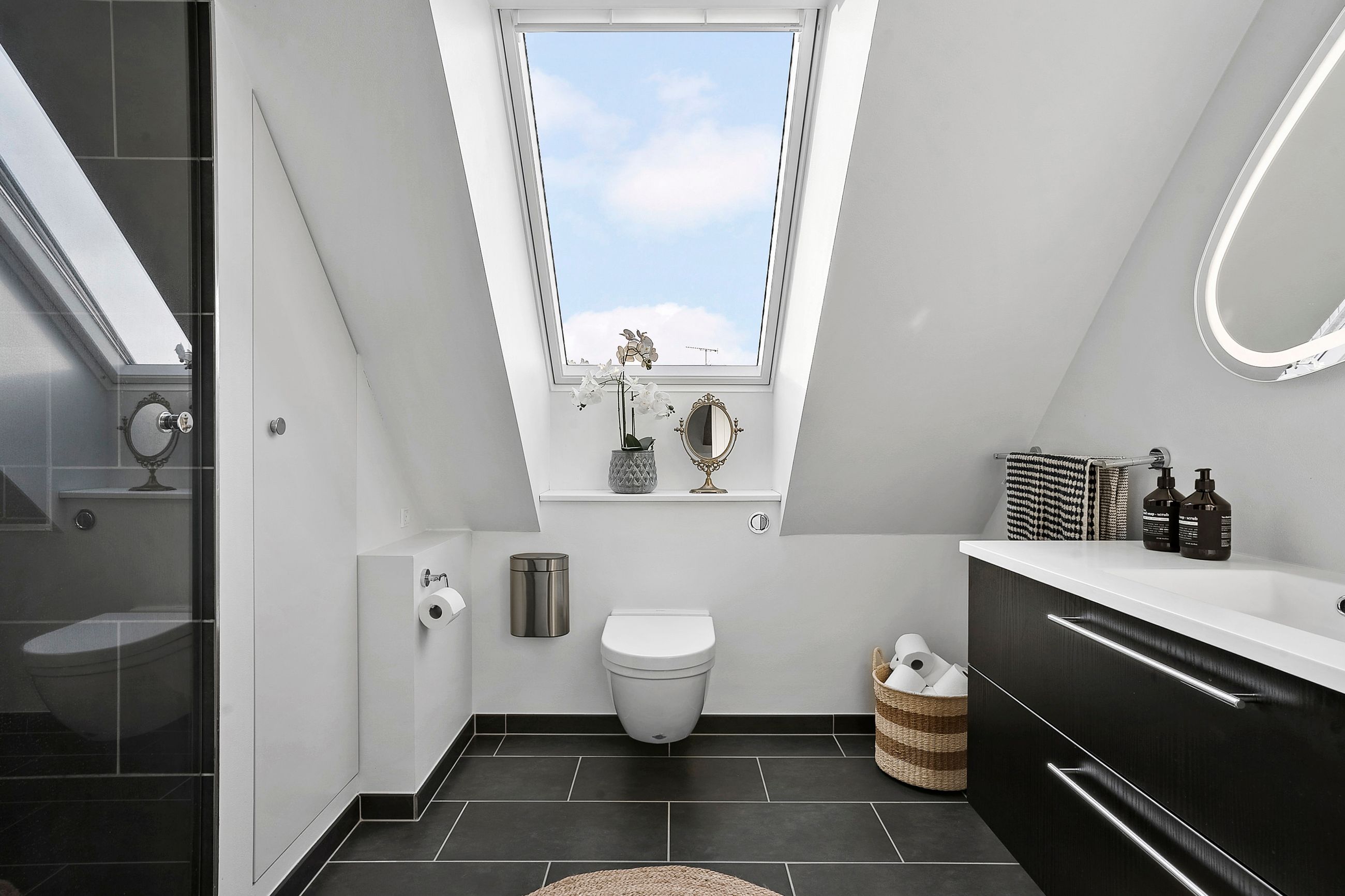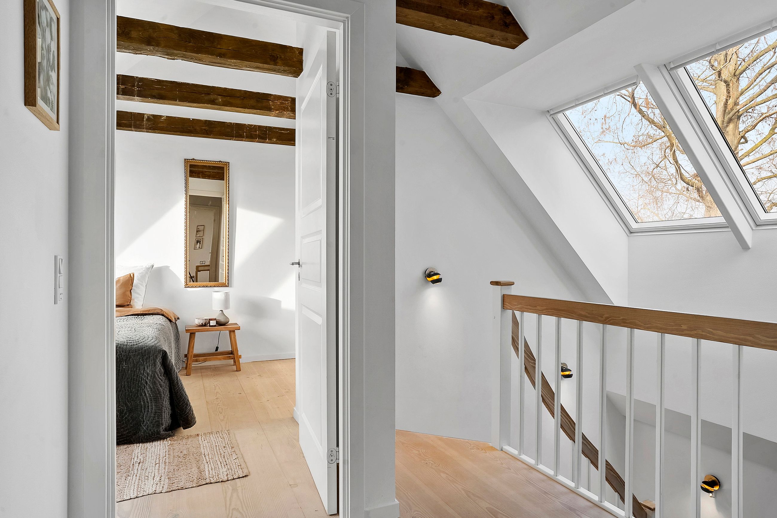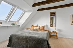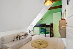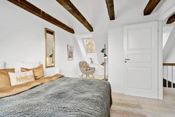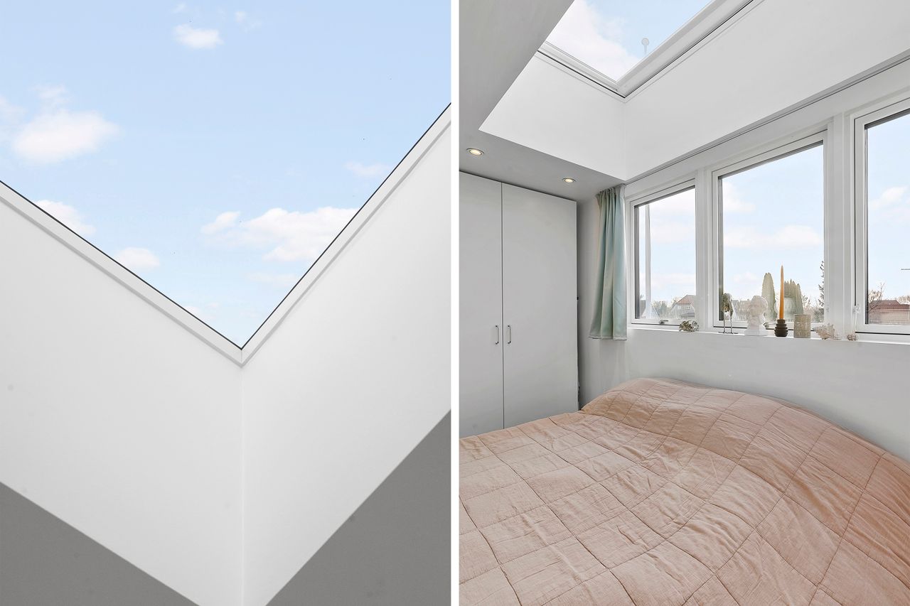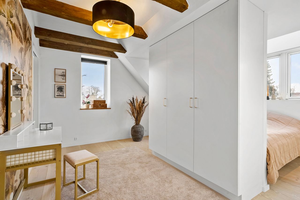 På første sal finder du tre store soveværelser med mulighed for op til fire værelser, alt efter behov. Master bedroom har walk-in closet, og et af de mest specielle træk ved denne bolig er det store ovenlysvindue på 1x2 meter, der giver et smukt kig til himlen, når du ligger i sengen. Et moderne badeværelse med stilrene materialer og god plads findes også på etagen.