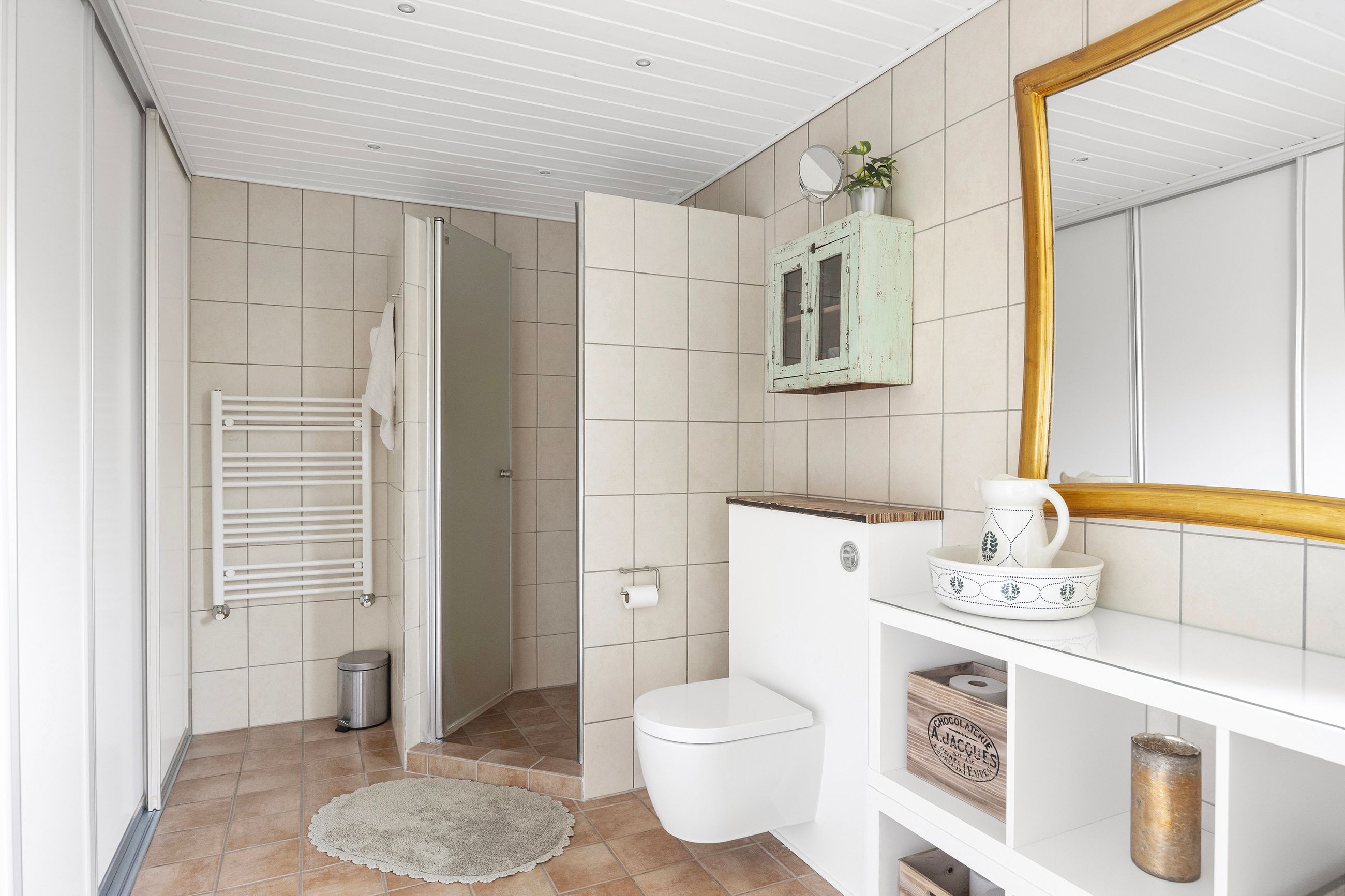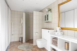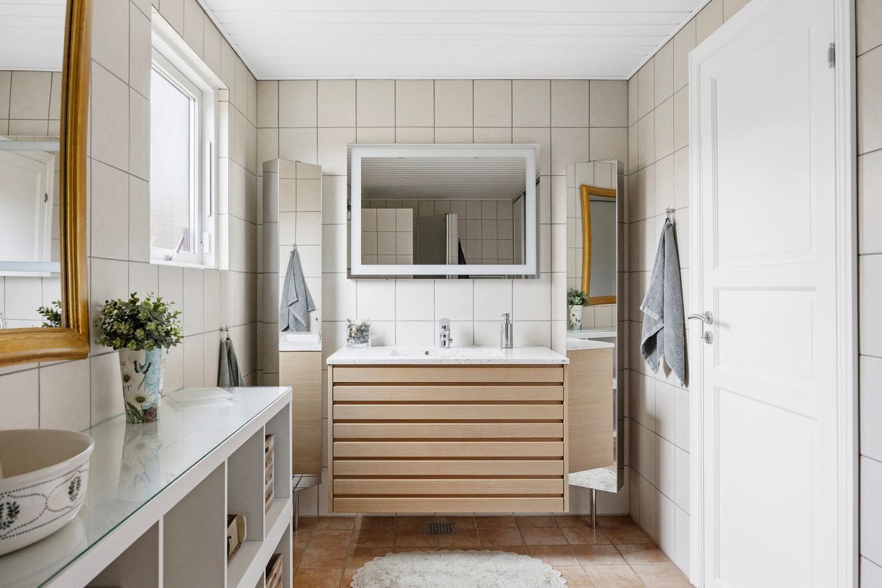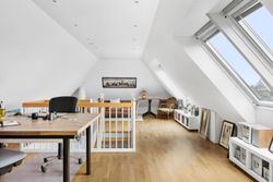Etagen rummer desuden et stort soveværelse samt et moderne badeværelse, som begge ligger praktisk placeret og bidrager til en funktionel hverdag.