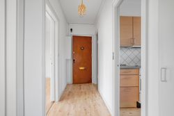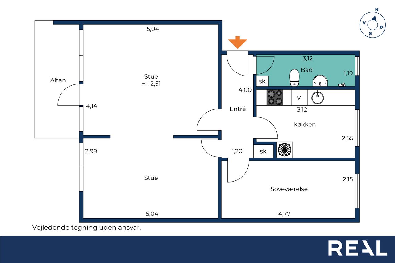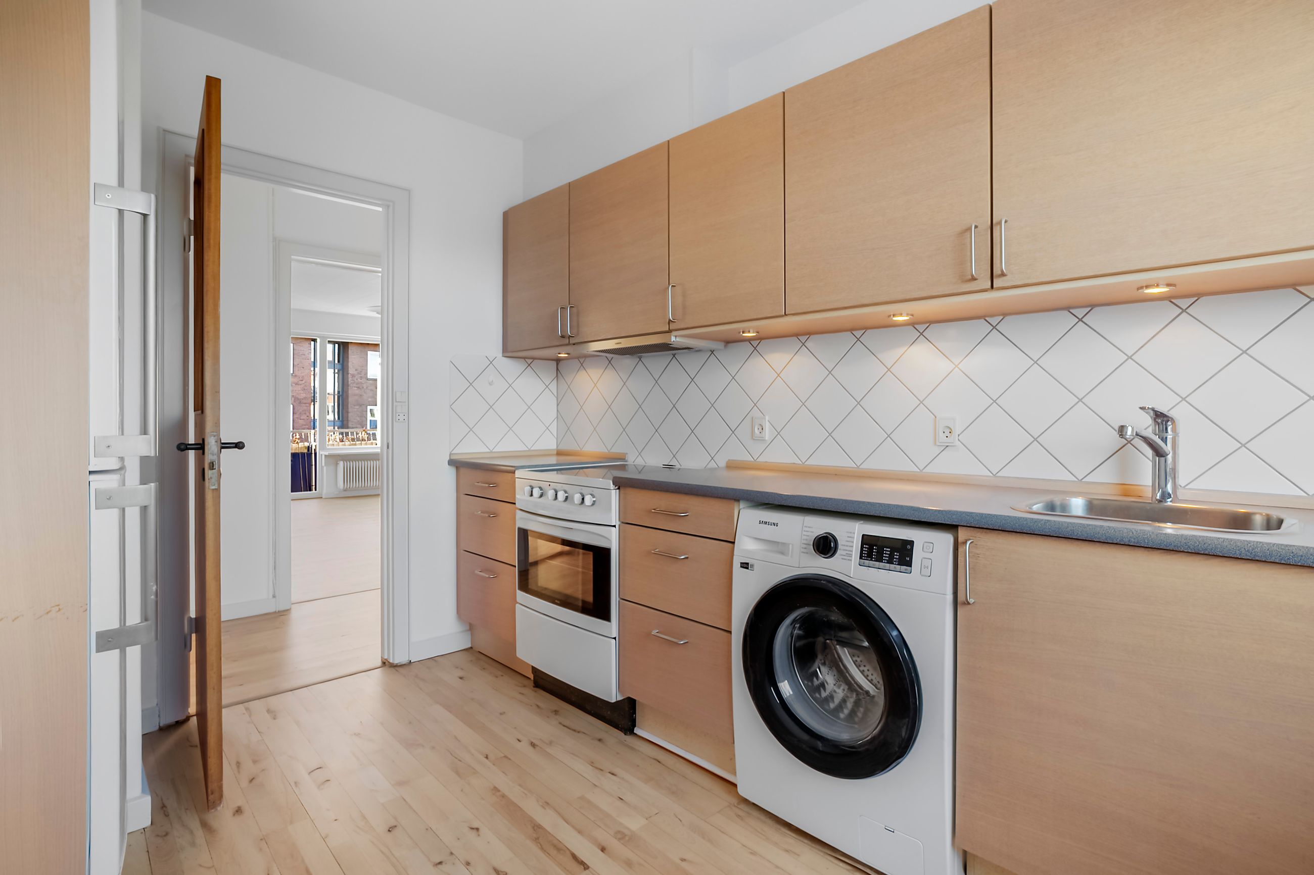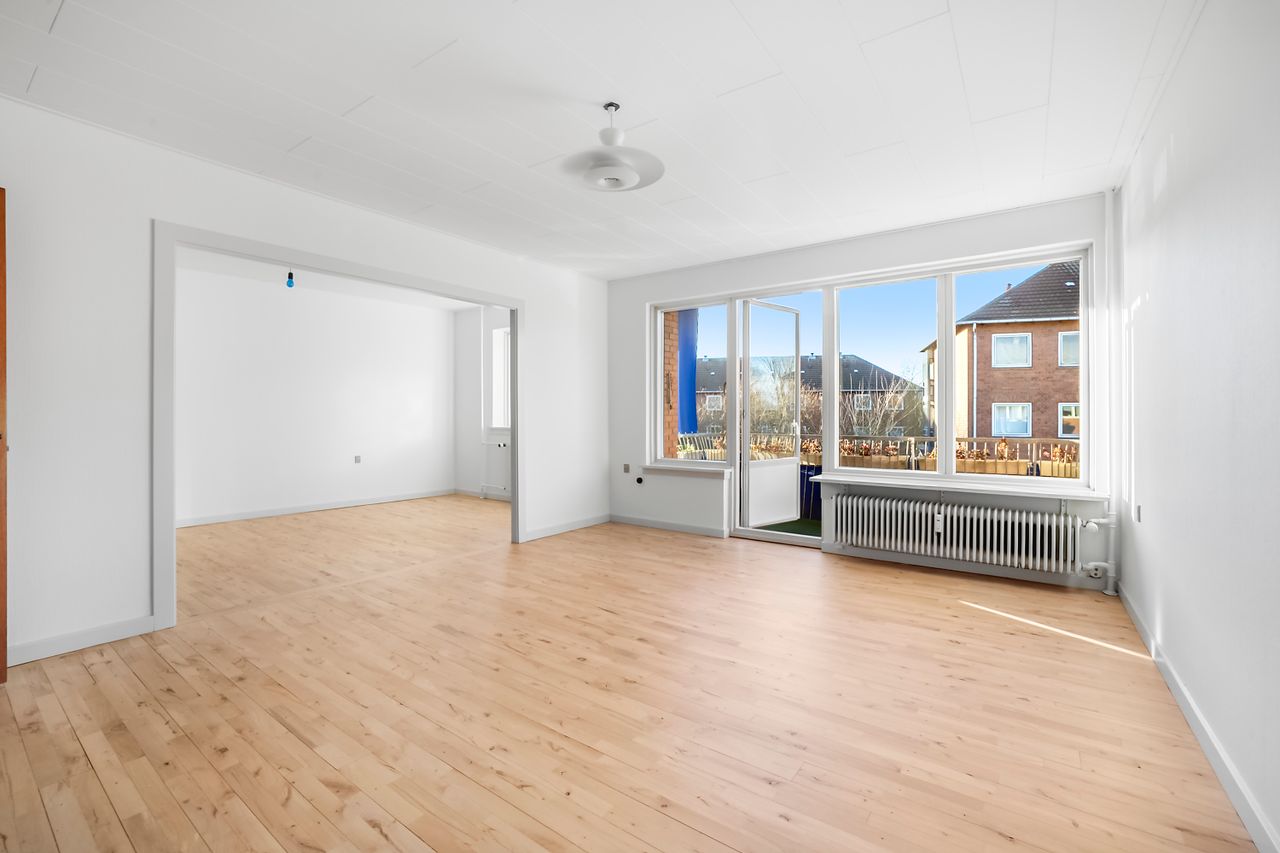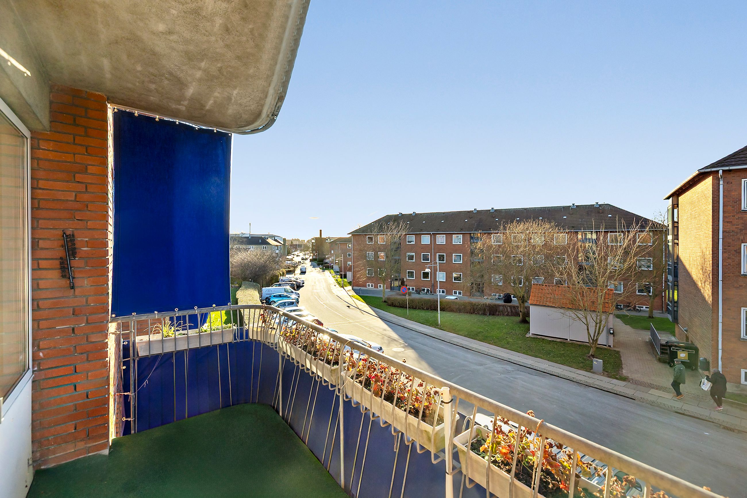 Fra opgangen træder du ind i en rummelig entré med garderobe og adgang til et velholdt elementkøkken med spiseplads, en dejlig stor opholdsstue med et flot parketgulv samt udgang til en stor sydvestvendt altan. Herudover et stort soveværelse, som pt. er sammenlagt med opholdsstuen. (Kan nemt reetableres som værelse) Fra entreen er der endvidere adgang til et velholdt badeværelse med terazzogulv og brusebad samt indbygget skab. Endvidere endnu et værelse eller evt. et hjemmekontor.