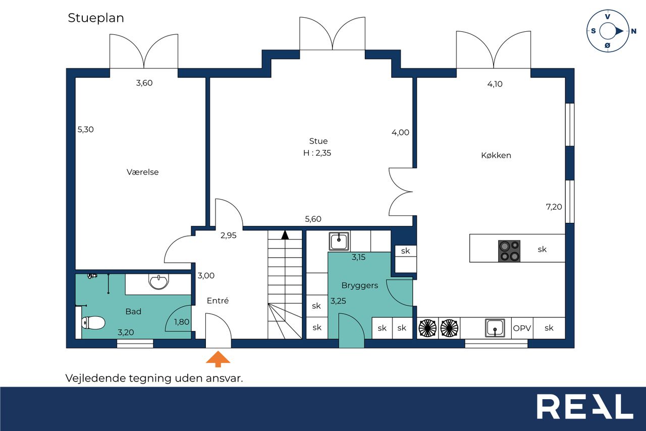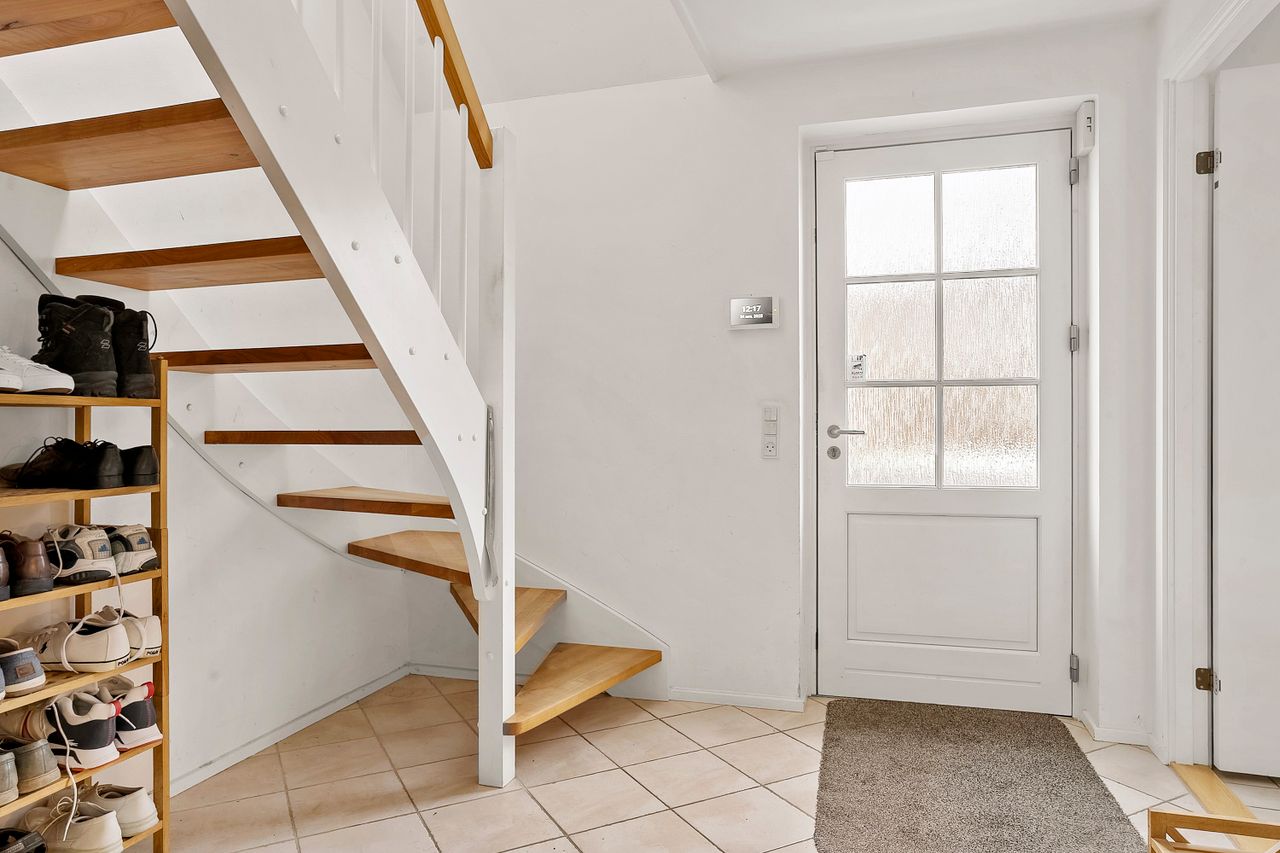 Huset indeholder: stor hall med trappe til 1. sal og adgang til lyst gæstebadeværelse. Stort arbejdsværelse. Stor opholdsstue og kæmpe spisestue i åben forbindelse med køkken. Fra køkkenet adgang til stort bryggers.