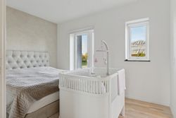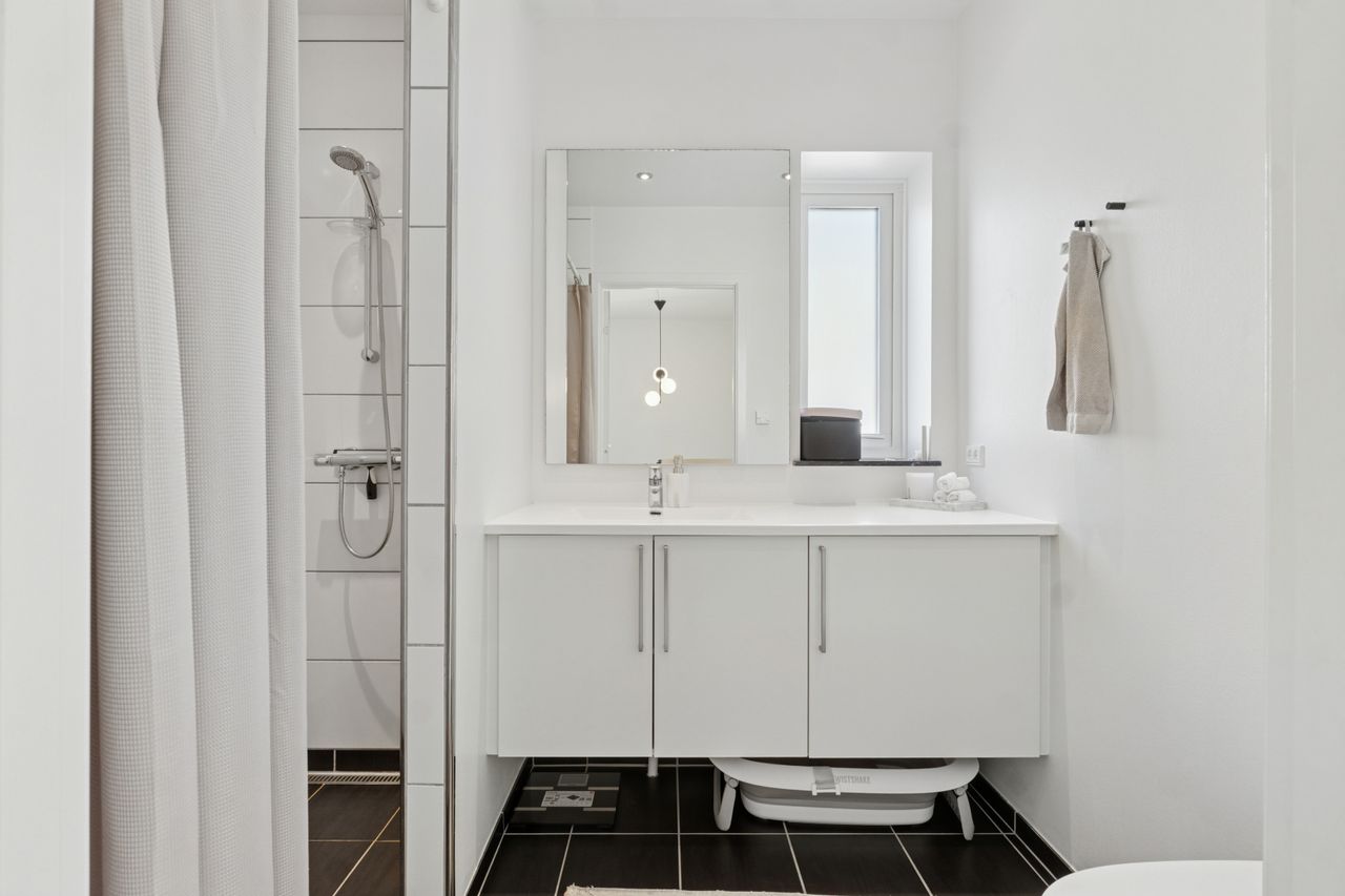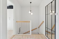 På første sal finder du en veludnyttet repos, der fordeler rummene mellem to gode børneværelser og et rummeligt soveværelse, der sammen med et elegant udført badeværelse, komplet med hvide vægge og mørke fliser, fuldender hjemmets indbydende atmosfære.