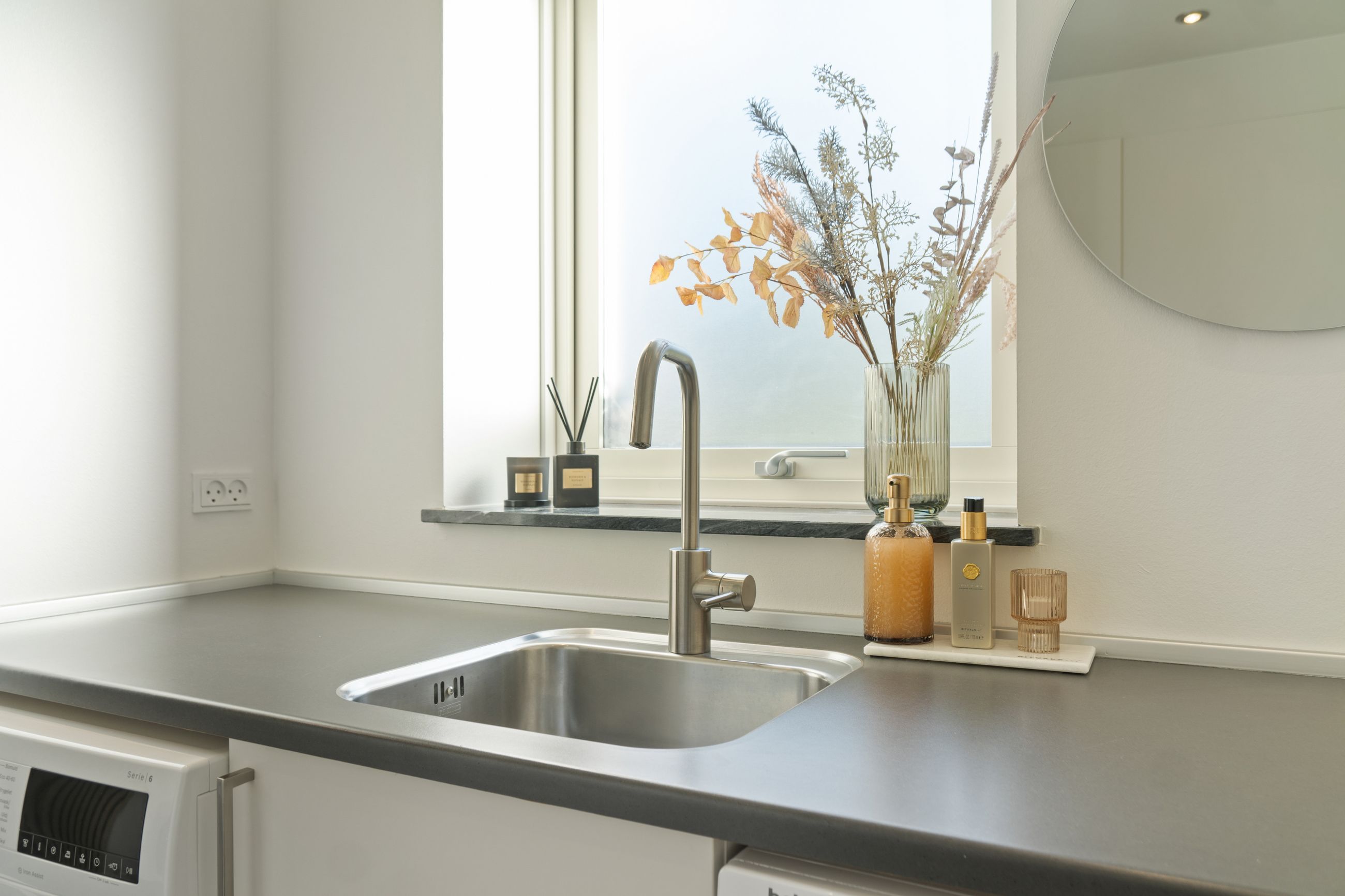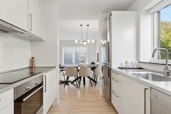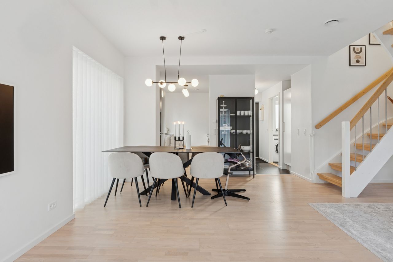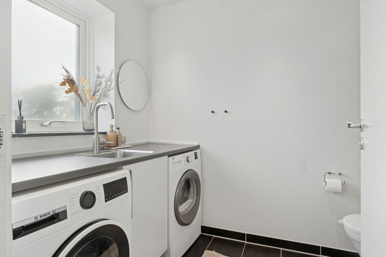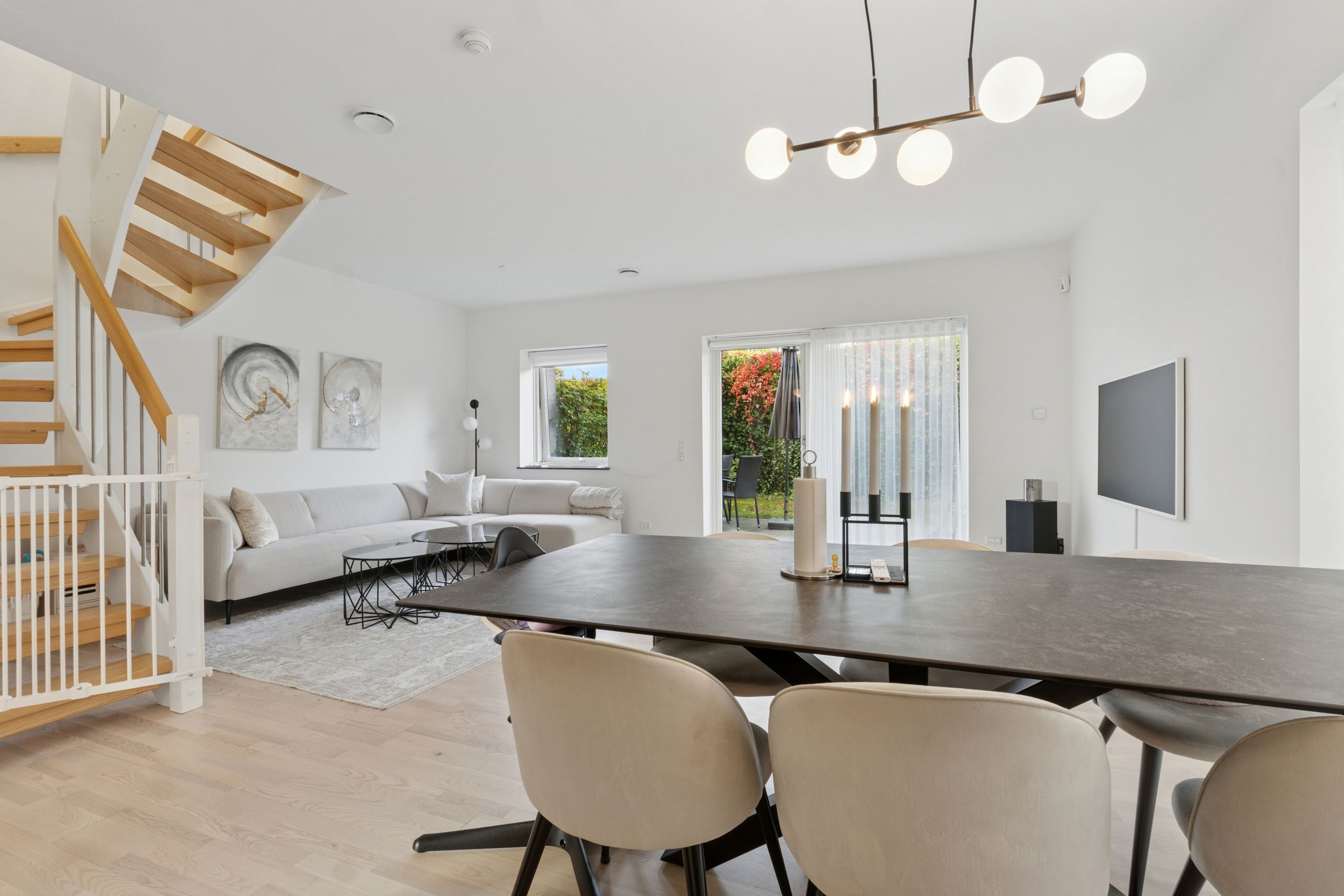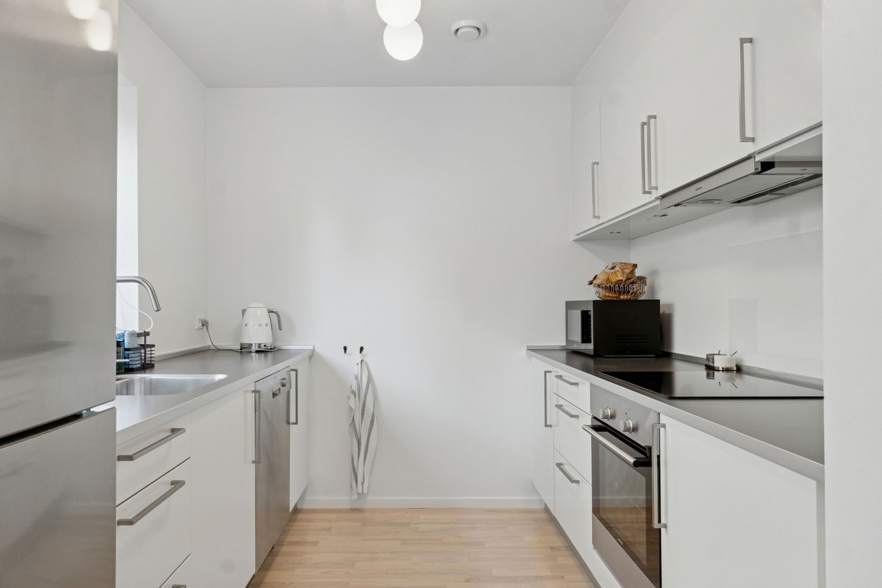 Køkkenet, i et åbent forhold til stuen, præsenterer sig i et stilrent, hvidt design, som understøtter både det æstetiske og funktionelle aspekt af familielivet.