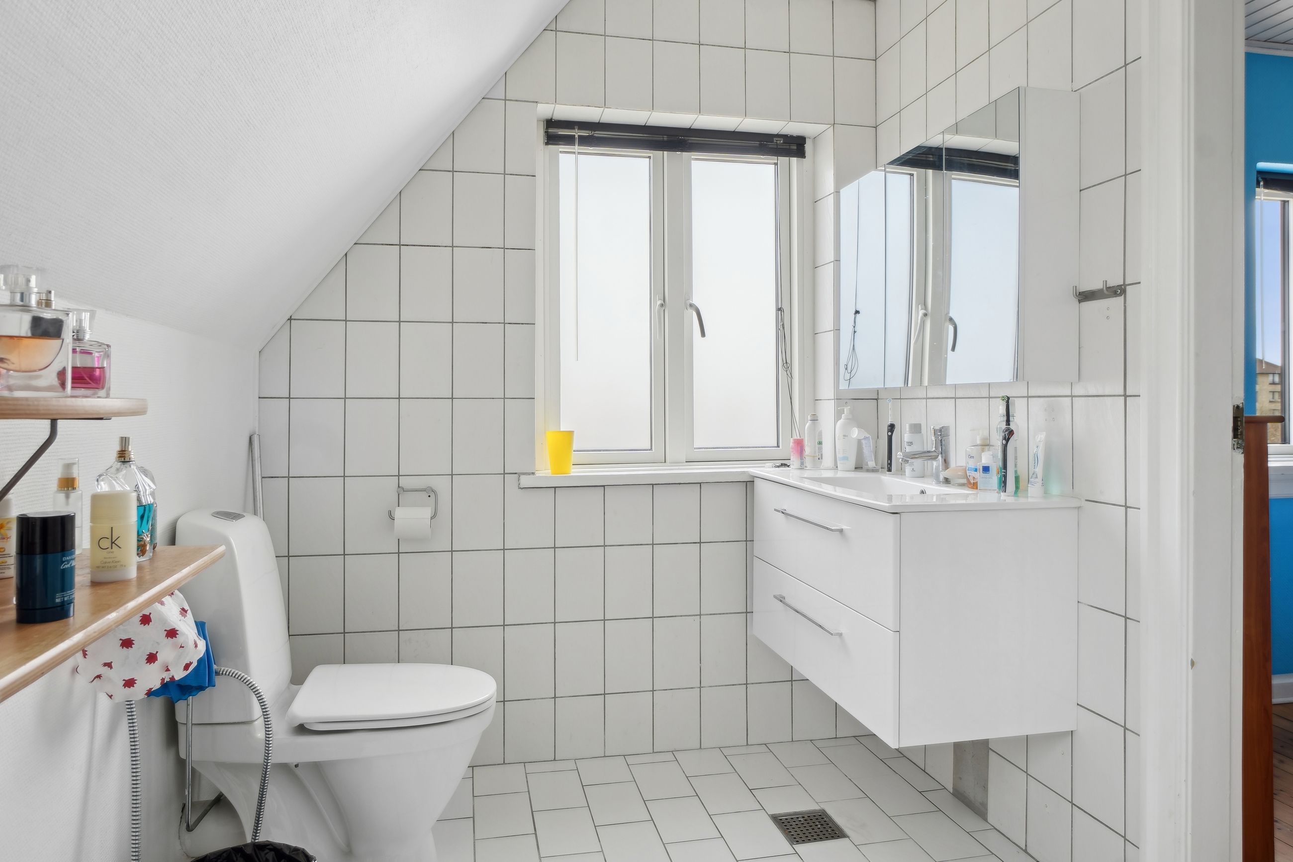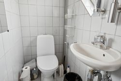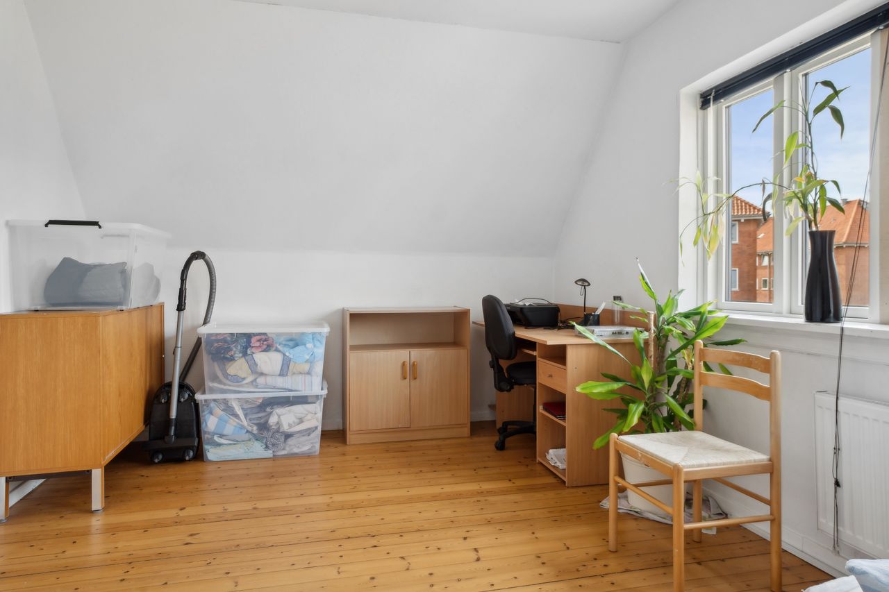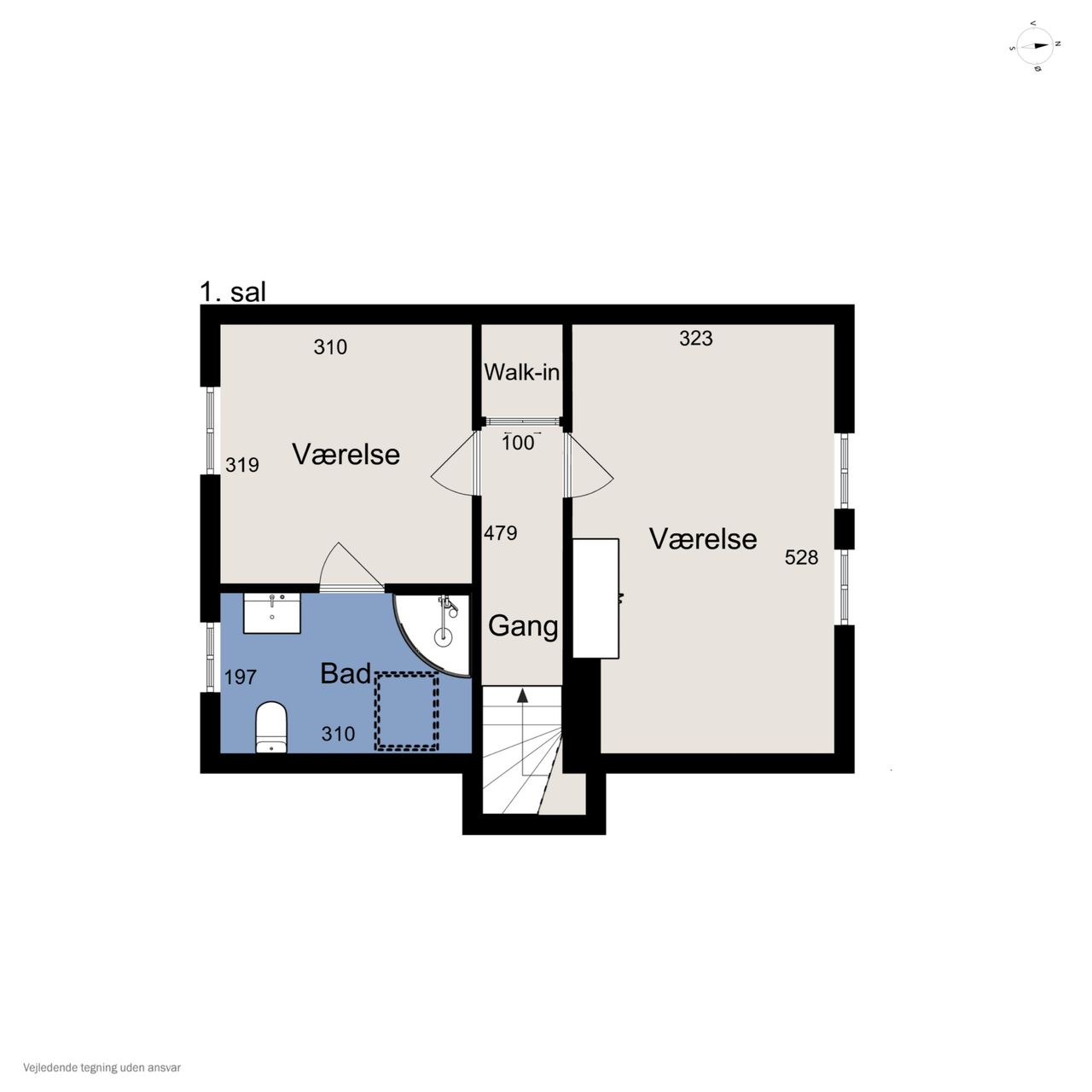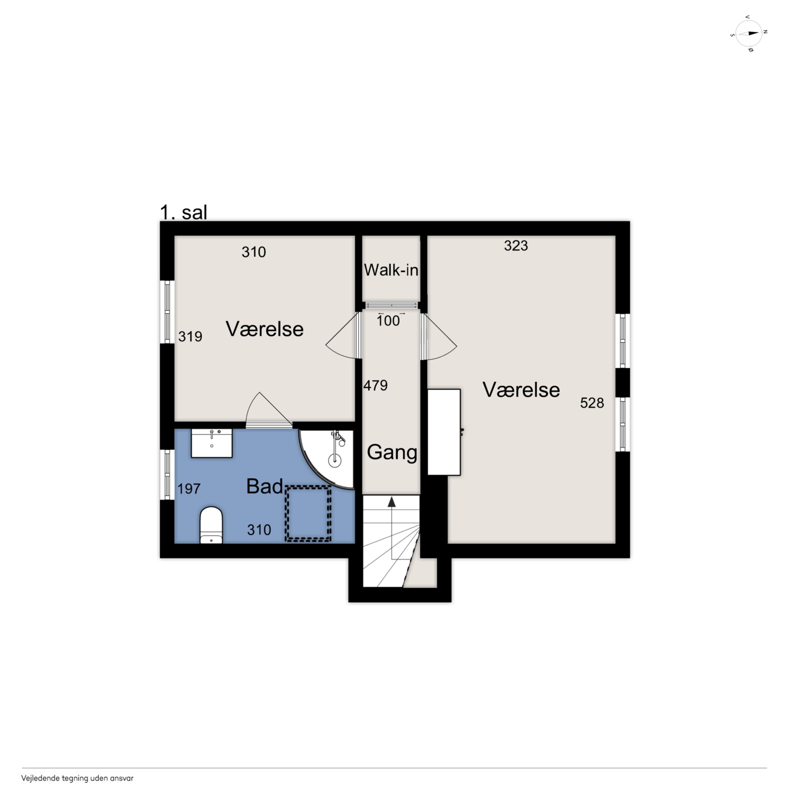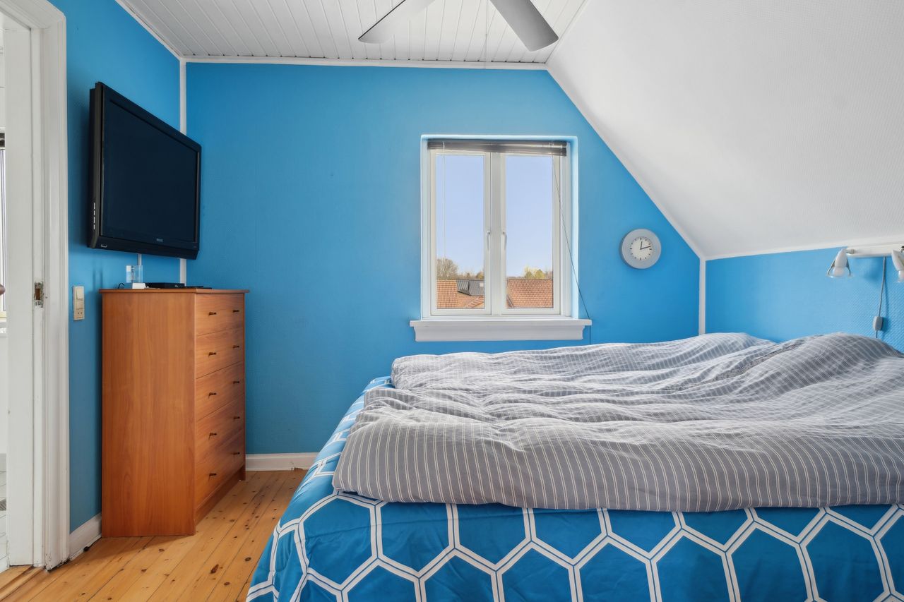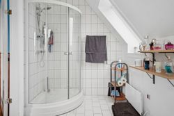 1. sal: Repos med adgang til et soveværelse og 2 børneværelser (pt. sammenlagt) samt et nydeligt brusebadeværelse med hvide fliser.