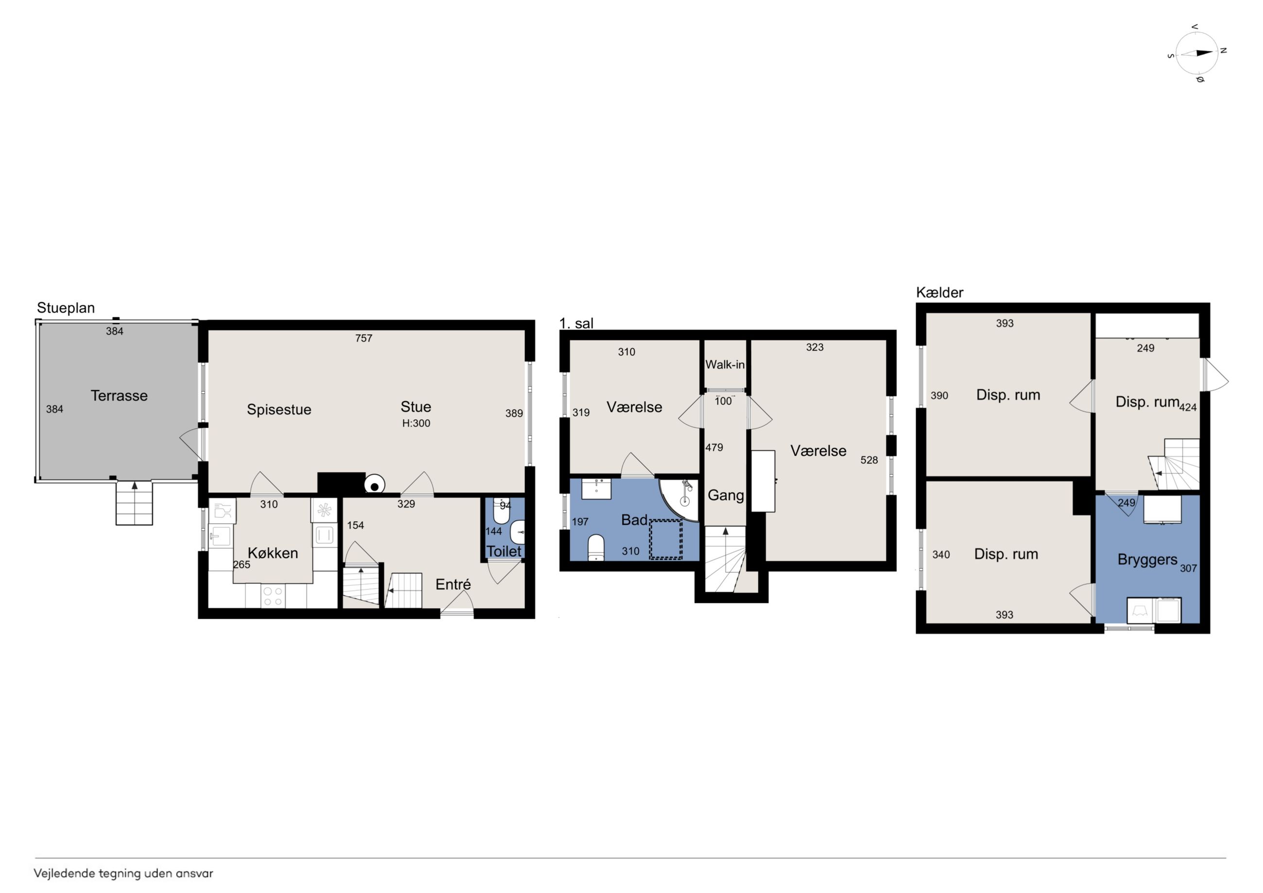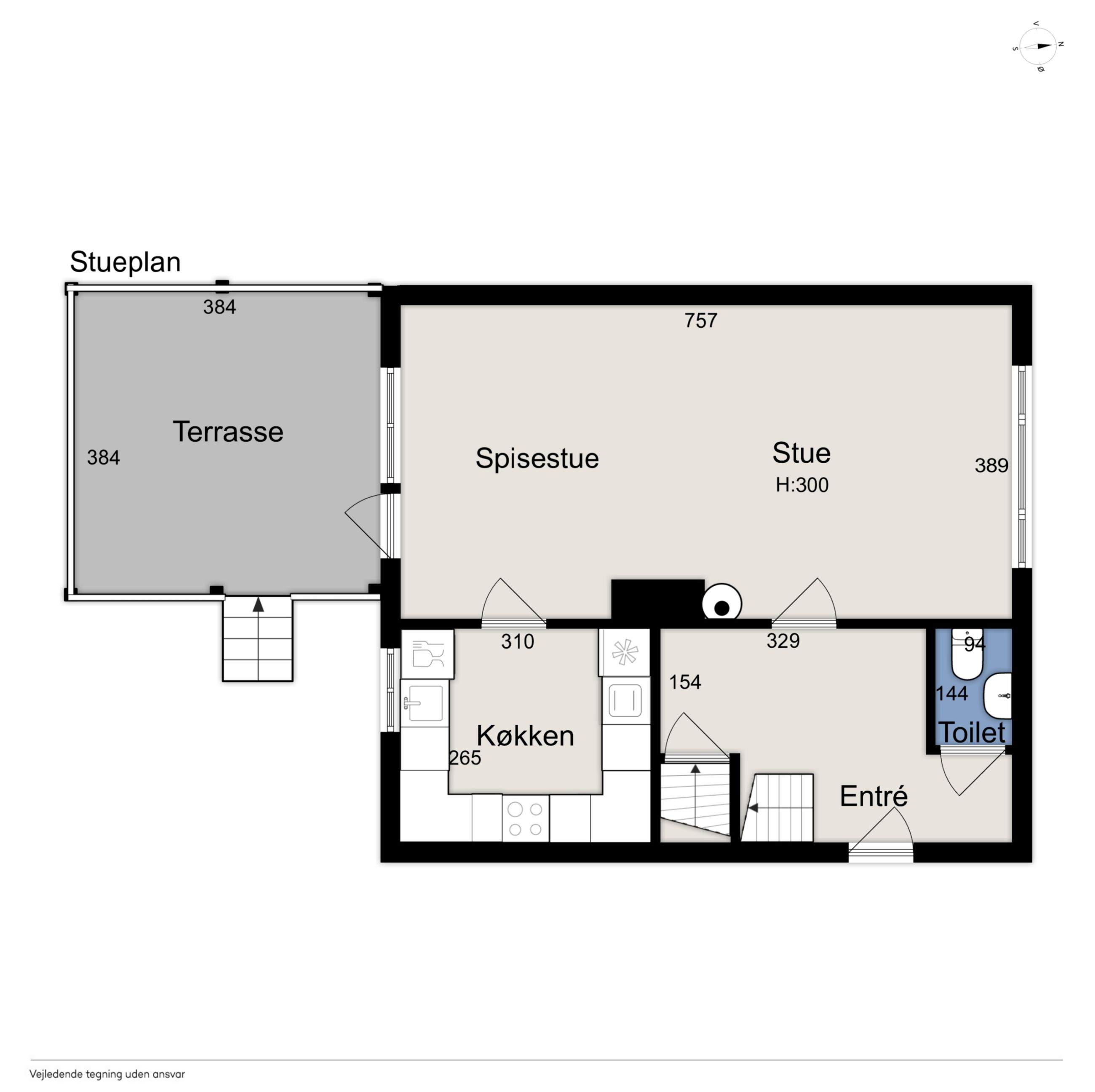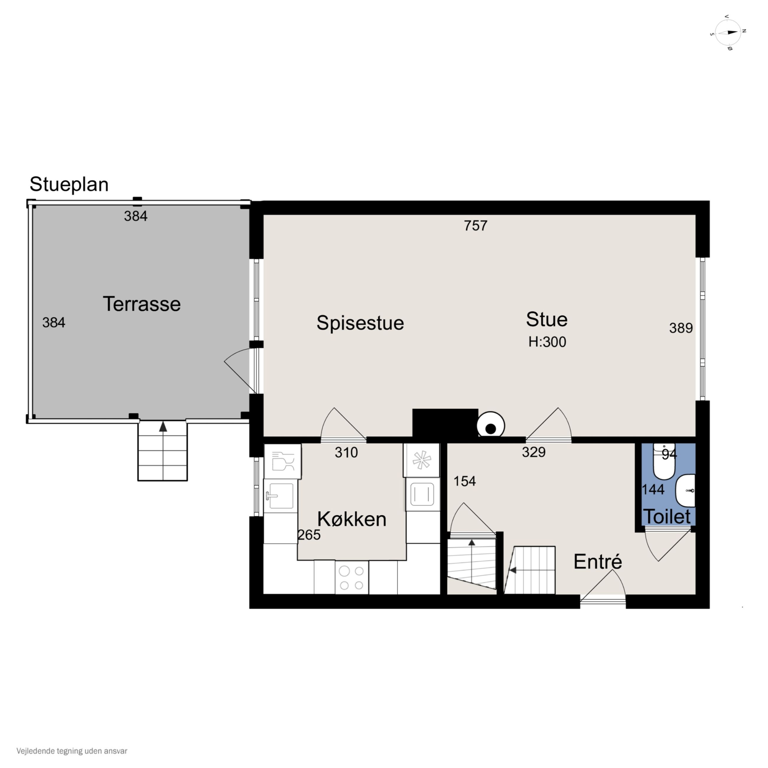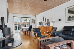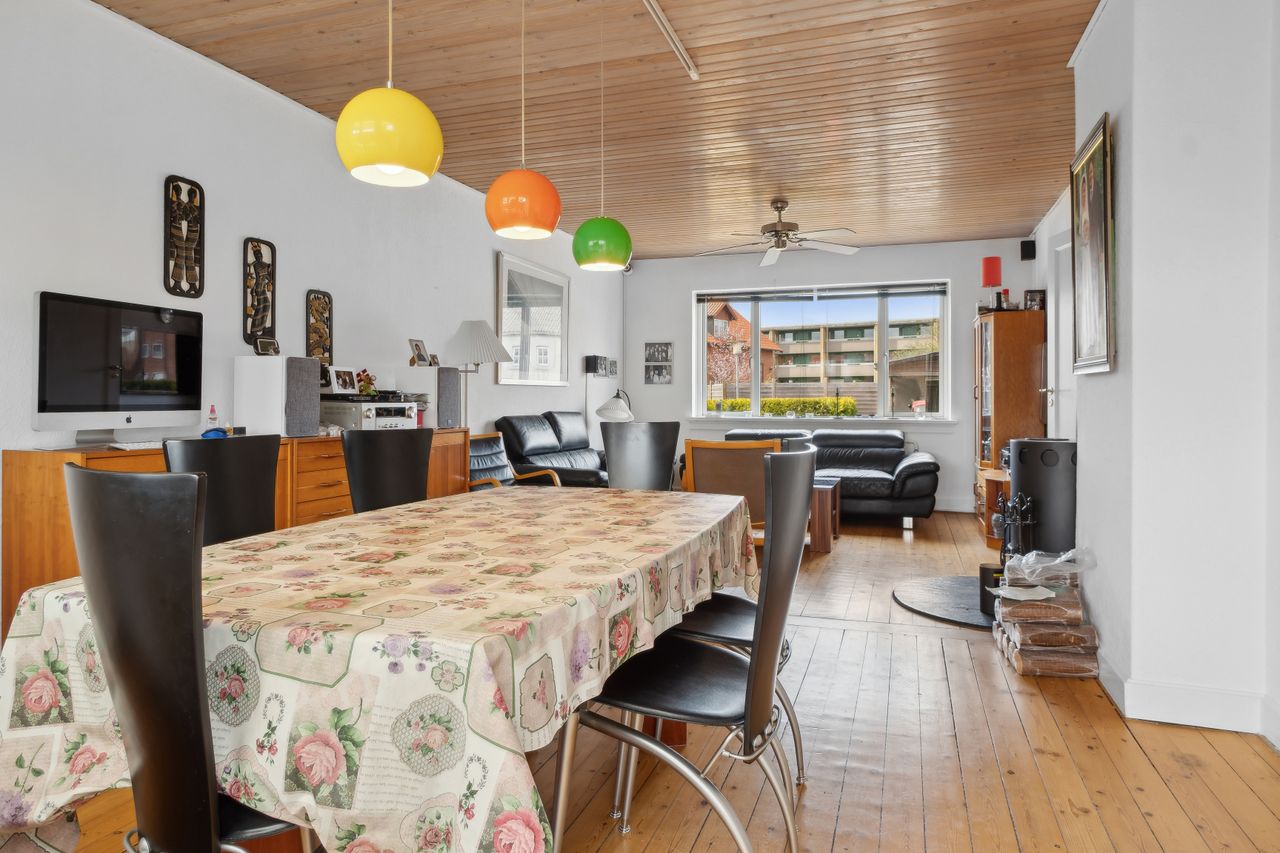 Stueplan: Her finder du en rummelig entré med adgang til et gæstetoilet med hvide fliser samt med trappe til 1. sal og til kælderen. Fra entreen træder du ind i 2 skønne stuer ensuite med plankegulve og i åben forbindelse til et nydeligt køkken med hvide låger og skuffer. Fra opholds- og spisestuen er der endvidere udgang til en stor opbygget og overdækket terrasse.
