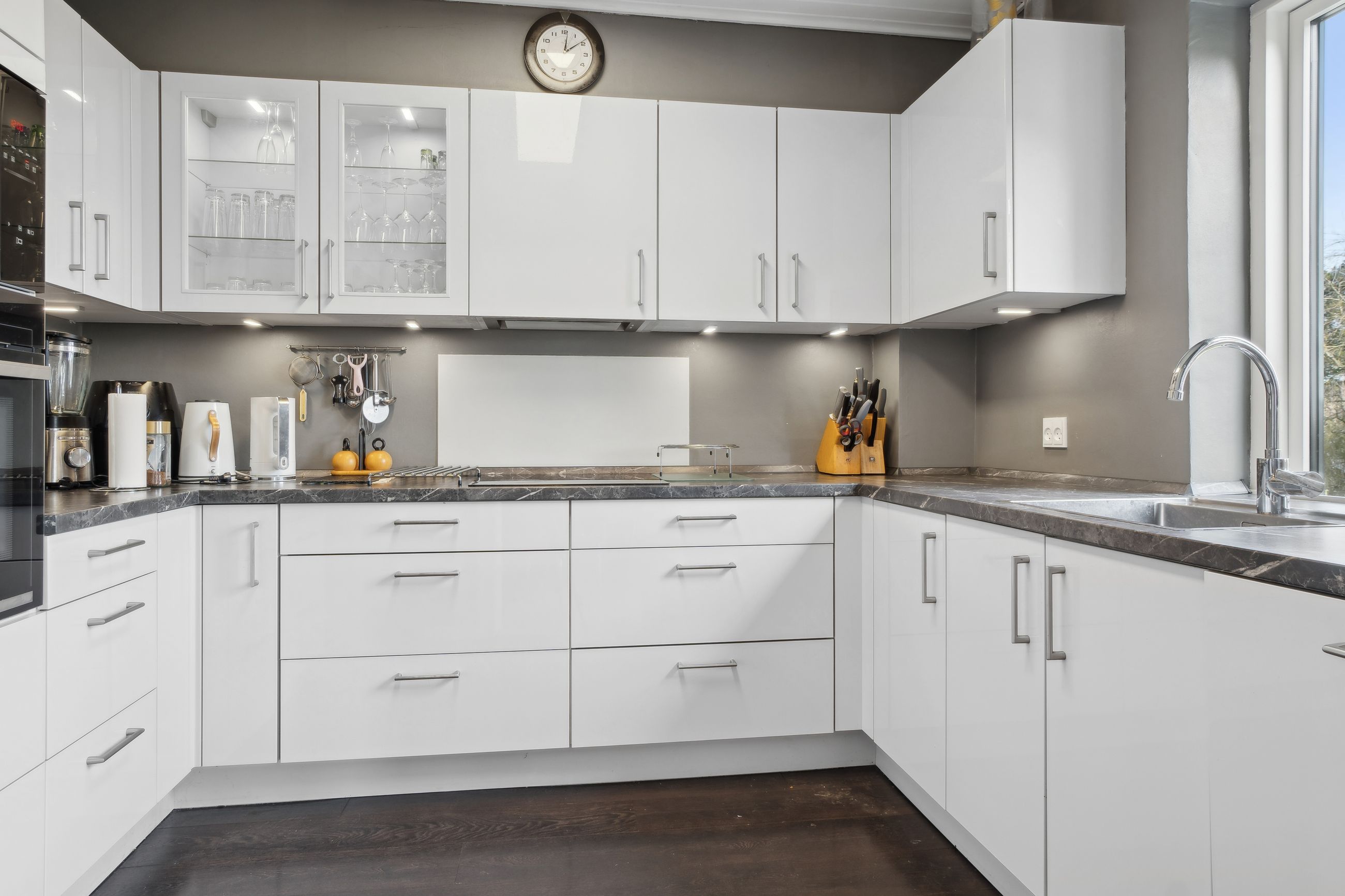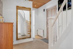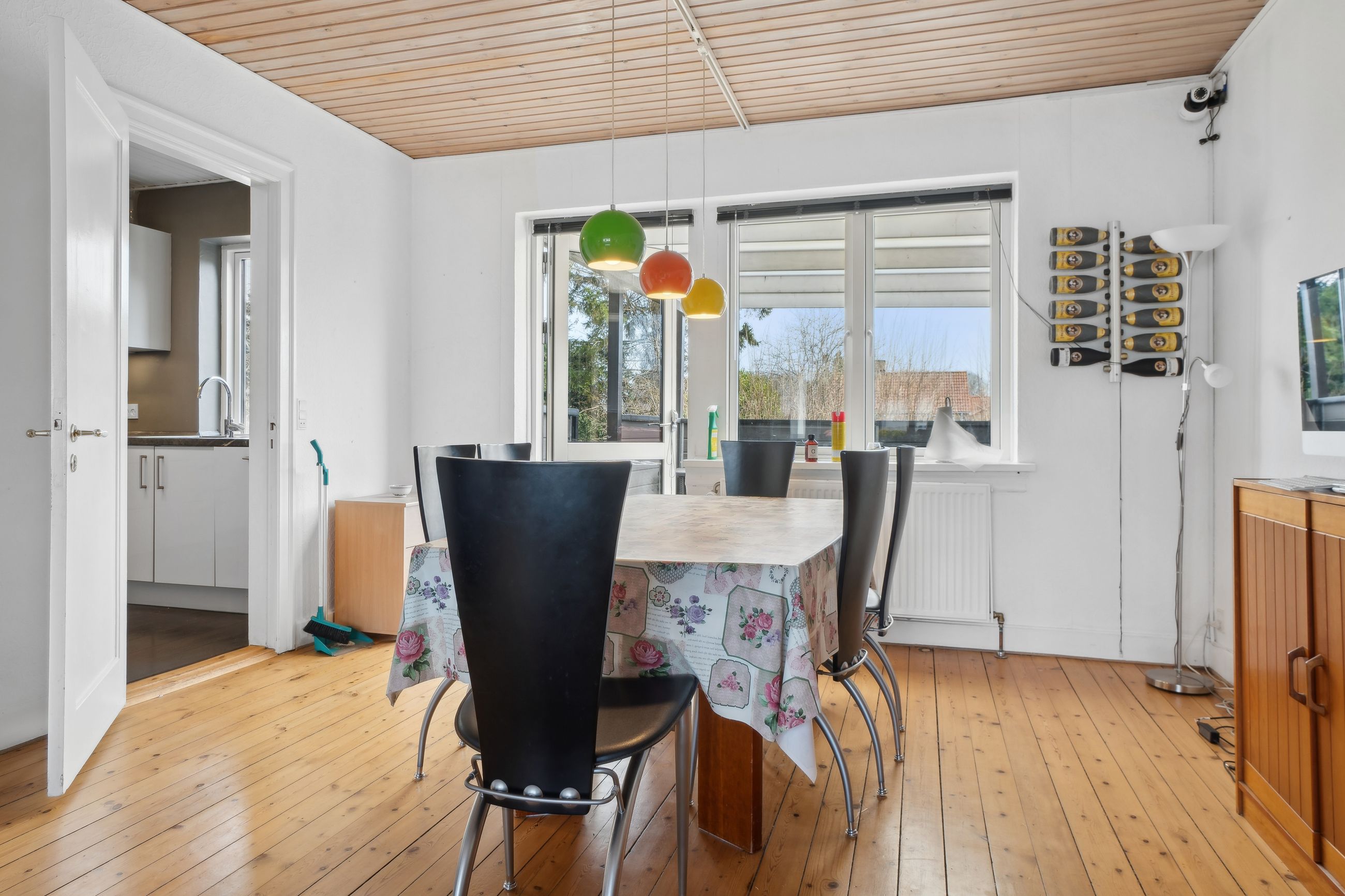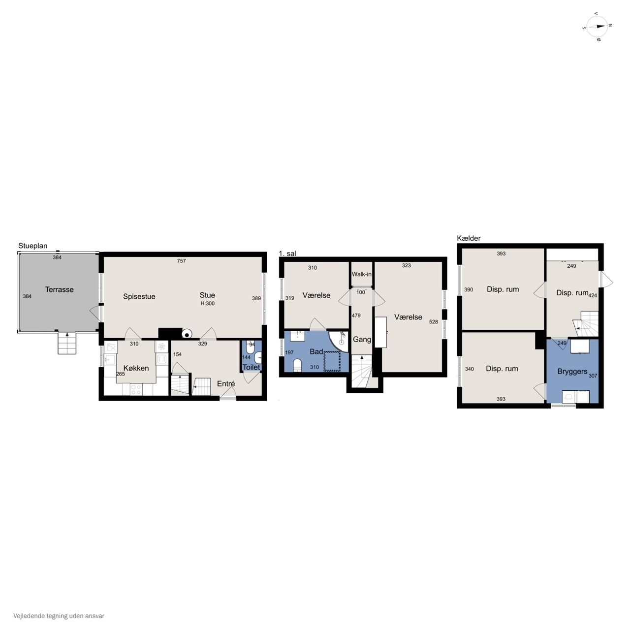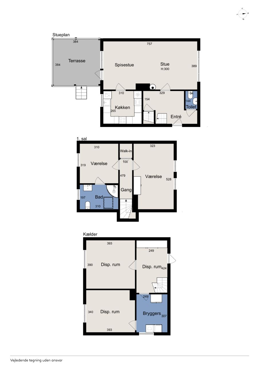 Stueplan: Her finder du en rummelig entré med adgang til et gæstetoilet med hvide fliser samt med trappe til 1. sal og til kælderen. Fra entreen træder du ind i 2 skønne stuer ensuite med plankegulve og i åben forbindelse til et nydeligt køkken med hvide låger og skuffer. Fra opholds- og spisestuen er der endvidere udgang til en stor opbygget og overdækket terrasse.