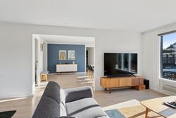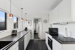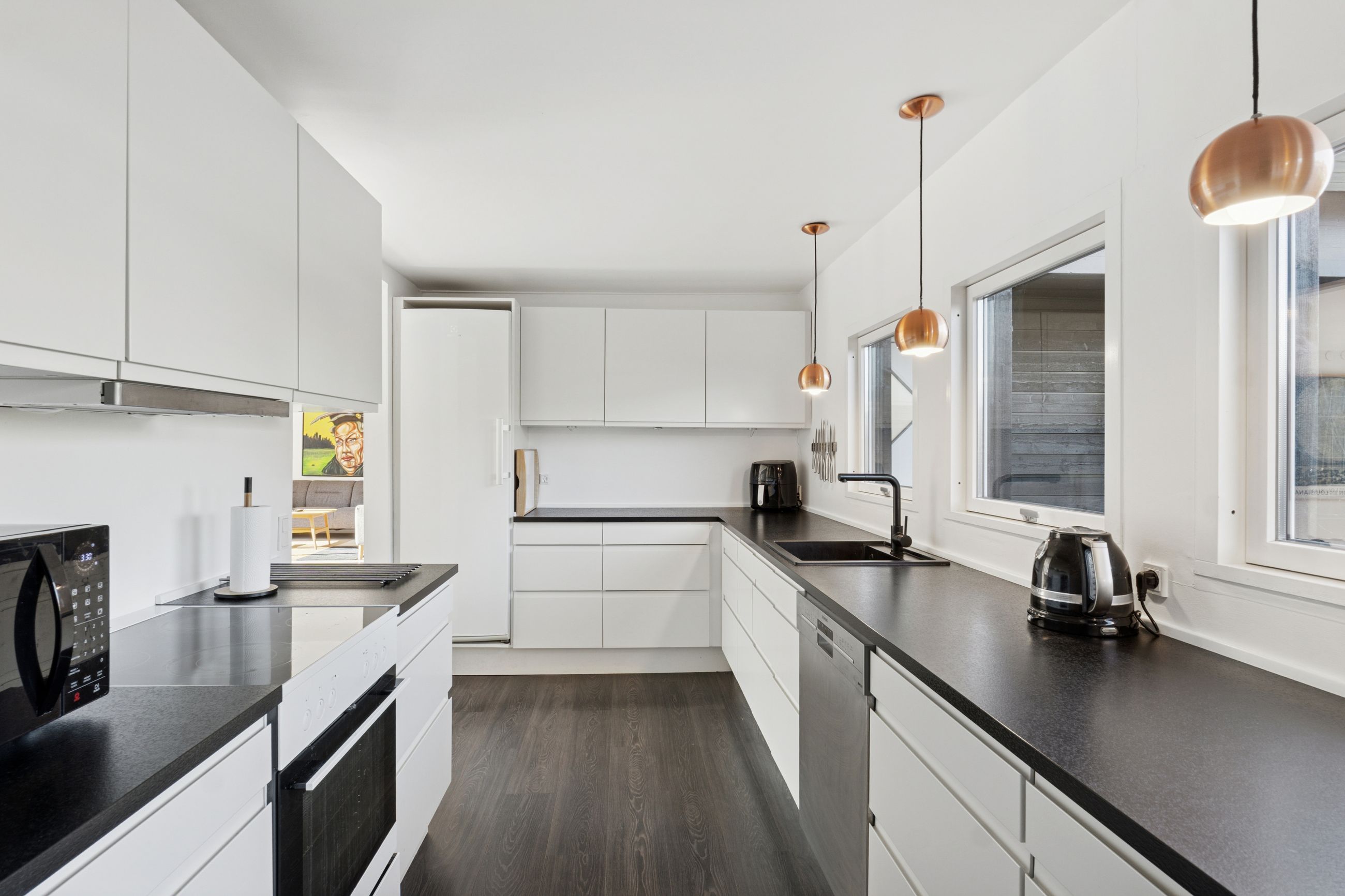 Køkkenet fremstår moderne og tidløst med hvide fronter, mørke bordplader og elegante lamper, der tilfører varme og stil. Det lange bordforløb giver masser af arbejdsplads, og her er alt, hvad der skal til for at gøre madlavningen til en fornøjelse.