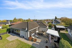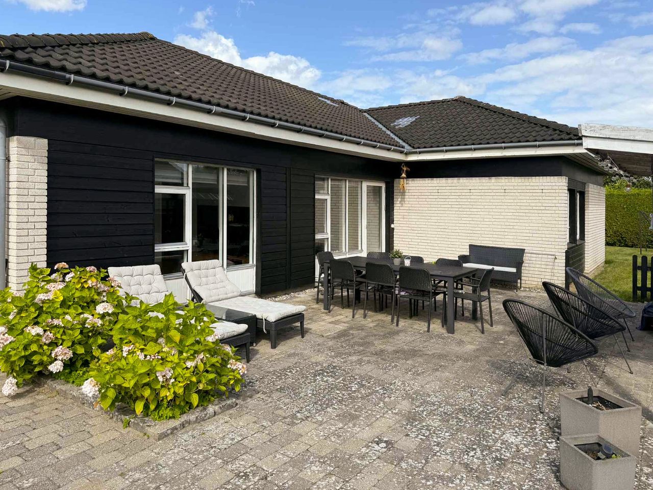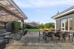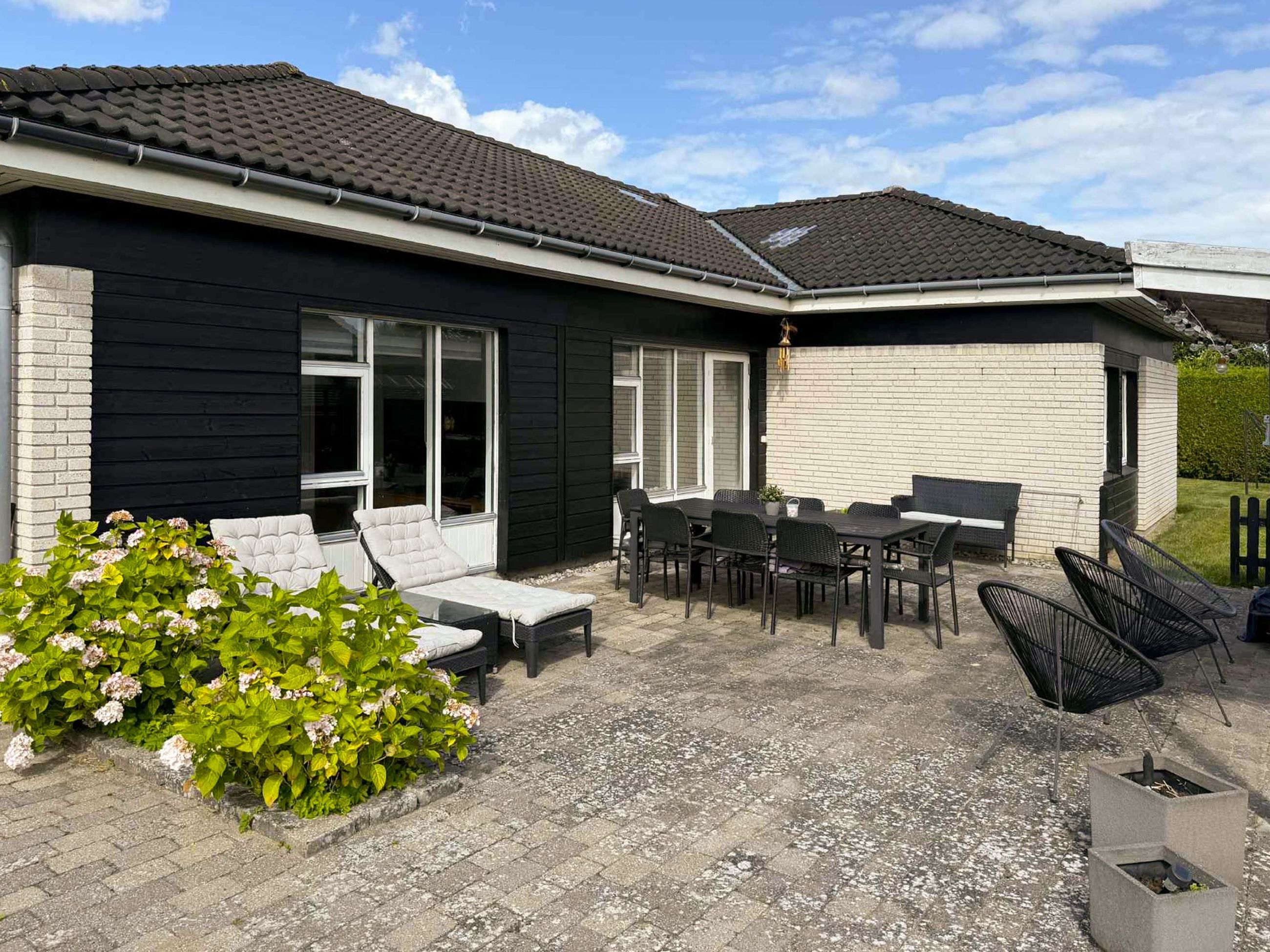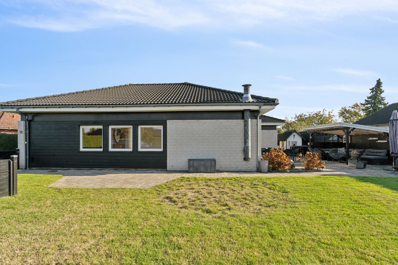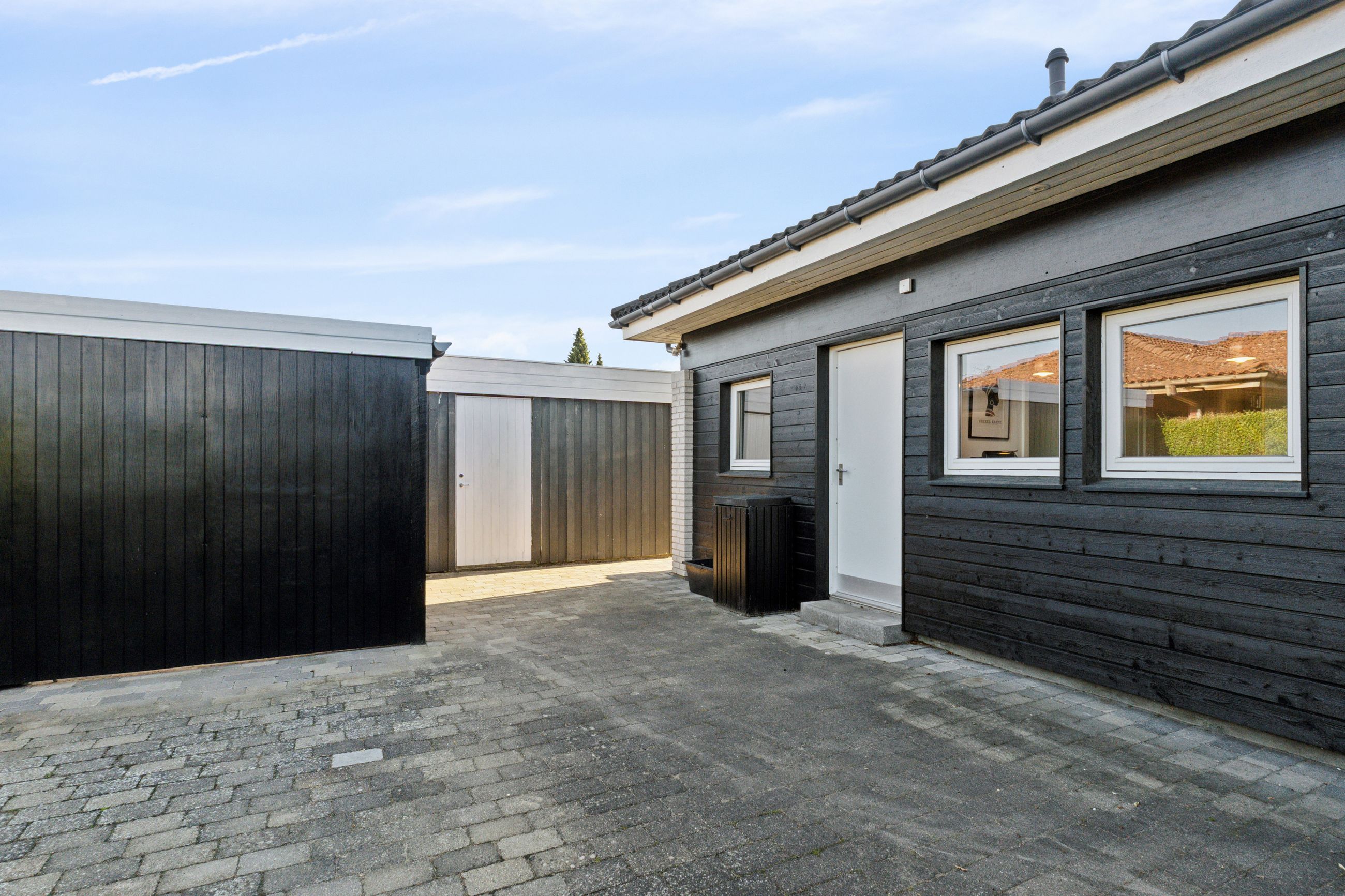 Fra alrummet er der udgang til en stor, solrig terrasse med både overdækket og åben del – det ideelle sted til sommerens grillaftener og afslappede stunder. Haven er overskuelig og nem at holde, med god plads til leg og afslapning.