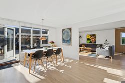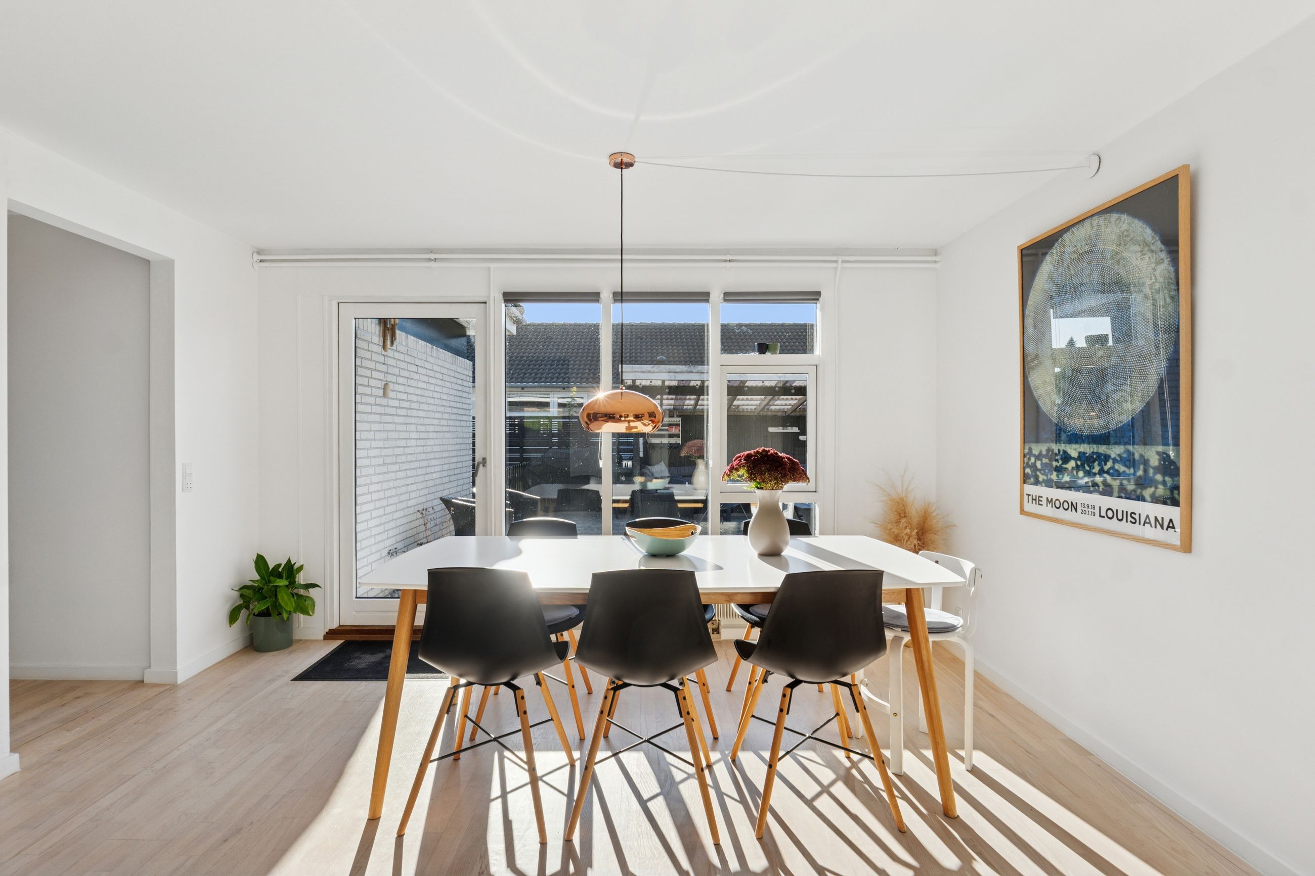 Boligens hjerte er det store og lyse alrum, hvor køkken, spiseafdeling og stue flyder naturligt sammen. Her er plads til både hverdagens måltider og hyggelige stunder med gæster. De store vinduespartier sørger for et fantastisk lysindfald og skaber en harmonisk forbindelse til terrassen og haven.