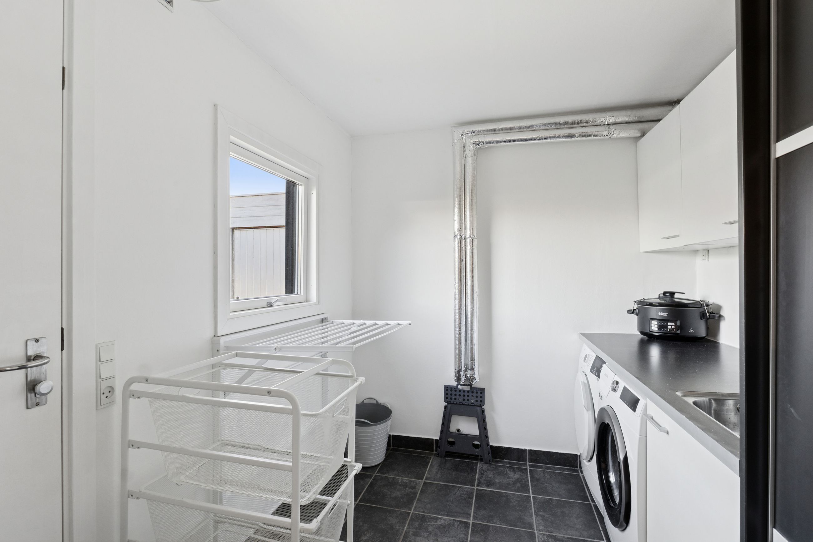 Et praktisk bryggers ligger i direkte forbindelse med køkkenet og giver ekstra opbevaringsmuligheder samt plads til vaskefaciliteter.