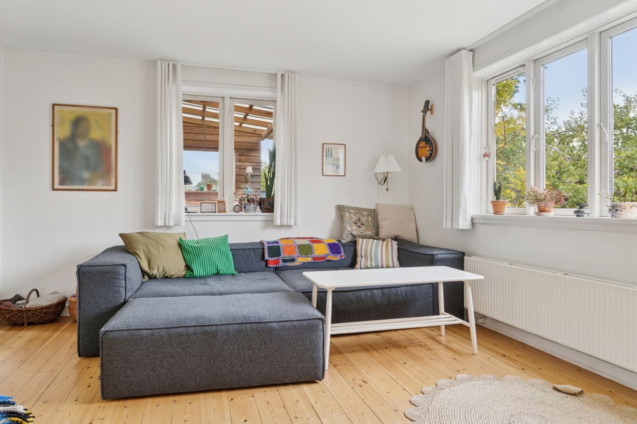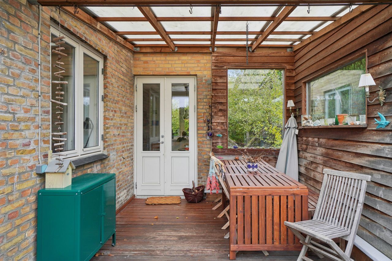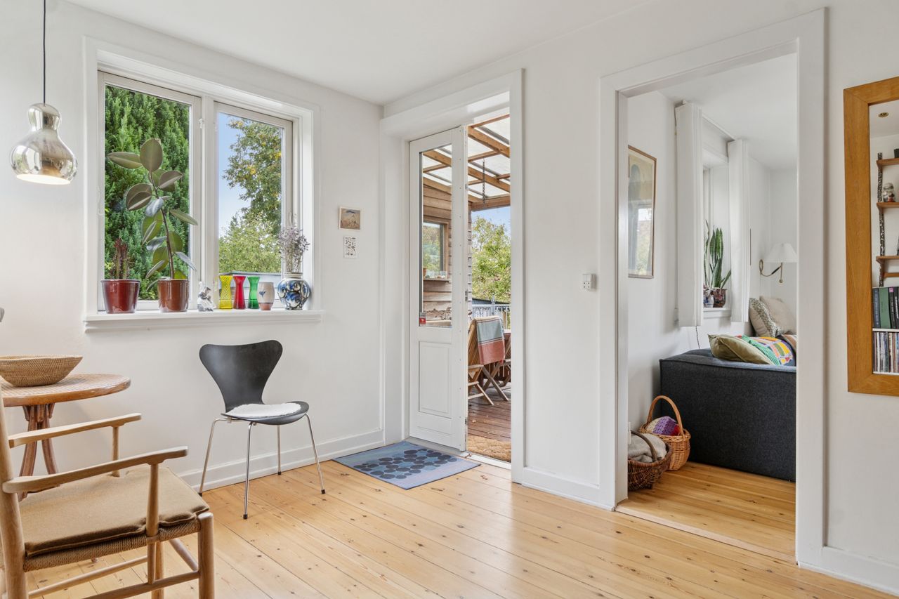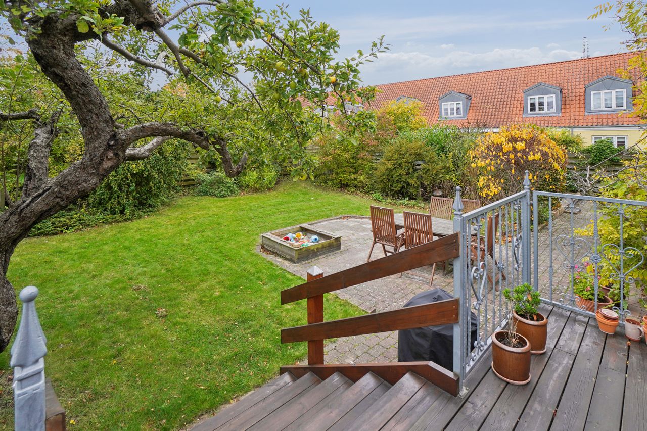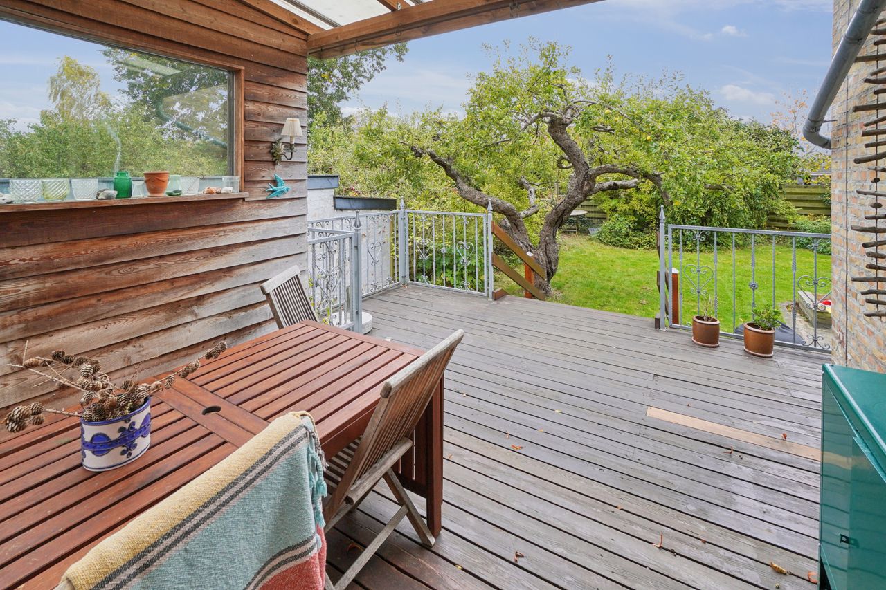 Fra stuen er der direkte udgang til en solrig og ugeneret have med en skøn træterrasse, hvor sommeren kan nydes i fulde drag.