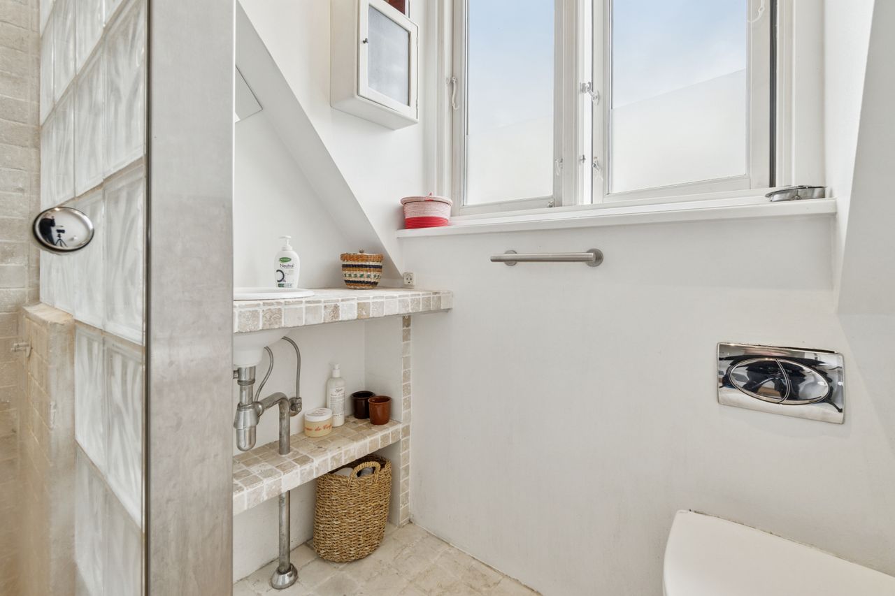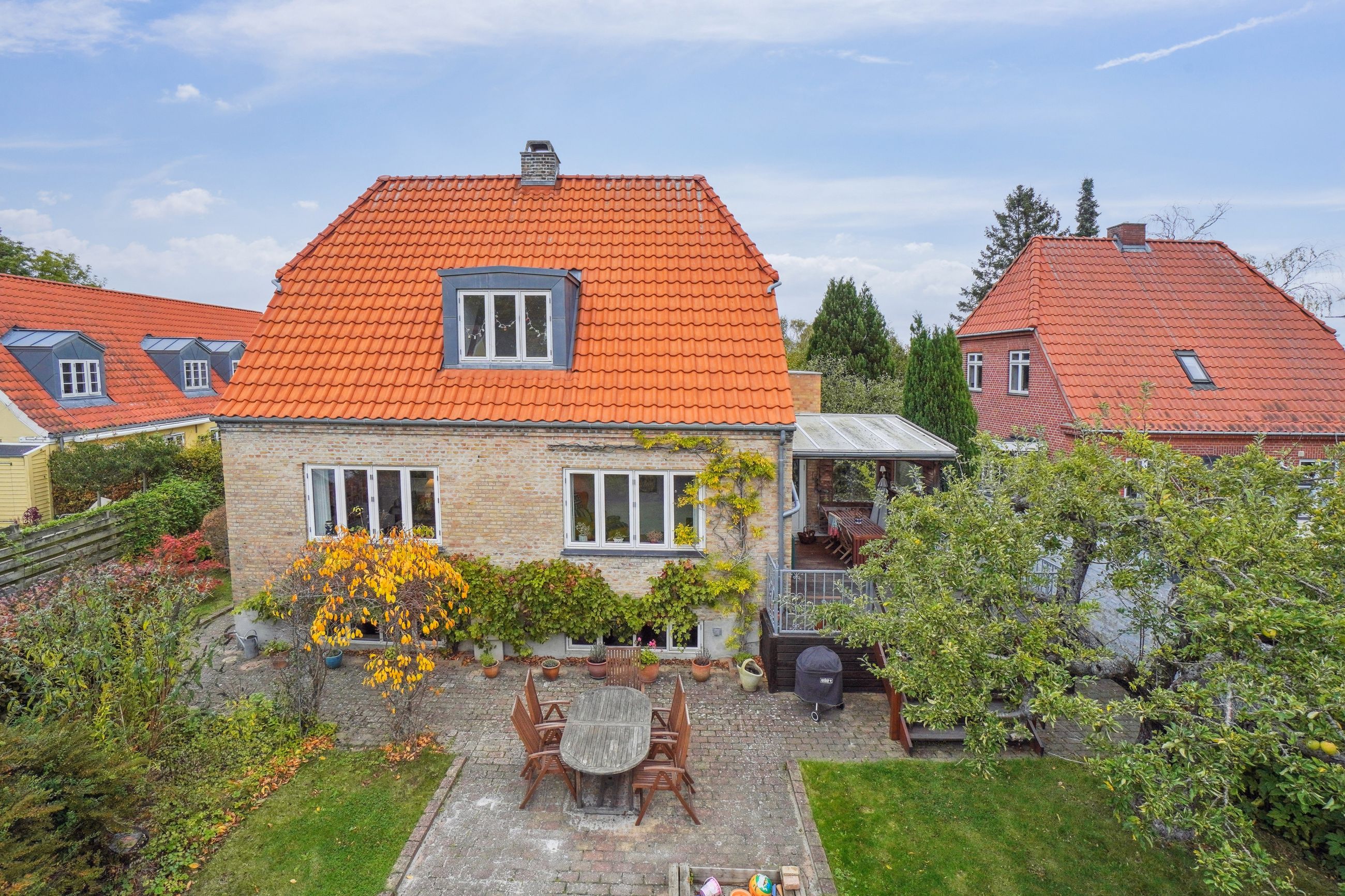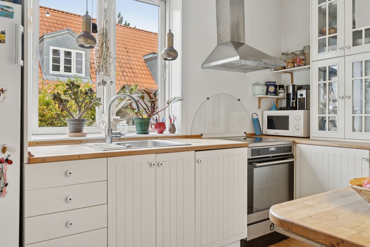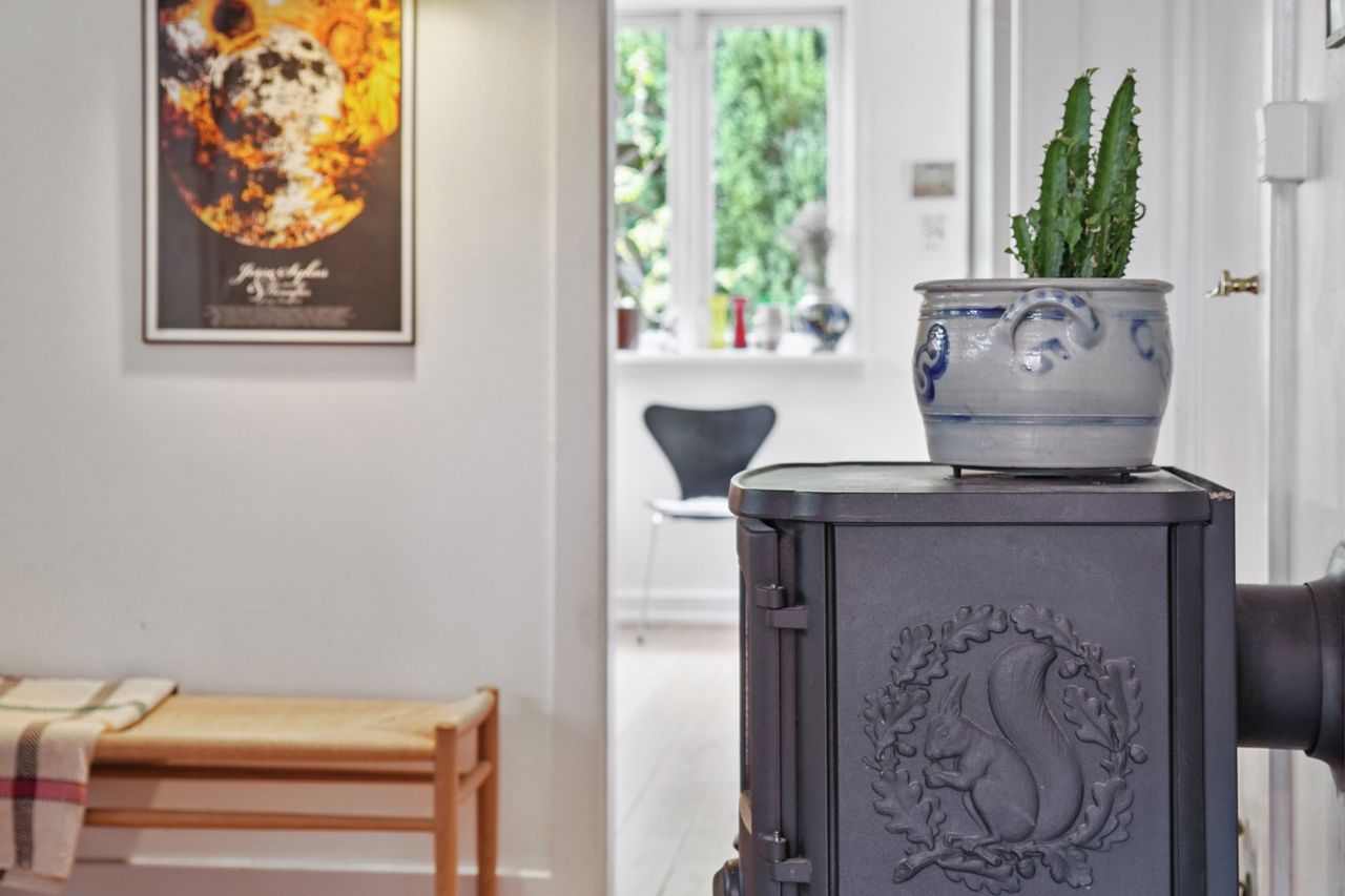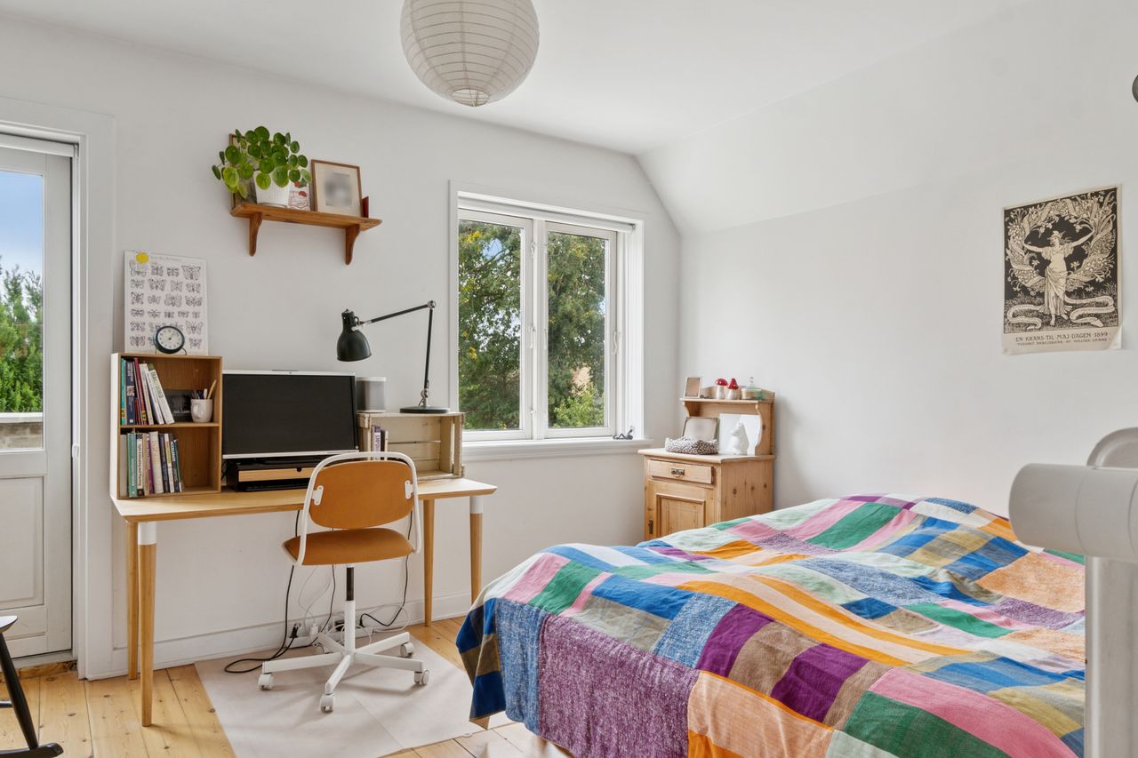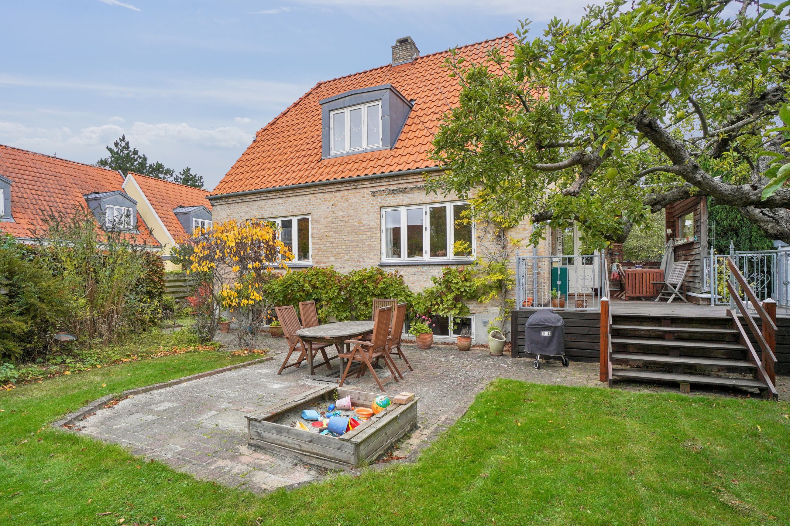 Fra stuen er der direkte udgang til en solrig og ugeneret have med en skøn træterrasse, hvor sommeren kan nydes i fulde drag.