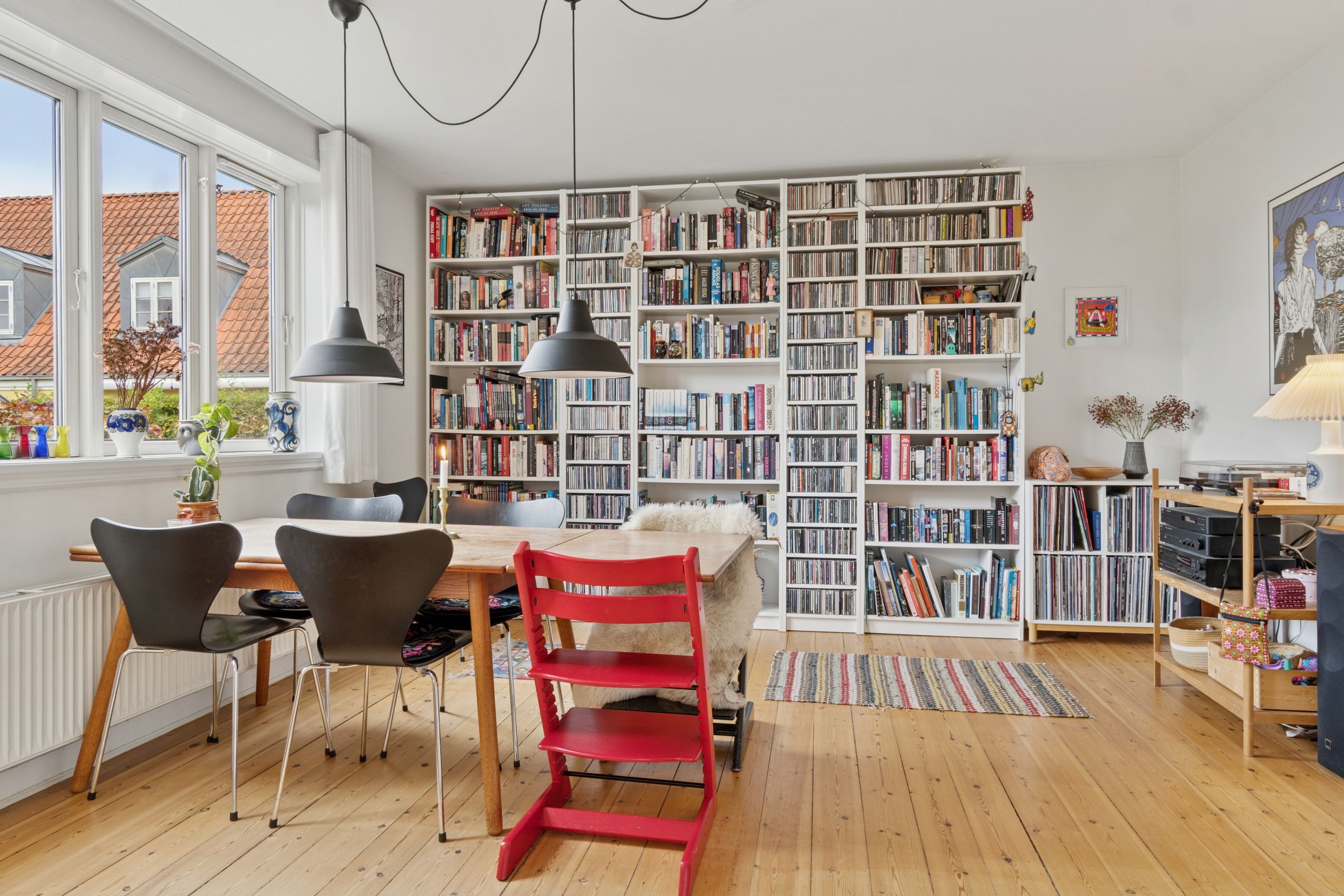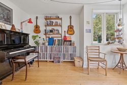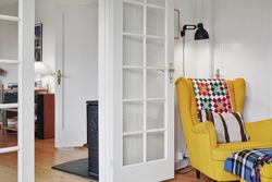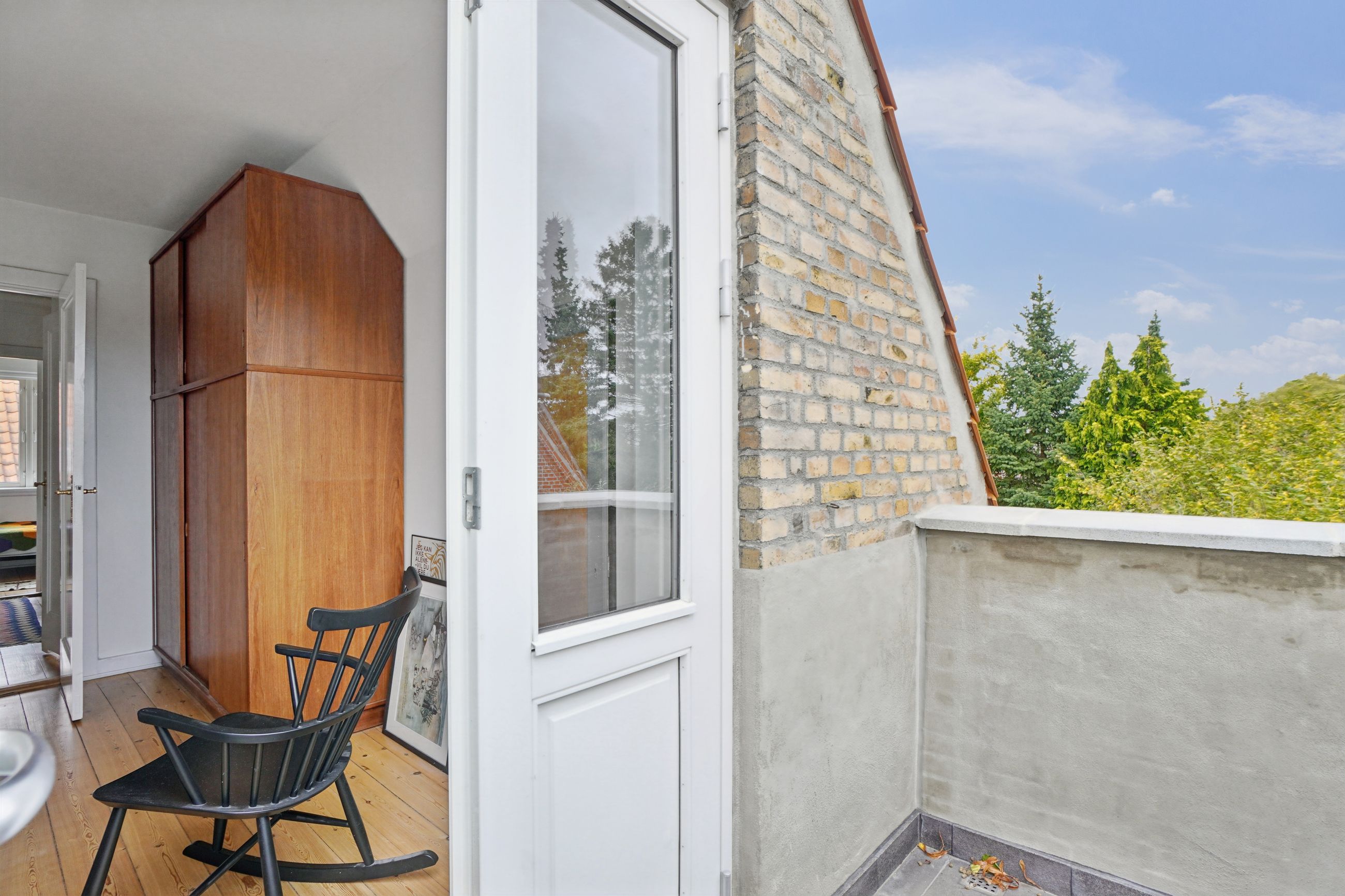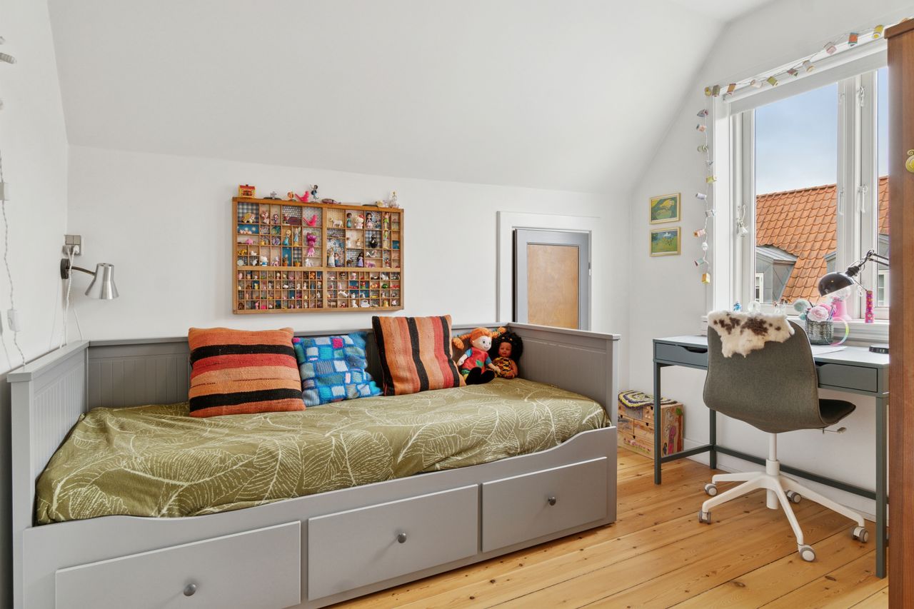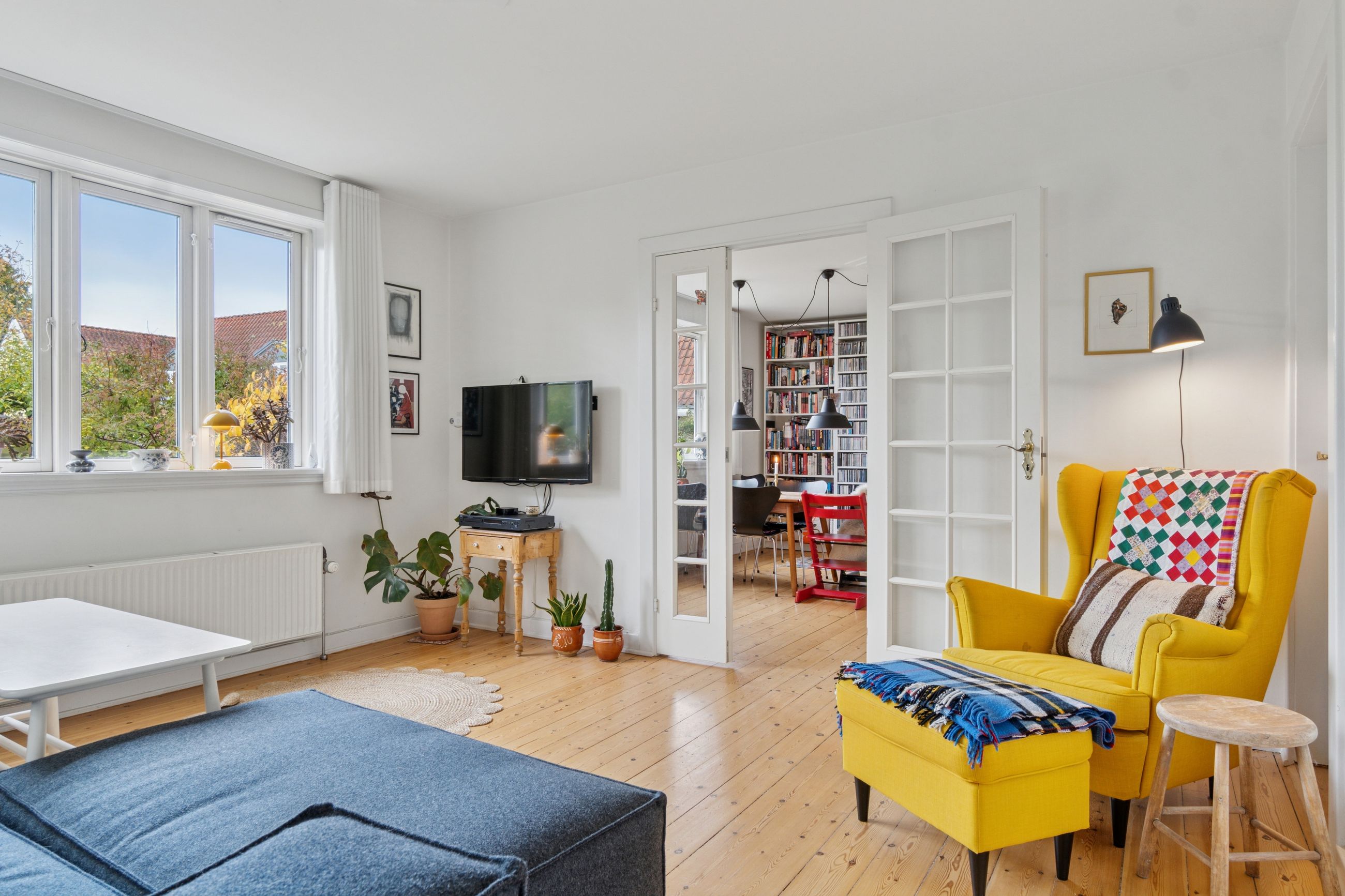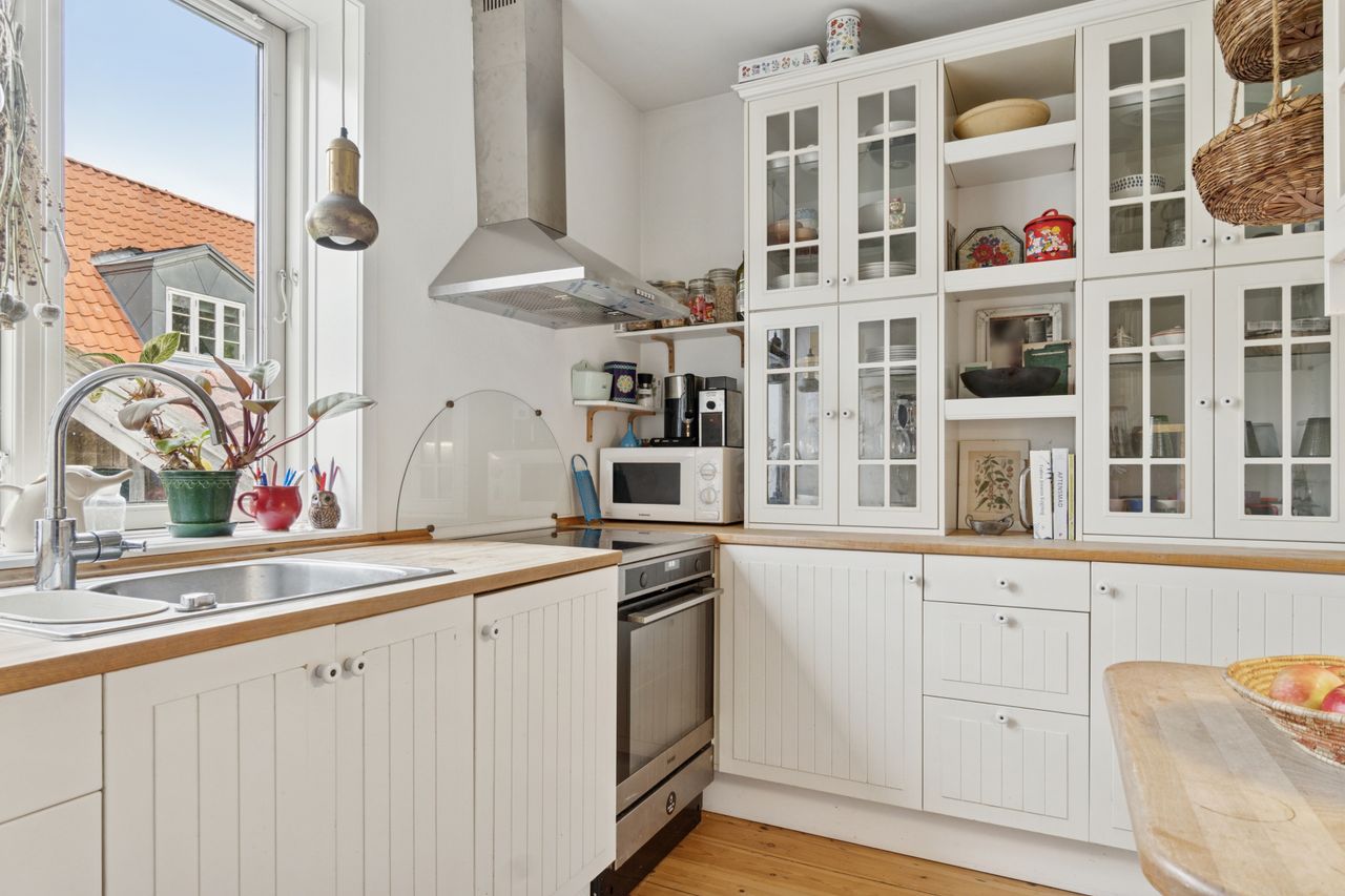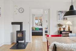 Fra stuen er der direkte udgang til en solrig og ugeneret have med en skøn træterrasse, hvor sommeren kan nydes i fulde drag.