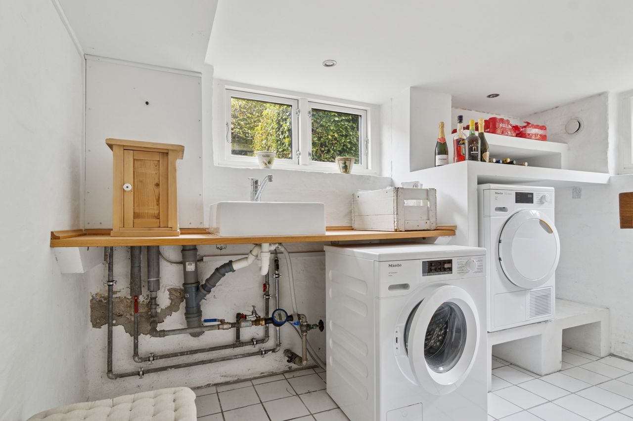 Den store kælder har egen indgang og rummer både bryggers, hobbyrum, viktualierum og masser af opbevaringsplads.
