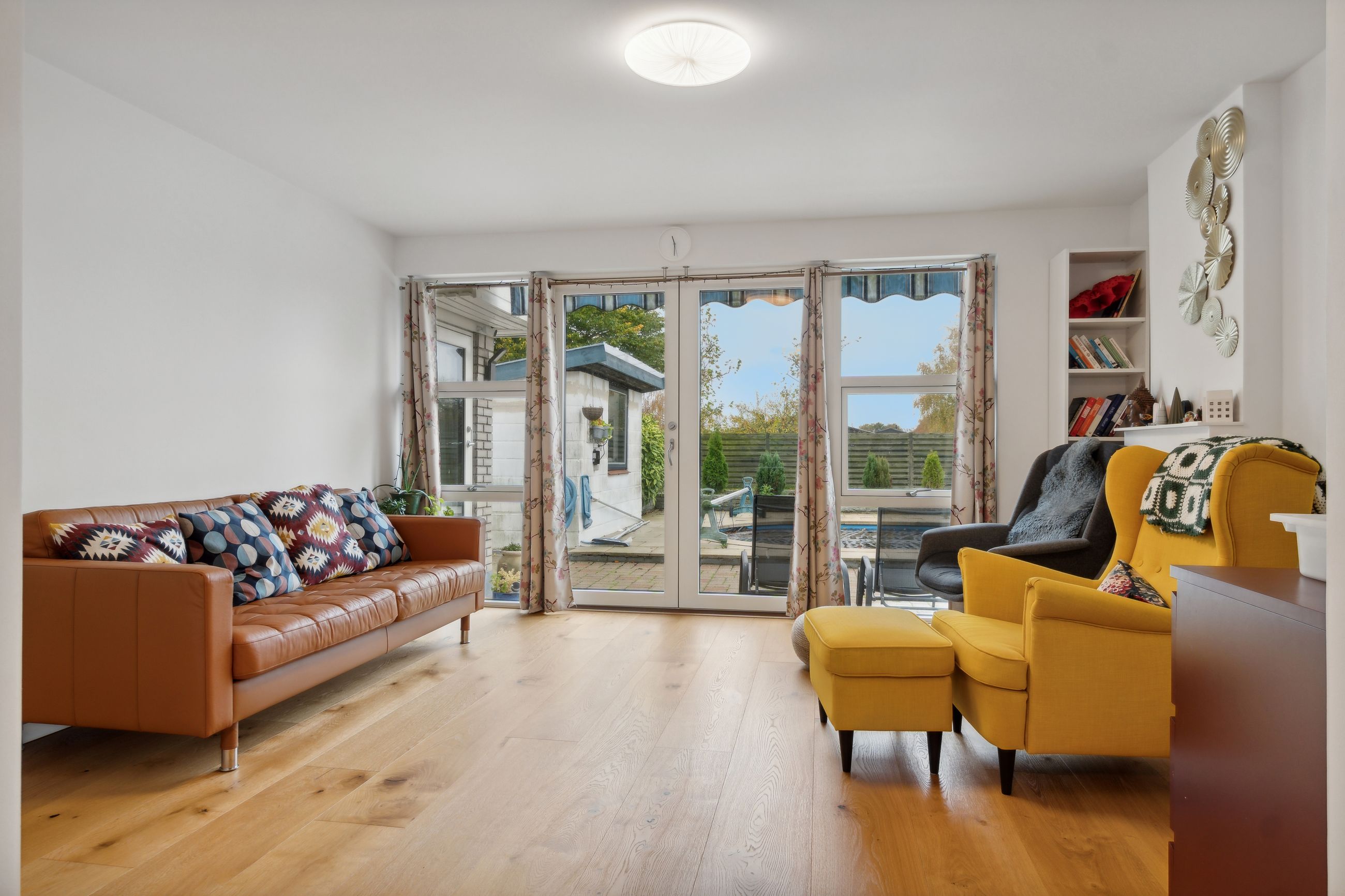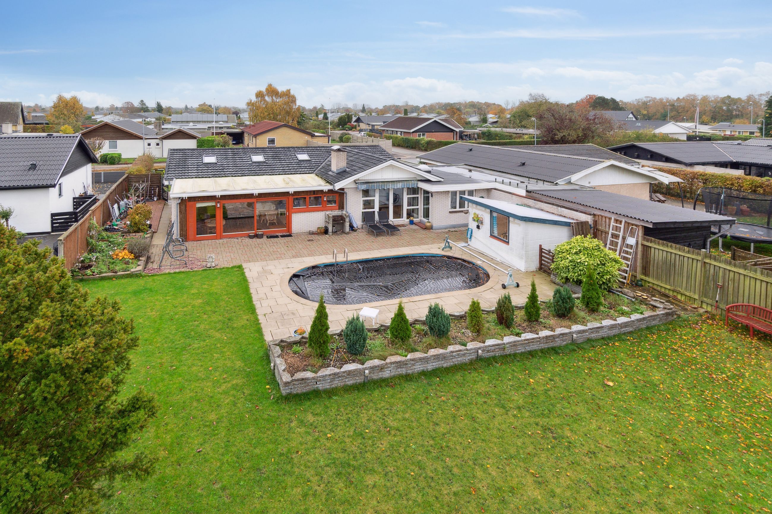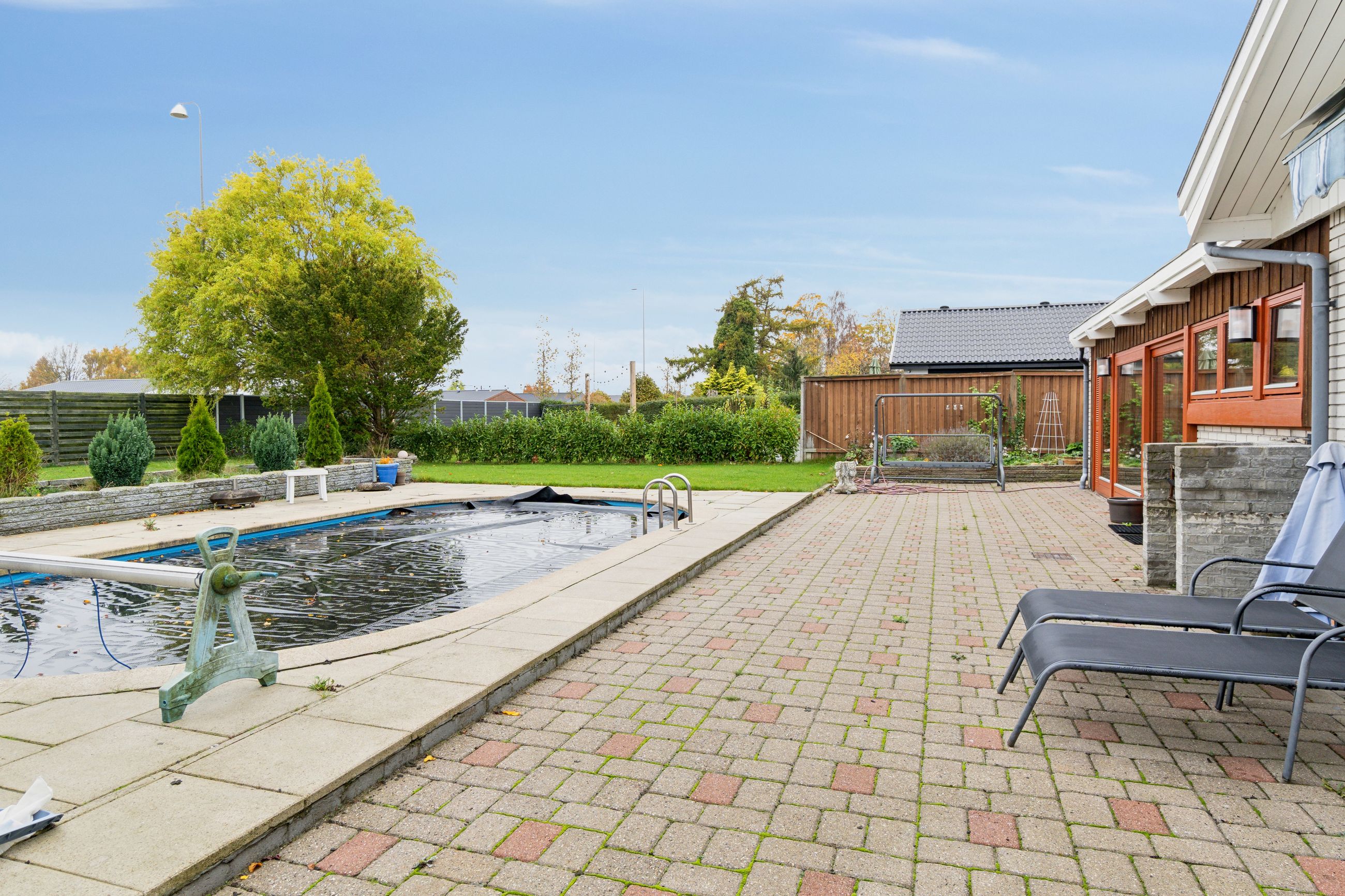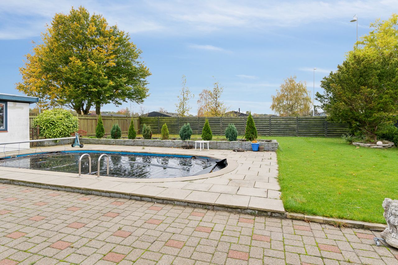 Udendørs venter en privat oase – baghaven byder på en swimmingpool, hvor både børn og voksne kan køle