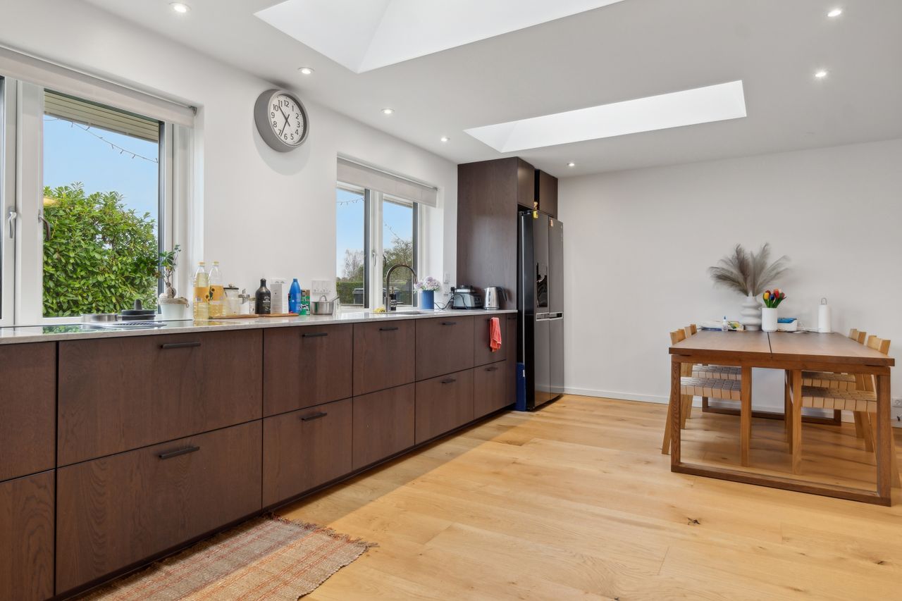 Det store køkken-alrum er boligens hjerte og det oplagte samlingspunkt for familien – med moderne