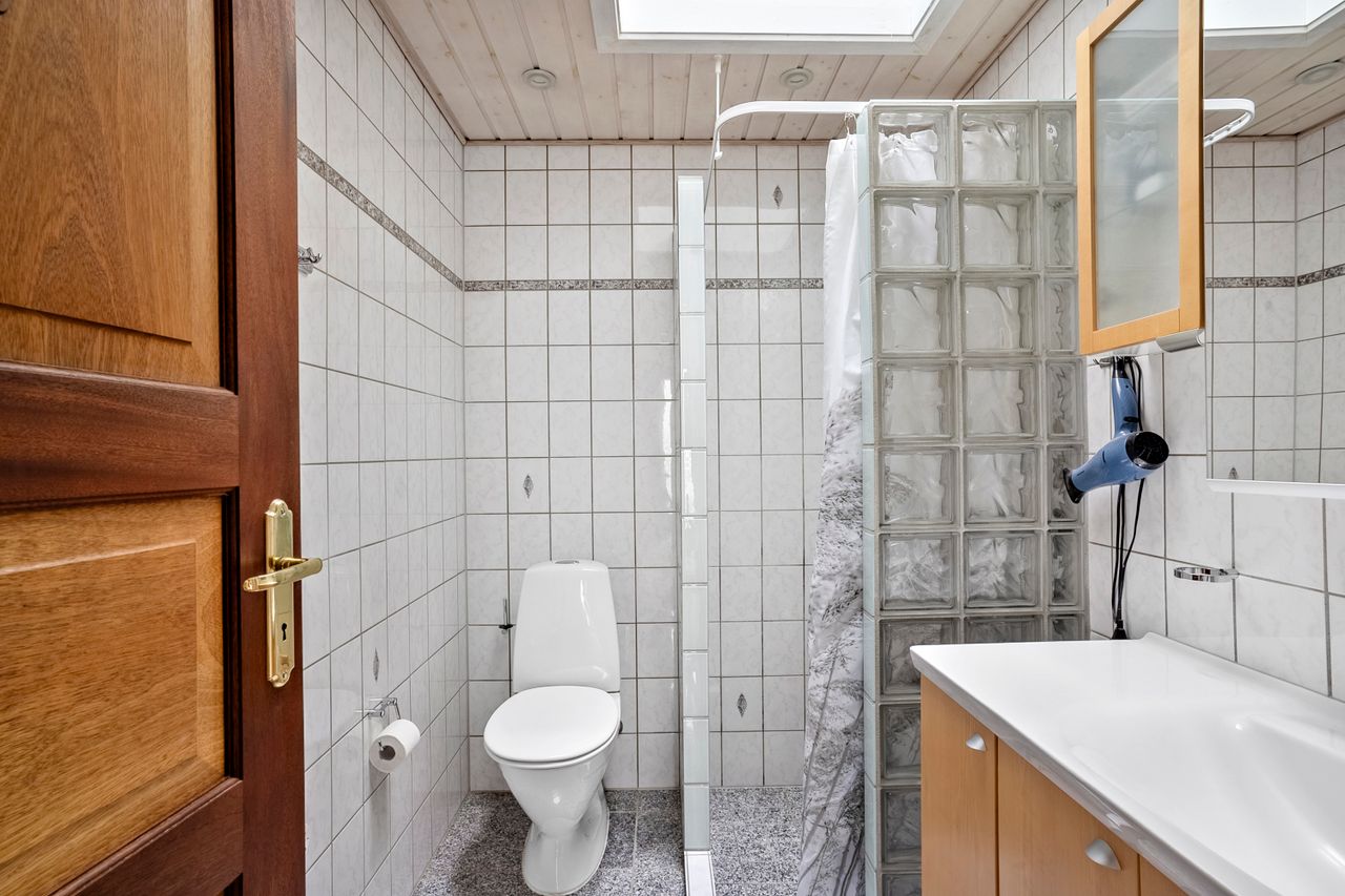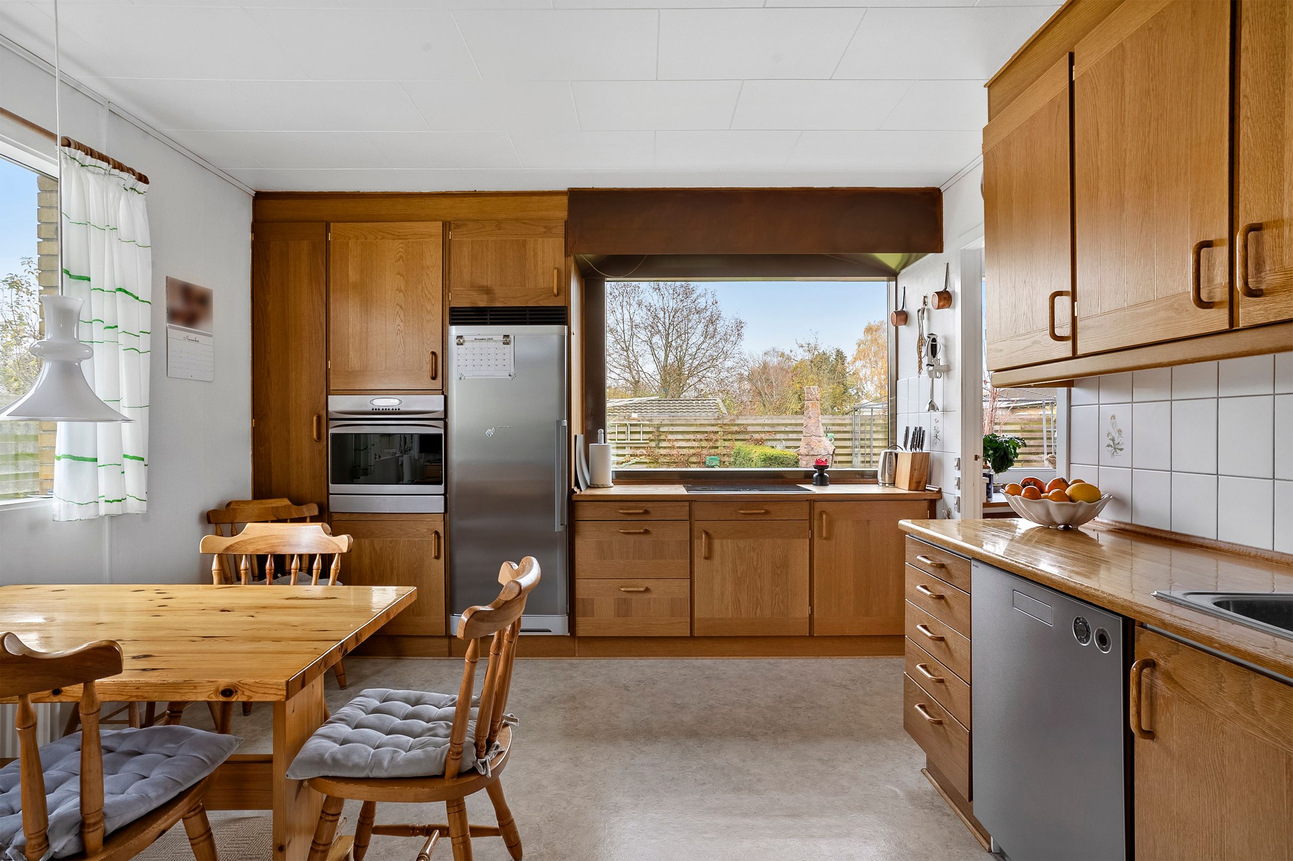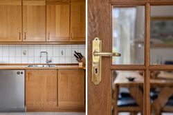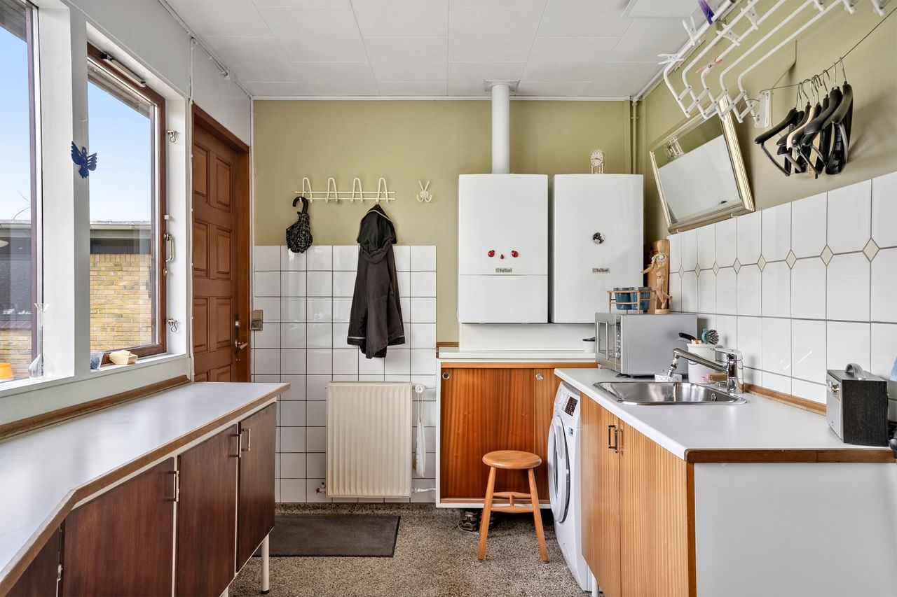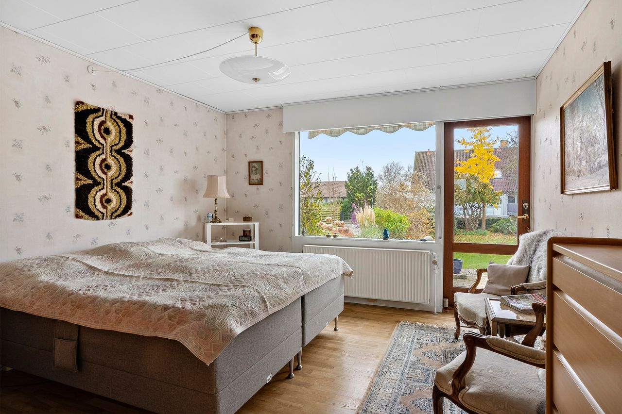Når du træder ind i den lyse entré, mødes du af tre indretningsvenlige soveværelser samt et badeværelse med ovenlysvindue, der giver et behageligt, naturligt lys. Videre ind åbner boligen sig mod en lys og rummelig stue i åben forbindelse med spisestuen. Her strømmer eftermiddagslyset ind gennem de store vinduespartier, og både stuen, master-bedroom og bryggers har direkte udgang til haven, hvilket skaber en fin sammenhæng mellem inde- og udeliv. Fra stuen er der adgang til køkkenet, der rummer en hyggelig spiseplads og med en unik detalje, en emhætte udført i kobber. Boligen bærer i det hele taget præg af kvalitet og gedigne materialer, vinduer og døre i mahogni - både indvendigt og udvendigt, samt massivt plankegulv, hvilket giver en varm og klassisk atmosfære. I forlængelse af køkkenet findes bryggerset med udgang til den sydvendte have samt et toilet med afløb, som giver mulighed for at etablere et ekstra badeværelse, hvis behovet opstår.