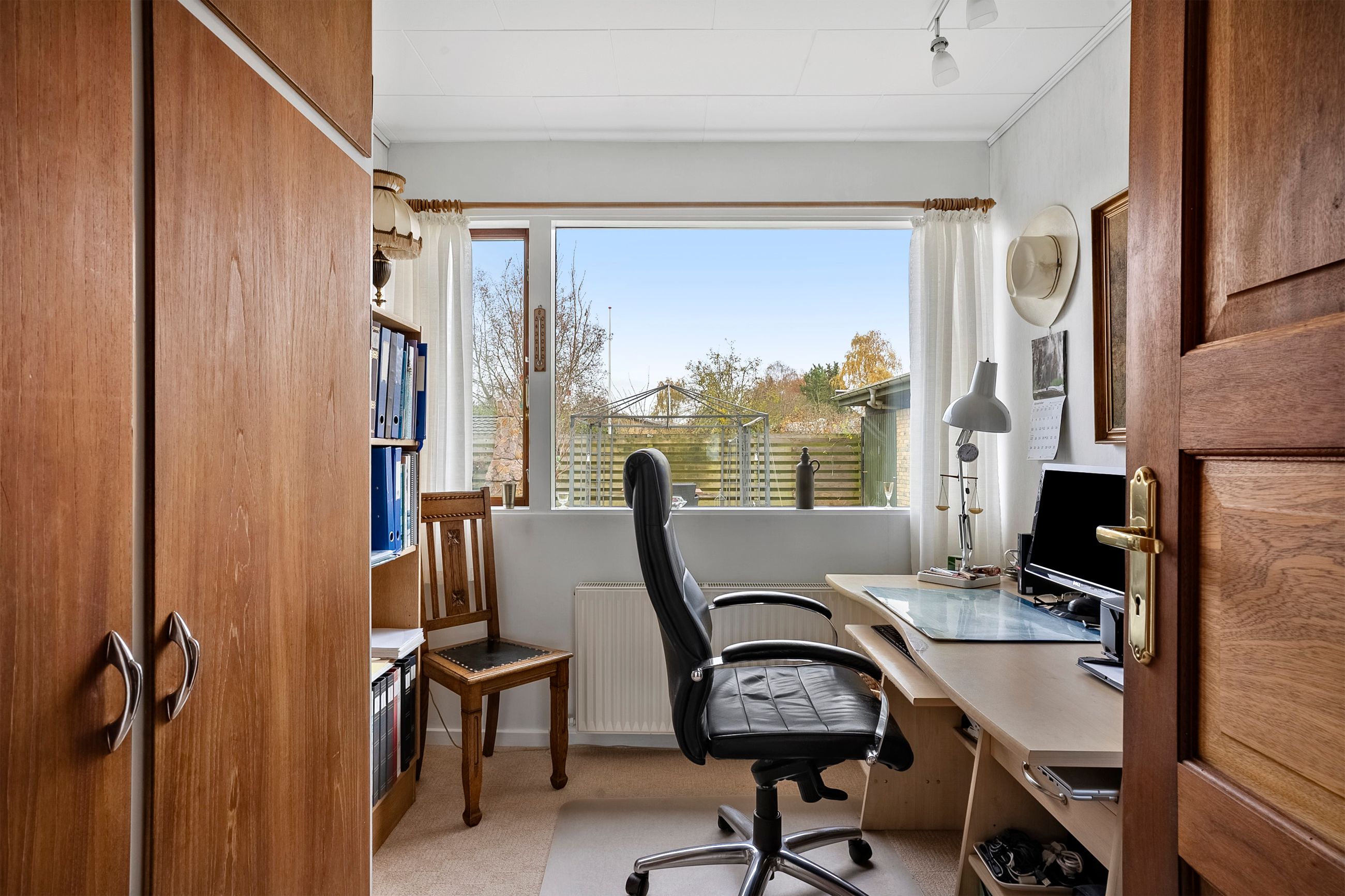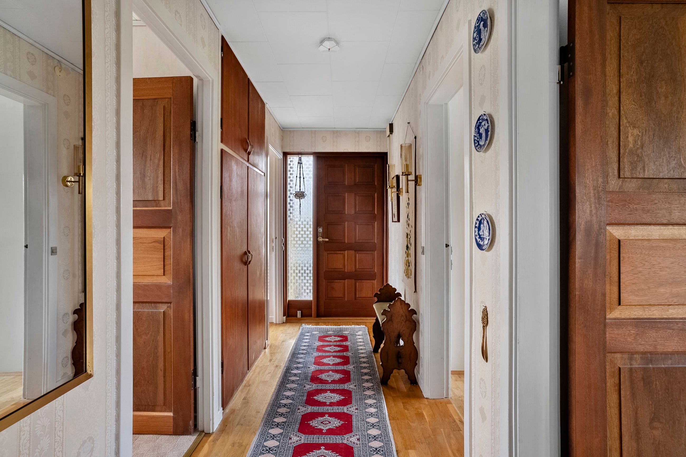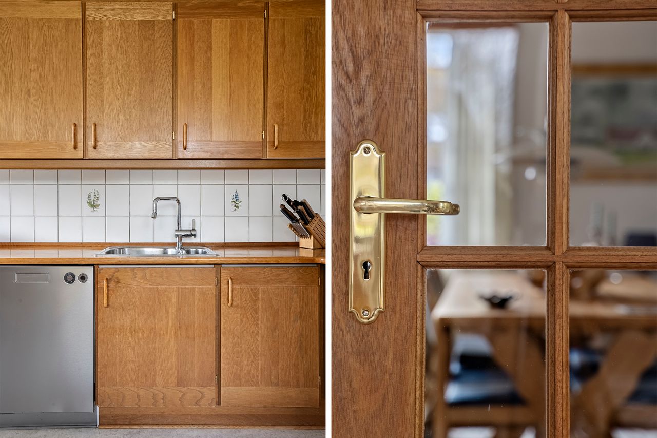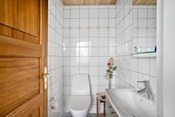 Når du træder ind i den lyse entré, mødes du af tre indretningsvenlige soveværelser samt et badeværelse med ovenlysvindue, der giver et behageligt, naturligt lys. Videre ind åbner boligen sig mod en lys og rummelig stue i åben forbindelse med spisestuen. Her strømmer eftermiddagslyset ind gennem de store vinduespartier, og både stuen, master-bedroom og bryggers har direkte udgang til haven, hvilket skaber en fin sammenhæng mellem inde- og udeliv. Fra stuen er der adgang til køkkenet, der rummer en hyggelig spiseplads og med en unik detalje, en emhætte udført i kobber. Boligen bærer i det hele taget præg af kvalitet og gedigne materialer, vinduer og døre i mahogni - både indvendigt og udvendigt, samt massivt plankegulv, hvilket giver en varm og klassisk atmosfære. I forlængelse af køkkenet findes bryggerset med udgang til den sydvendte have samt et toilet med afløb, som giver mulighed for at etablere et ekstra badeværelse, hvis behovet opstår.