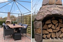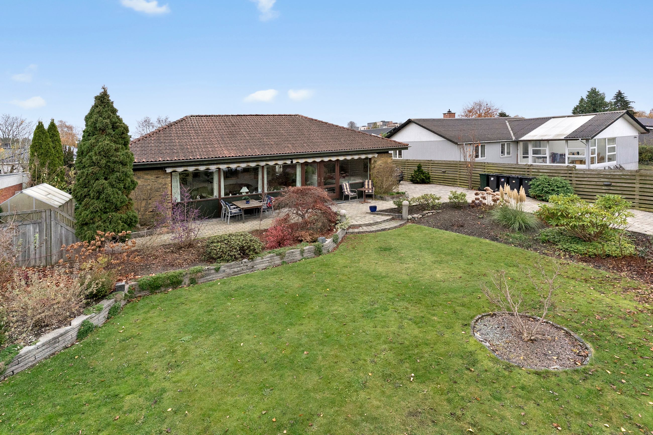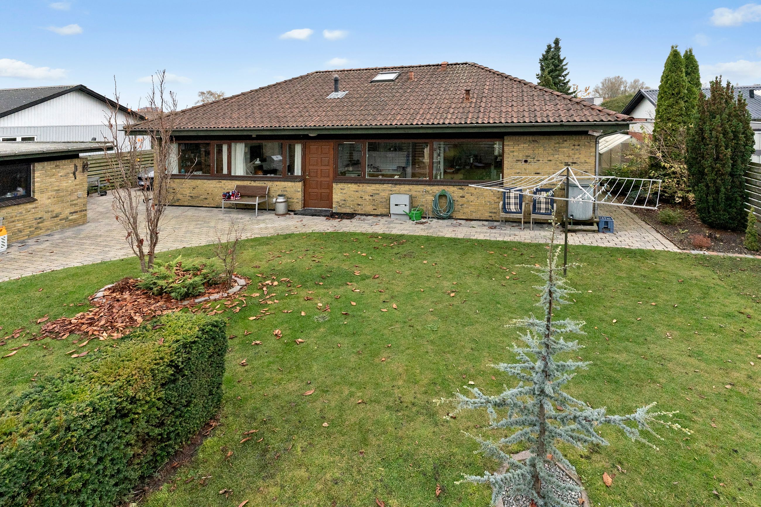Grunden udgør i alt 800 m2 og fremstår smukt anlagt. Forhaven byder på velplejede buske og træer, og langs indkørslen står en række kirsebærtræer, der i blomstringssæsonen skaber en charmerende og indbydende ankomst. Baghaven vender ideelt mod syd og rummer en stor terrasse, perfekt til både afslapning og hyggelige sommeraftener. For enden af indkørslen findes en muret garage med tilstødende skur, som giver gode opbevaringsmuligheder og en praktisk hverdag.