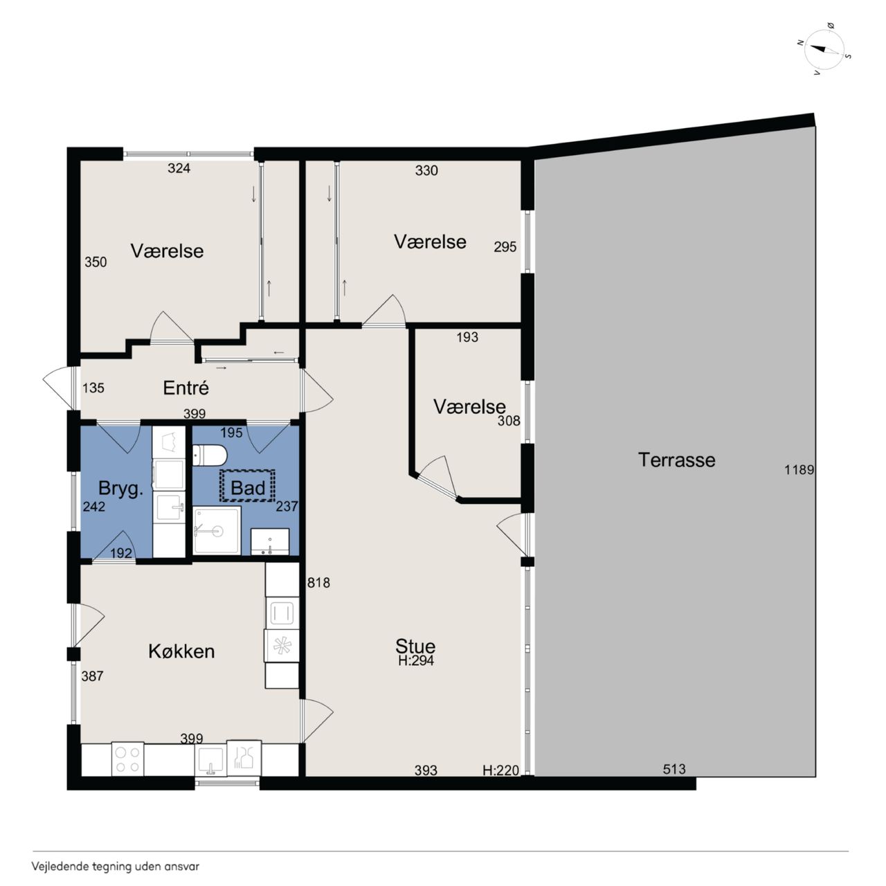 Boligen byder på en lys og indbydende stue med direkte udgang til den solrige terrasse og have. Herudover rummer huset tre gode soveværelser, et stilrent badeværelse, et praktisk bryggers samt et køkken med spiseplads. I flere af rummene – herunder køkken, gang, bryggers og badeværelse – er der installeret gulvvarme, som sikrer en behagelig og ensartet varmefordeling.