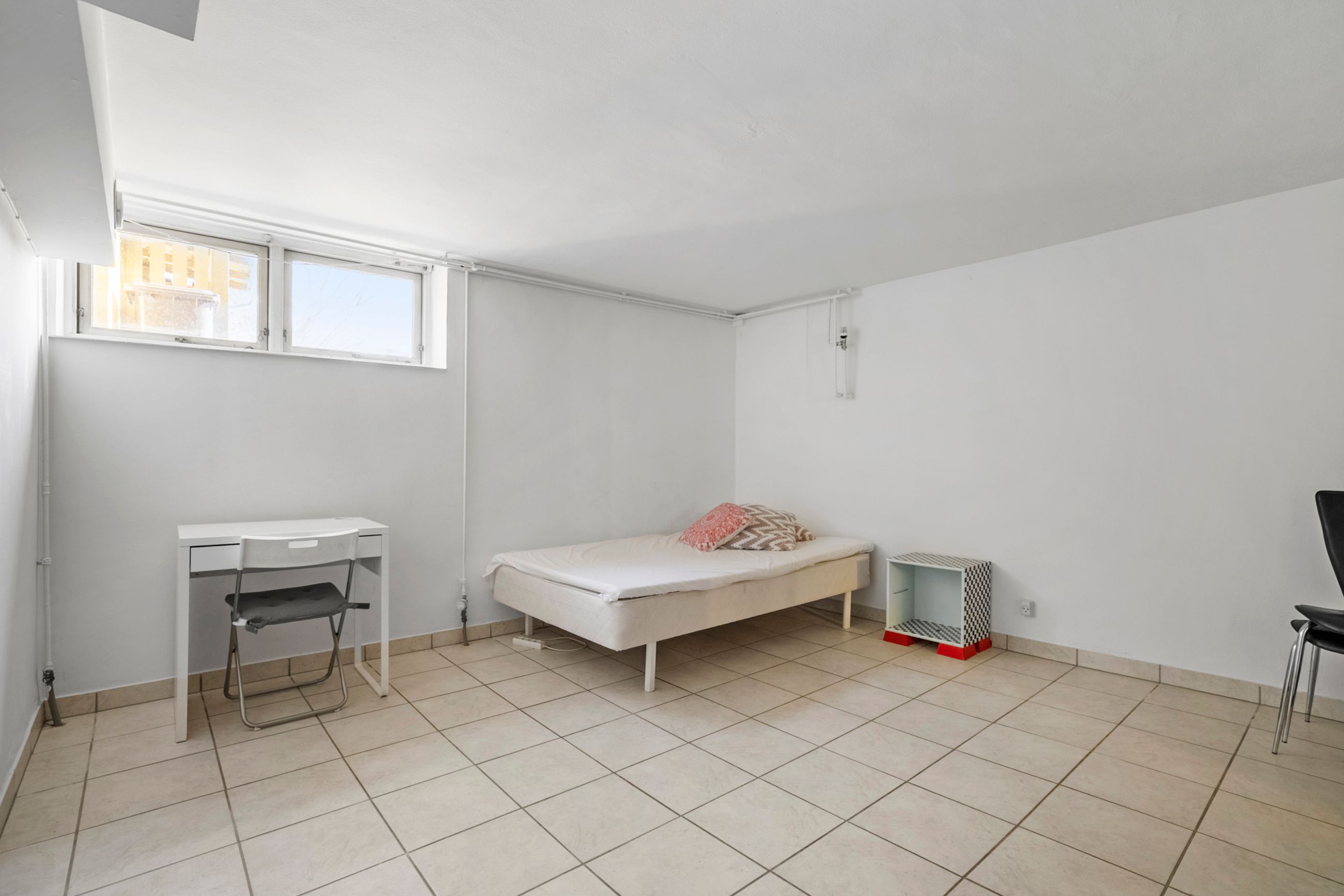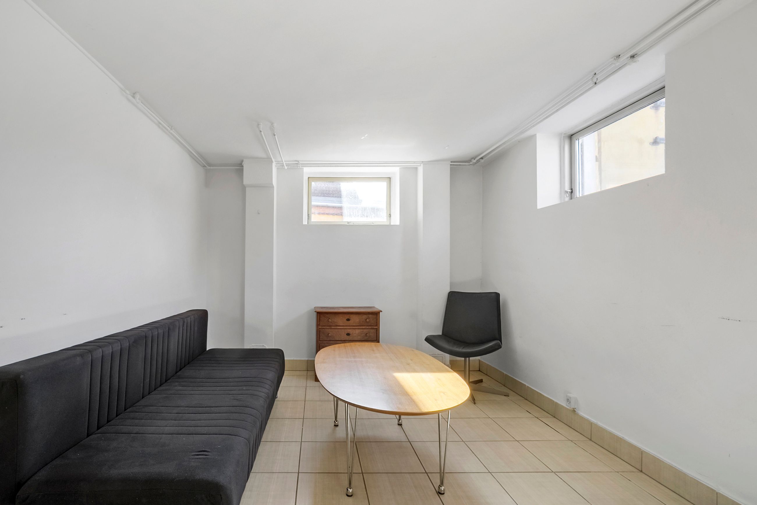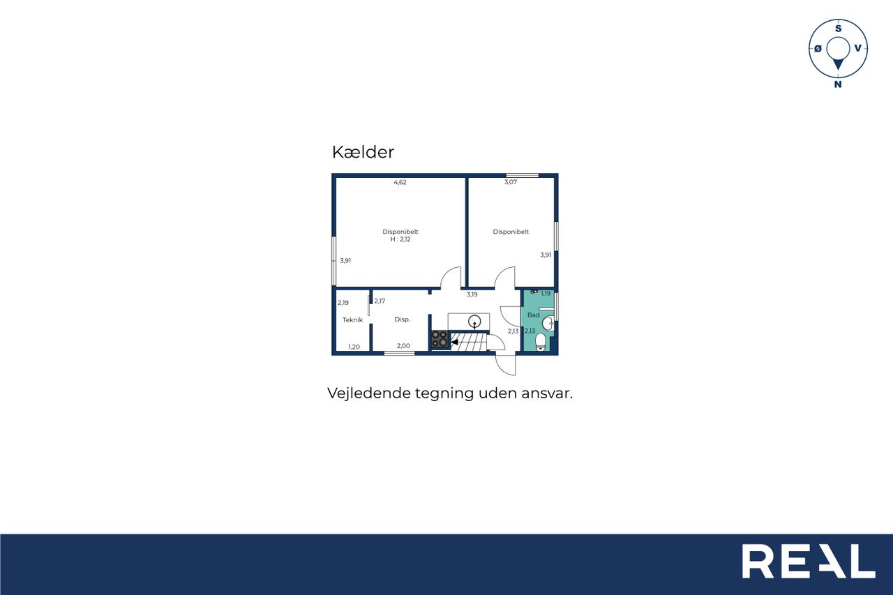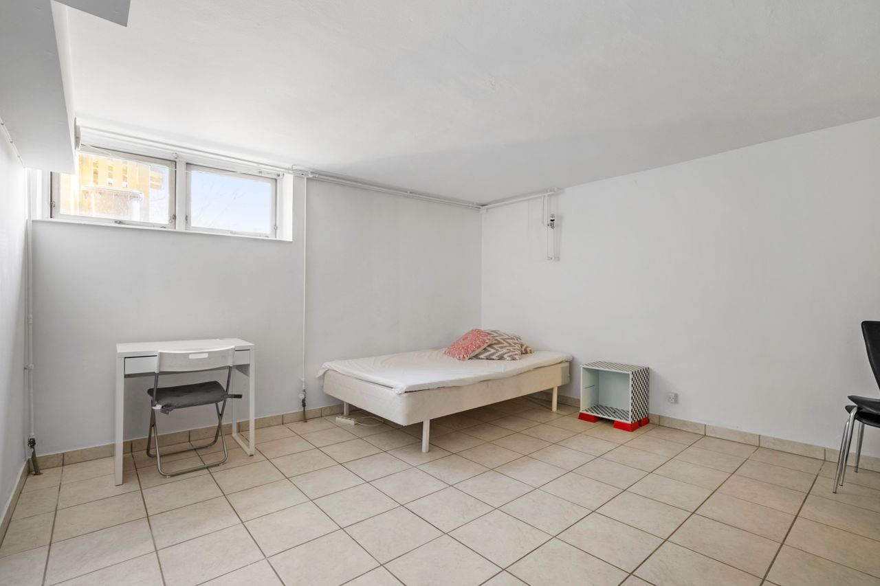 Kælderen byder på flere disponible rum samt teknikum og badeværelse, hvilket giver gode muligheder for hobbyrum, opbevaring, træningsrum eller andre kreative formål.