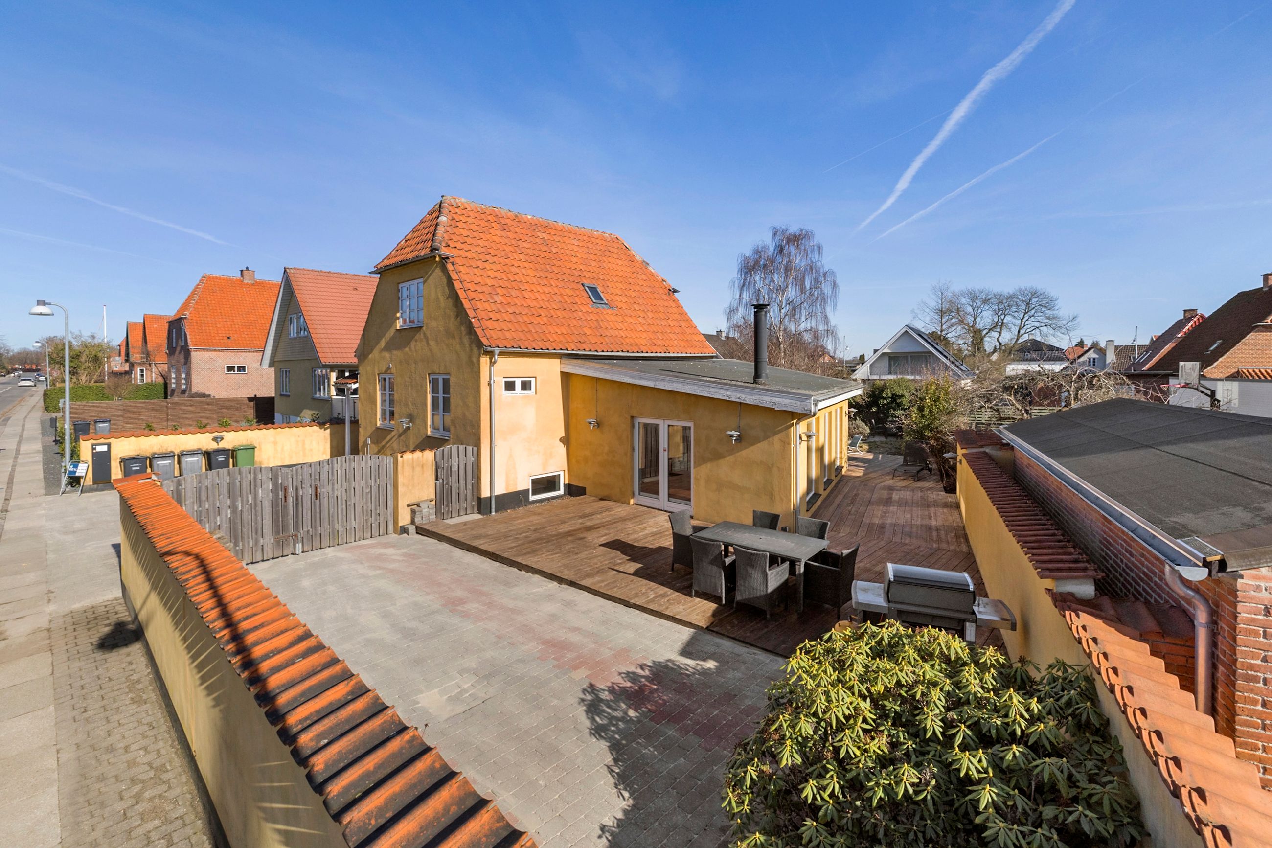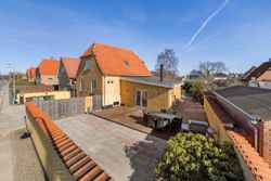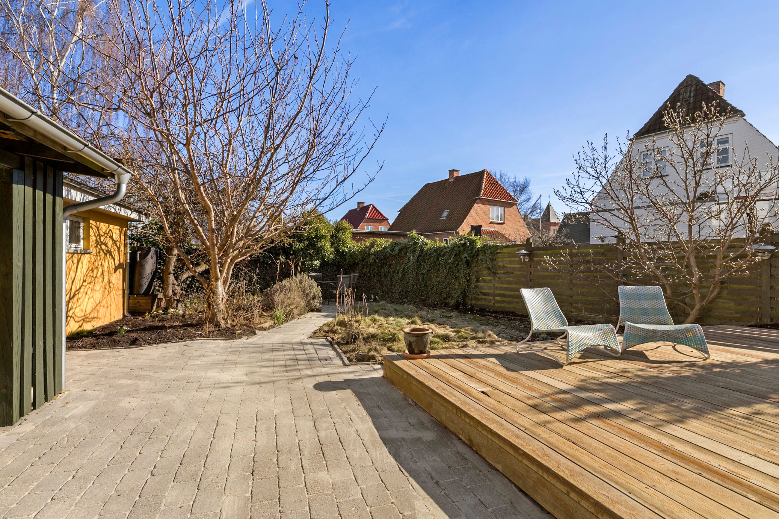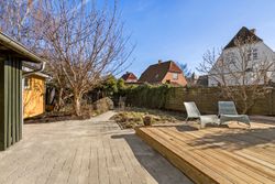 Udendørs venter en hyggelig have og en stor træterrasse, der danner de perfekte rammer om udelivet. Den flisebelagte indkørsel giver god plads til parkering.