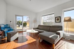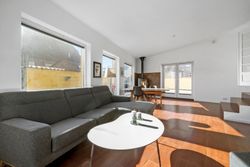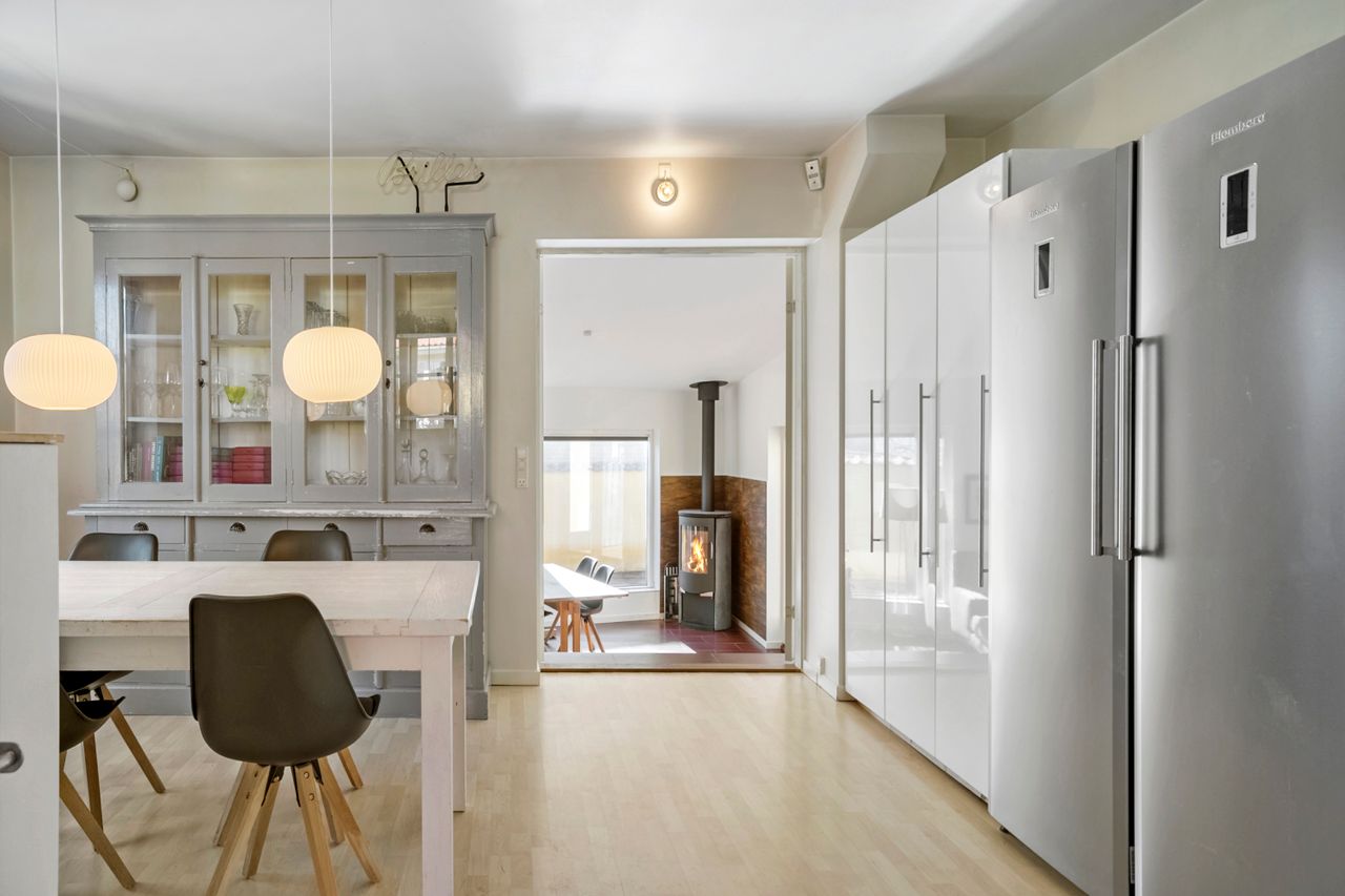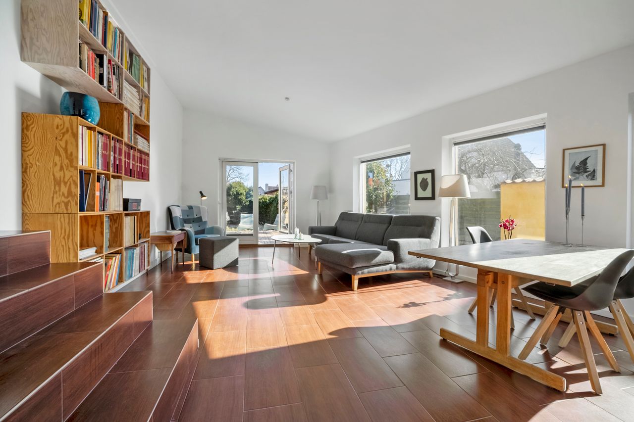 Boligens hjerte er det hyggelige køkken og alrum, hvor der er god plads til både madlavning og samvær i hverdagen. Herfra er der en naturlig forbindelse til den rummelige stue, hvor store vinduespartier inviterer lyset indenfor og skaber en skøn atmosfære. Fra stuen er der direkte udgang til den store terrasse, hvor sommerens mange timer kan nydes i solen – hvad enten det er til grillmiddage, morgenkaffe eller afslapning.
