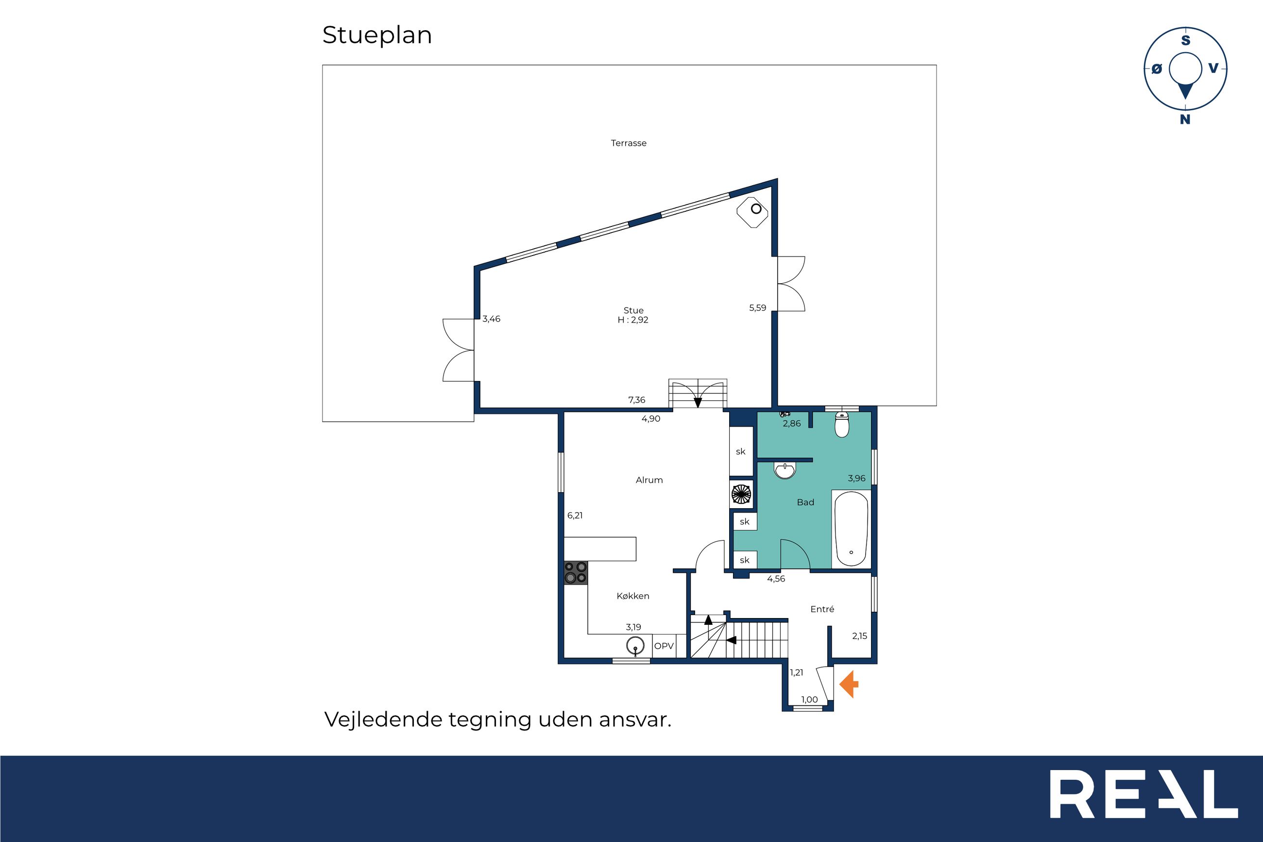 Stueplan rummer desuden entré samt et flot og rummeligt badeværelse.