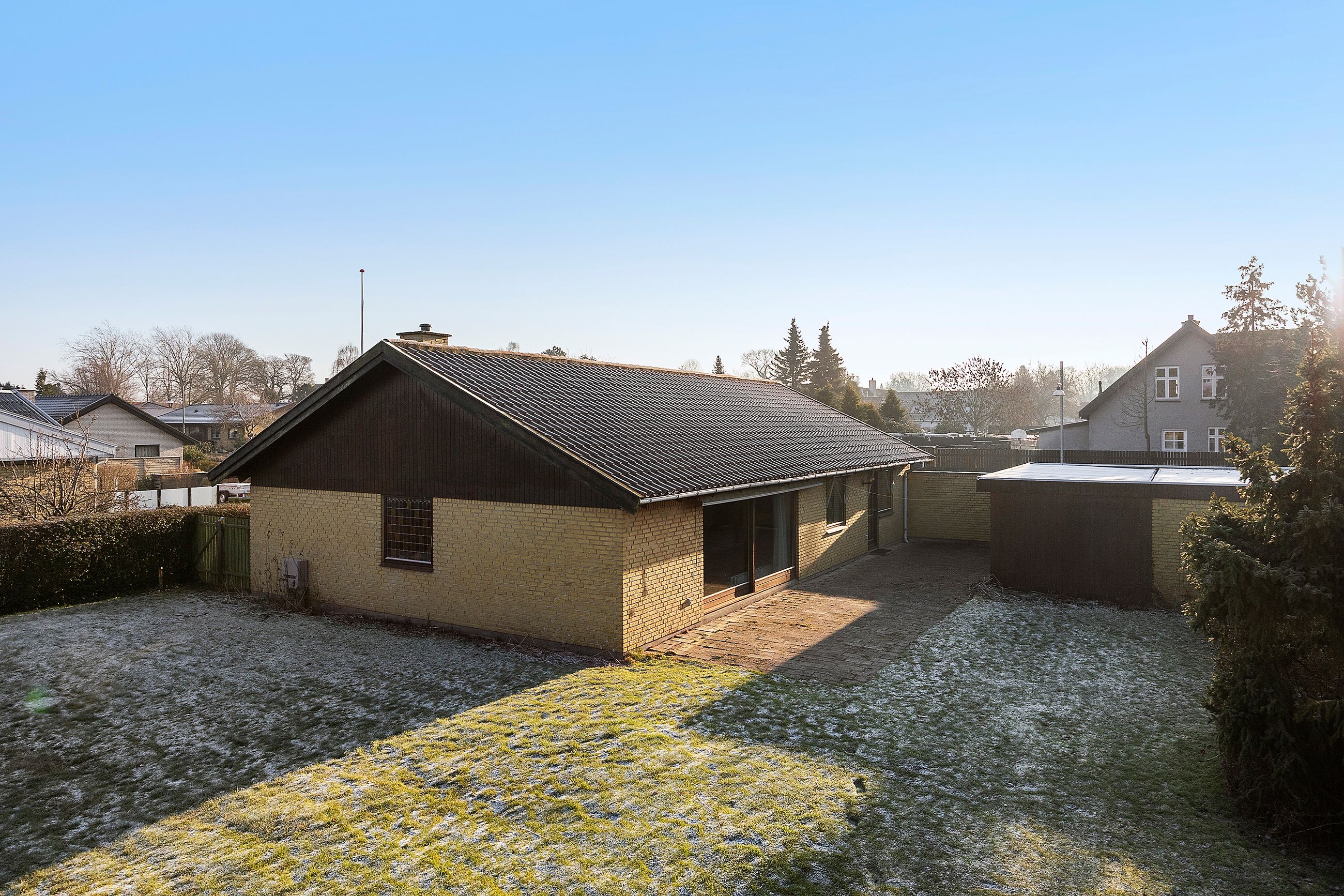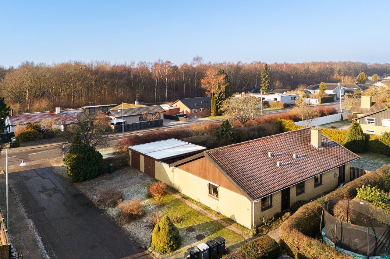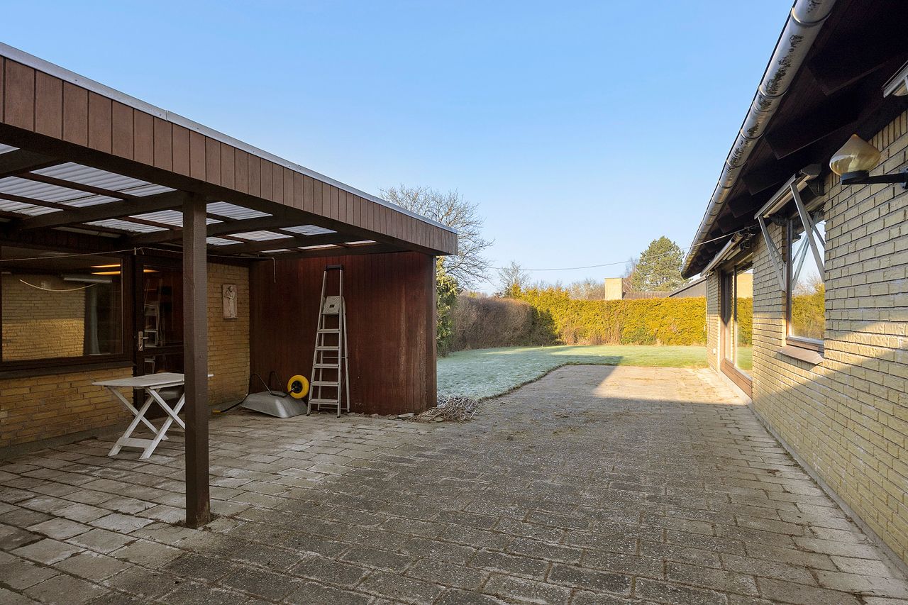 Haven er overskuelig og privat med god plads til leg, terrasse og grønne projekter. Til ejendommen hører desuden garage/overdækning, som giver fine opbevarings- og parkeringsmuligheder.