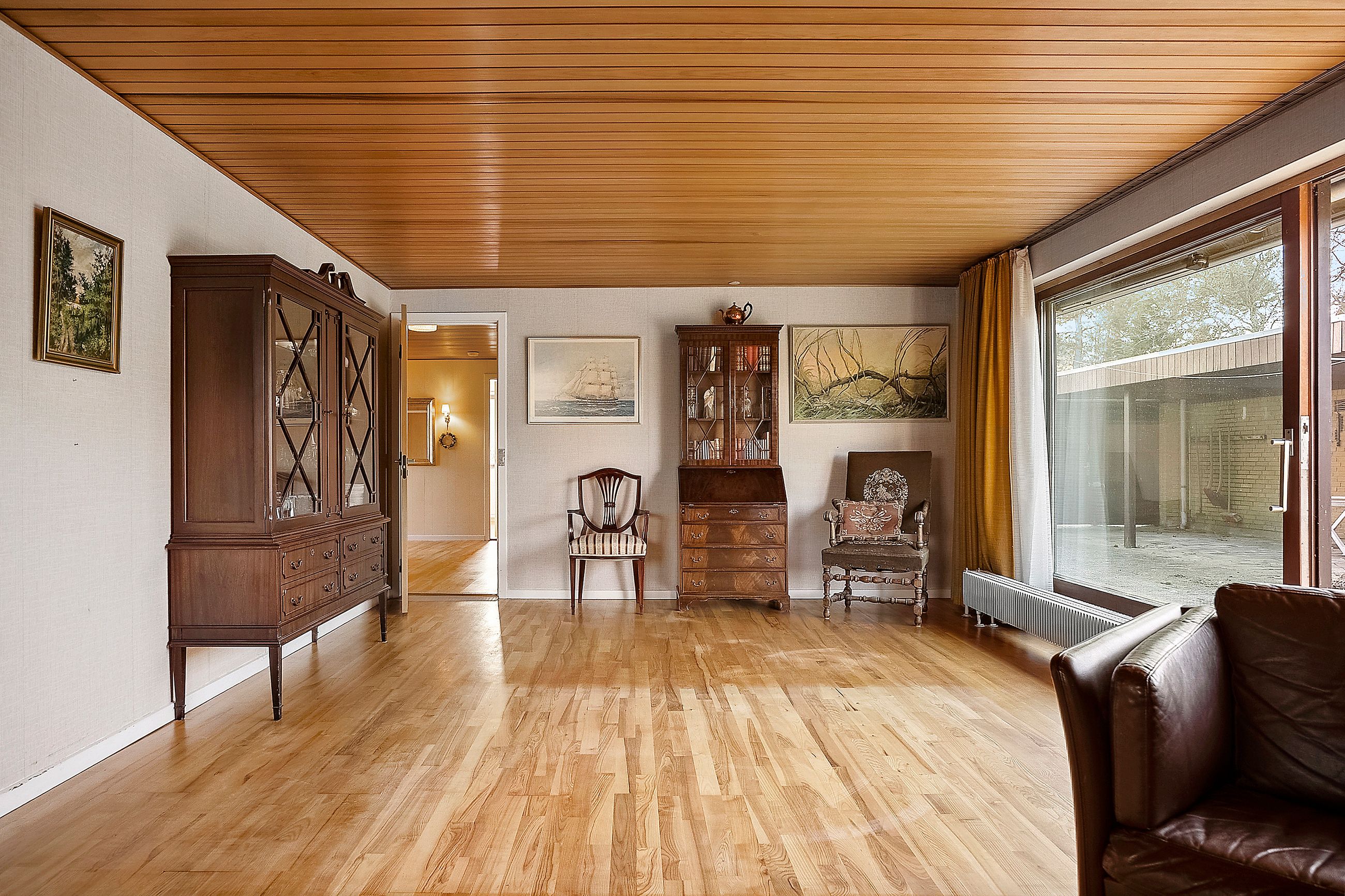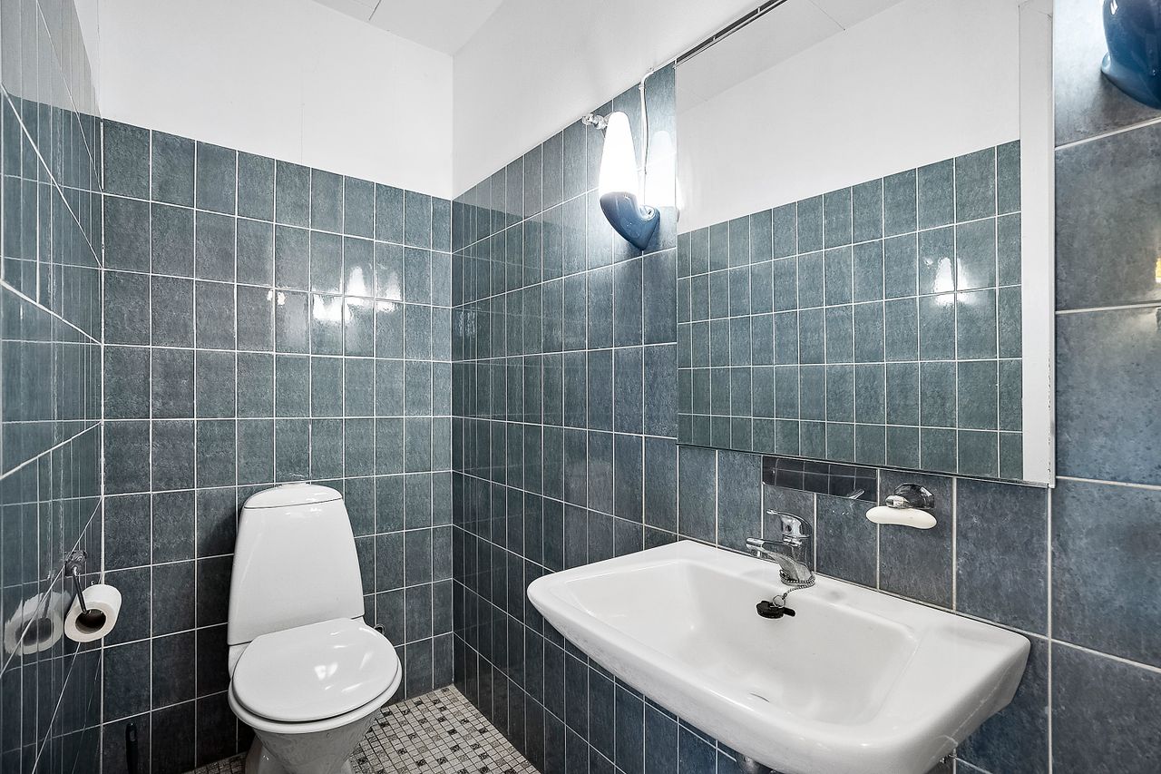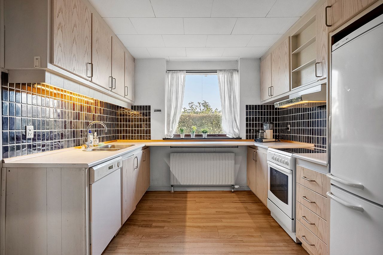 Boligen byder på en stor og lys stue med direkte udgang til haven – et oplagt samlingspunkt for både hverdag og gæster. Køkkenet er funktionelt, men i ældre stand og giver den kommende ejer mulighed for at skabe et moderne køkken-alrum eller opdatere efter egen smag. Badeværelserne fremstår ligeledes originale og kalder på en opdatering.