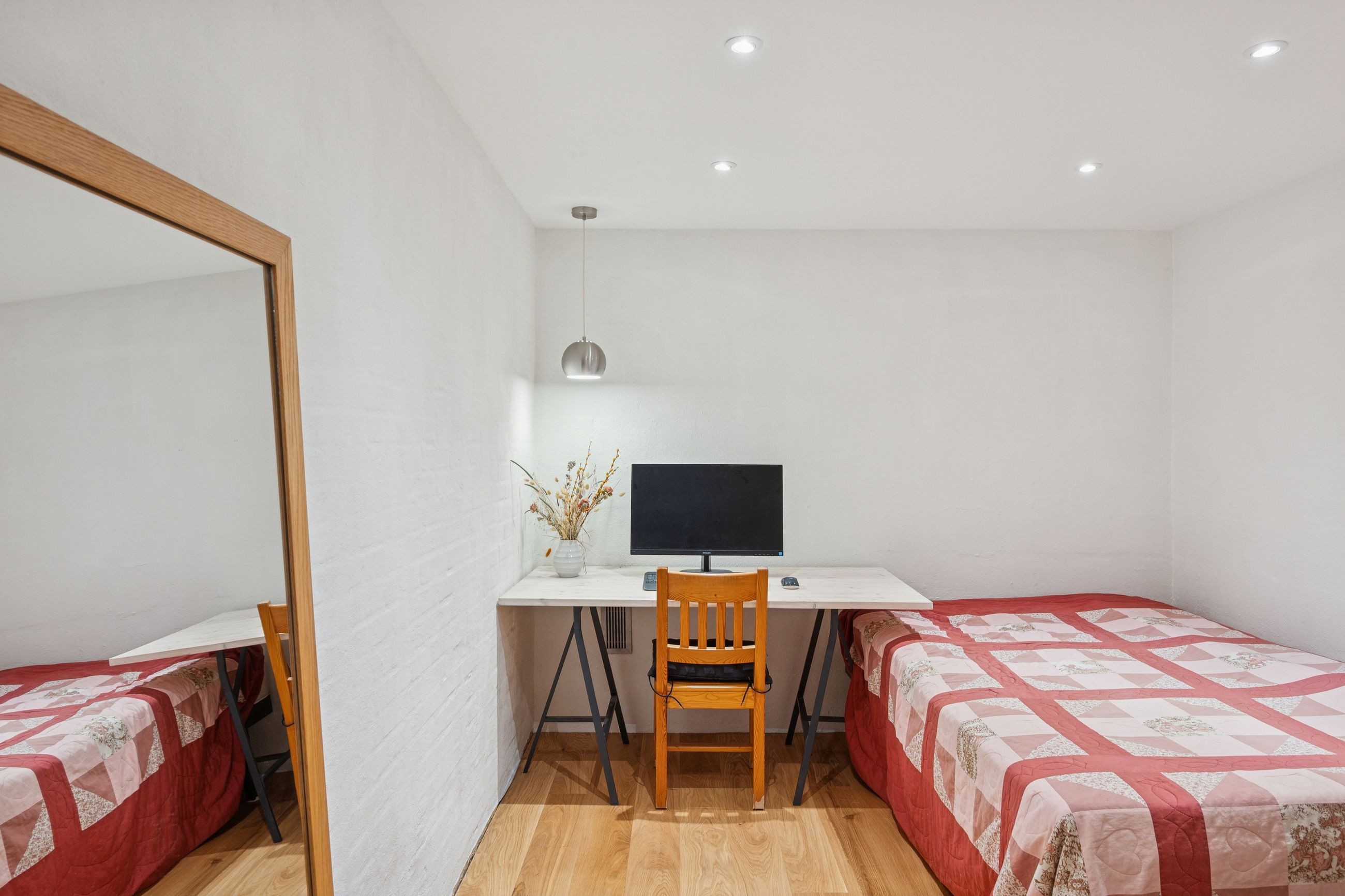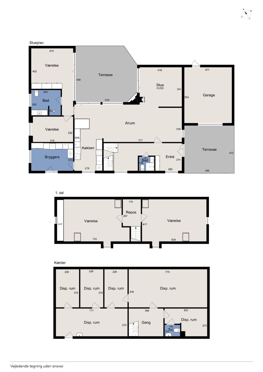 Underetage med toilet, "gæsteværelse", stort alrum og stort depotrum/værksted med udvendig trappe, flere disponible rum (opbevaring) og fjernvarmeinstallation.