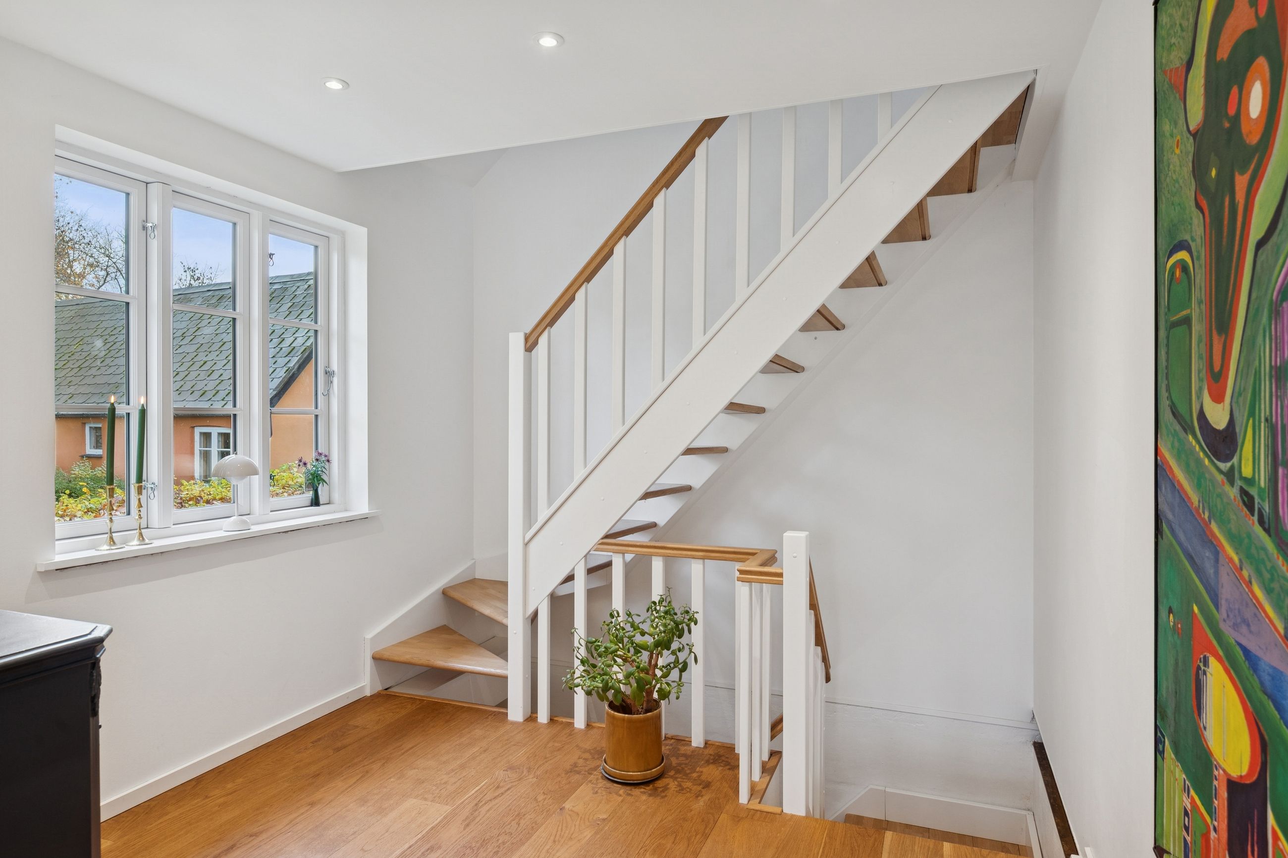 Huset indeholder: stor entre med indgang til badeværelse, trappe til underetage og 1. sal og indgang til stue.