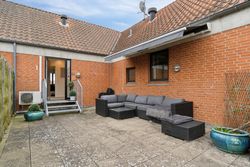Man ankommer til lejligheden via den store fælles tagterrasse , man deler med naboen.