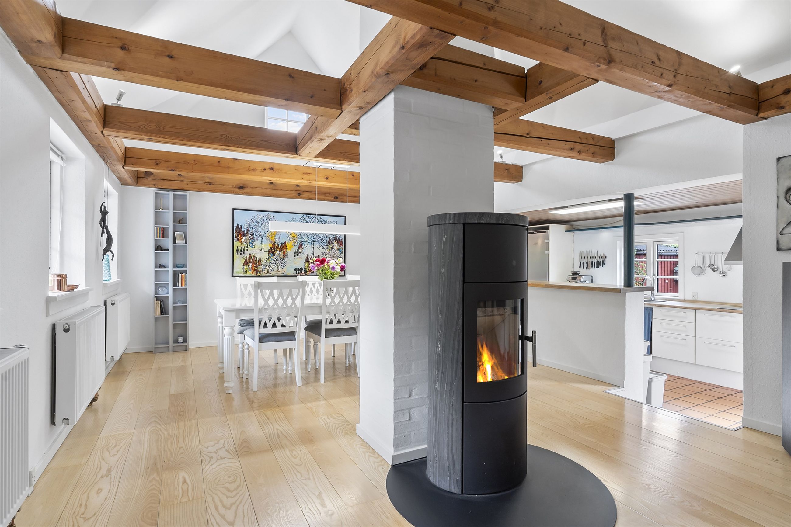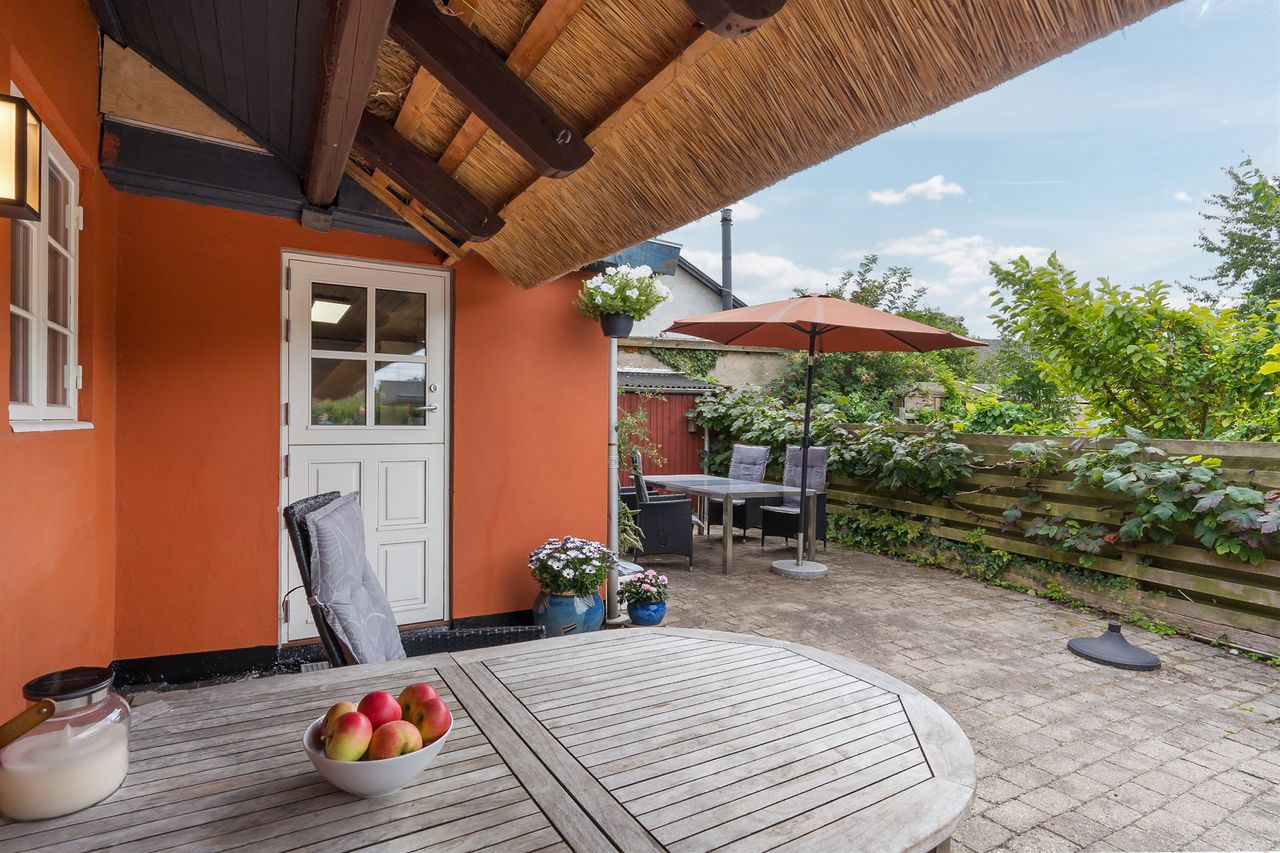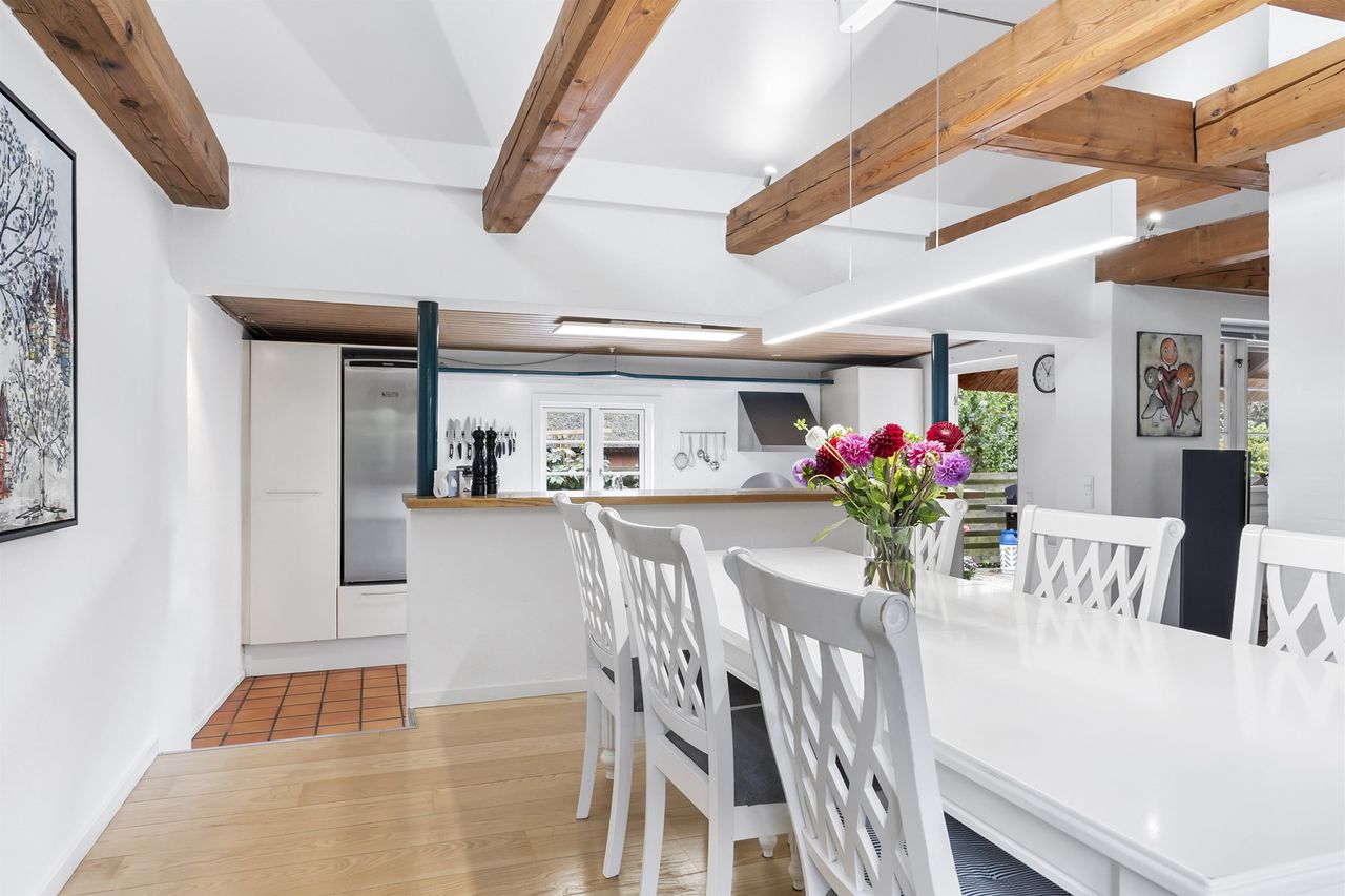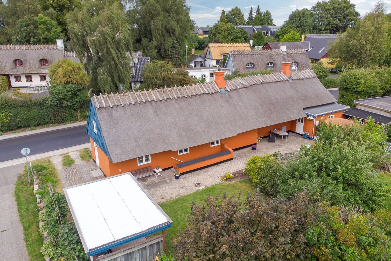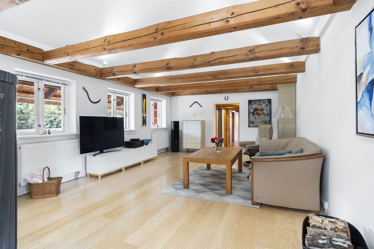 Boligen fremstår med et stråtag fra 2018, der fik ny mønning i 2023, hvilket sikrer mange års holdbarhed og ikke mindst et klassisk, indbydende udtryk. Inde i huset mærkes straks atmosfæren, særligt i den rummelige stue med loft-til-kip og fritliggende bjælker, gavlvindue og en nyere brændeovn, som alt sammen blev etableret i 2021. Der er flotte trægulve i stuen, som er lagt i 2012.