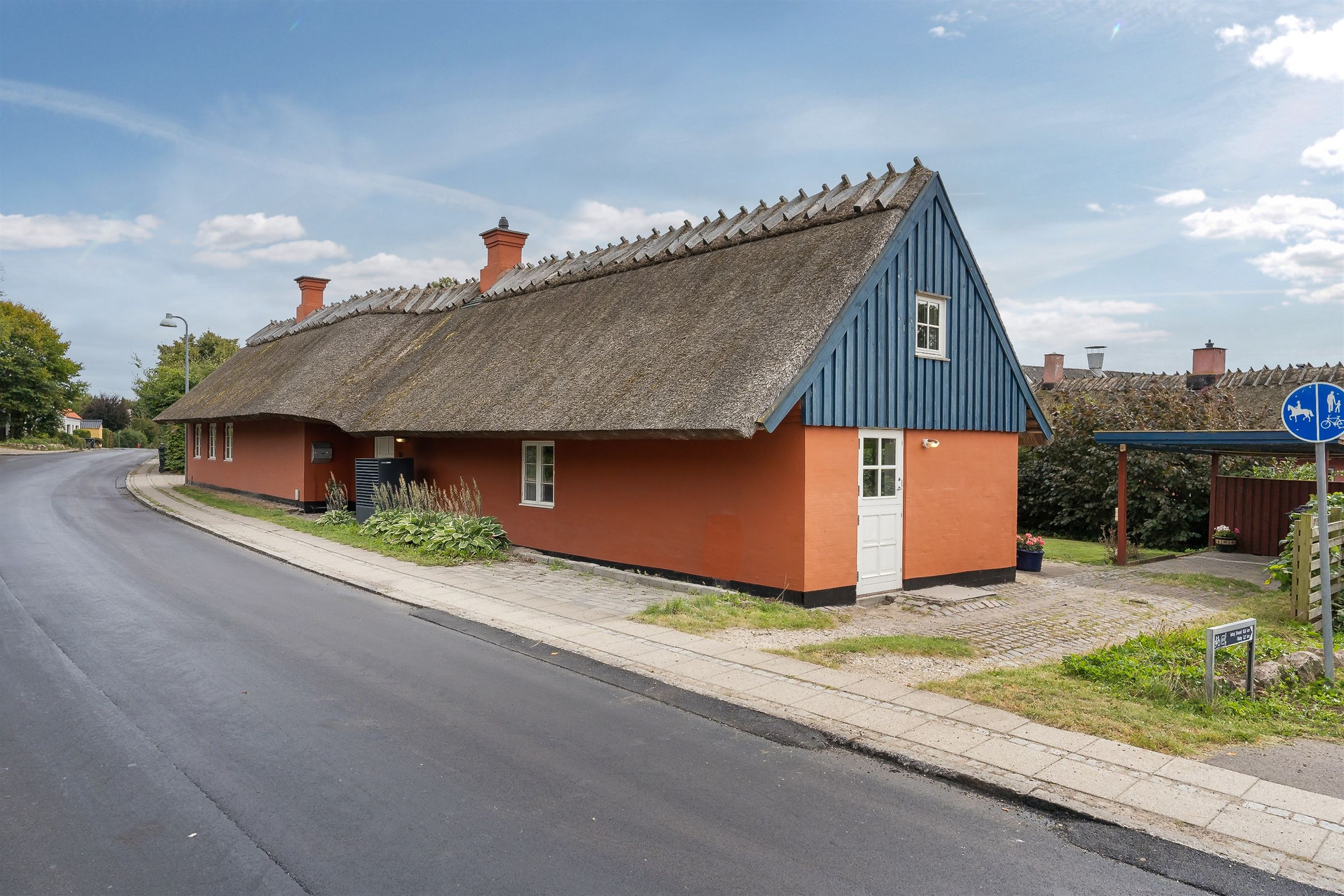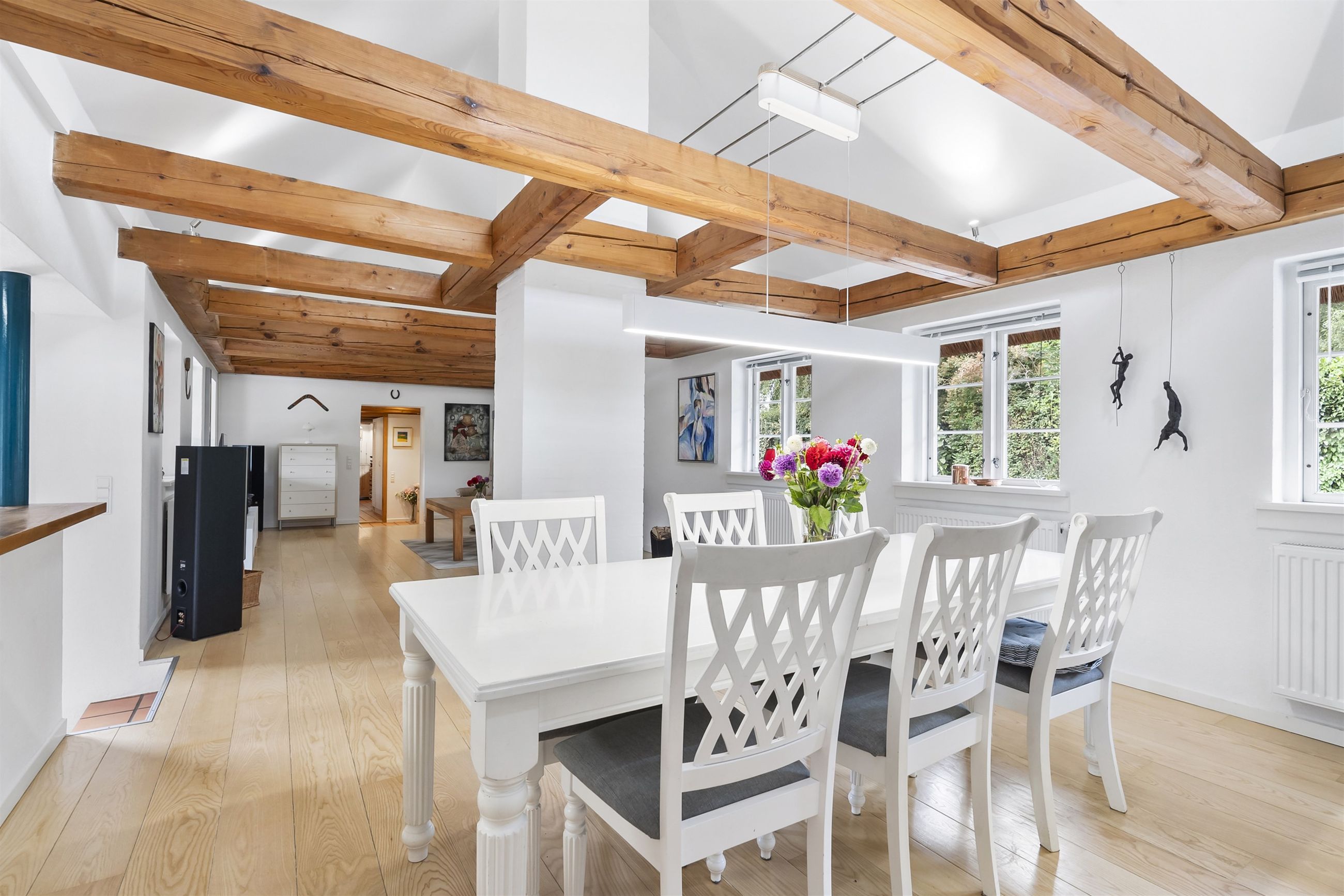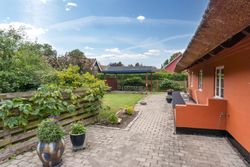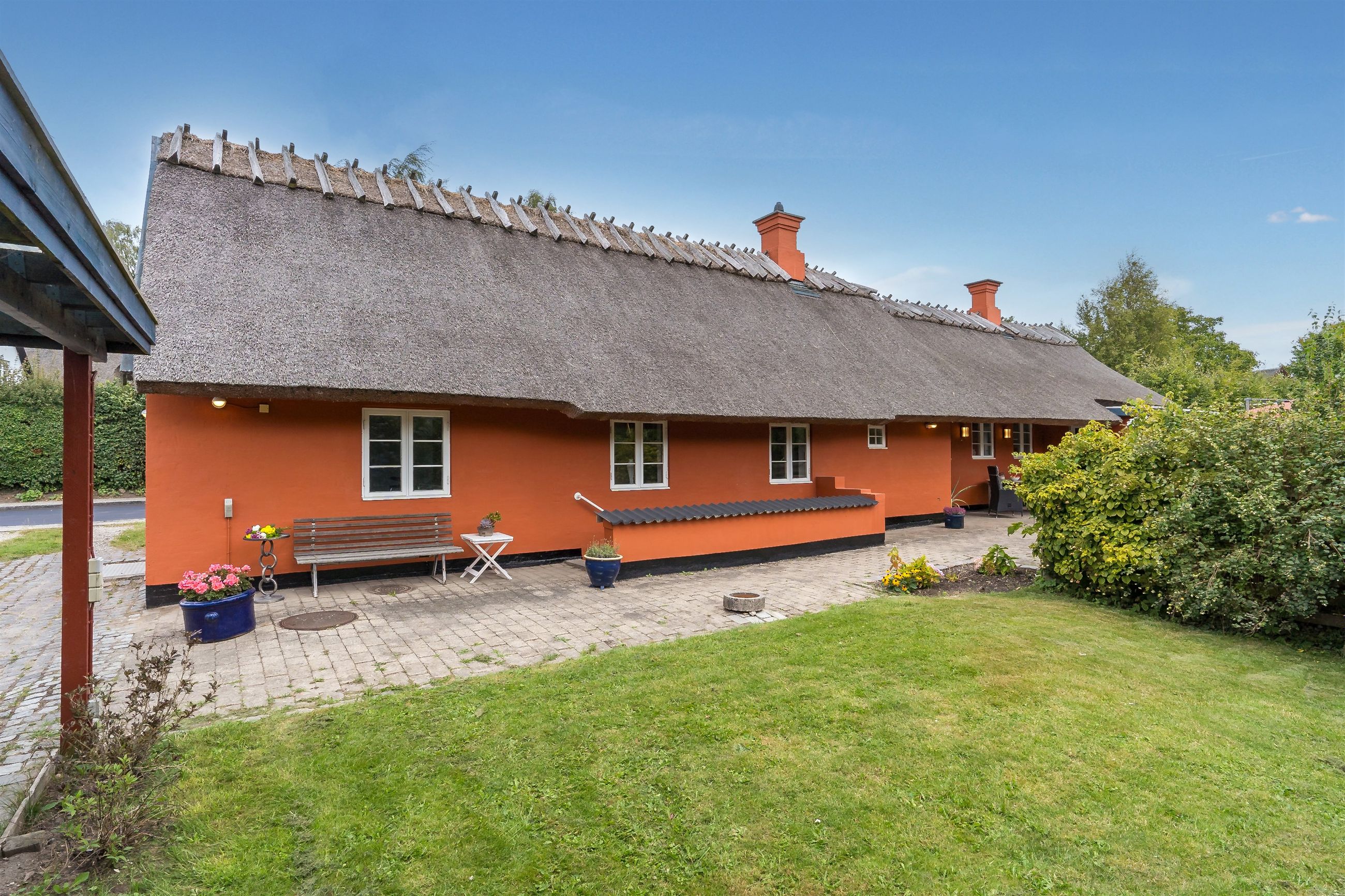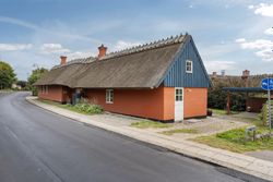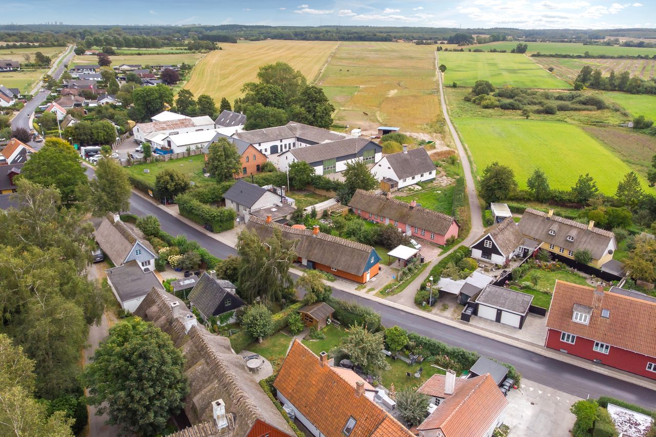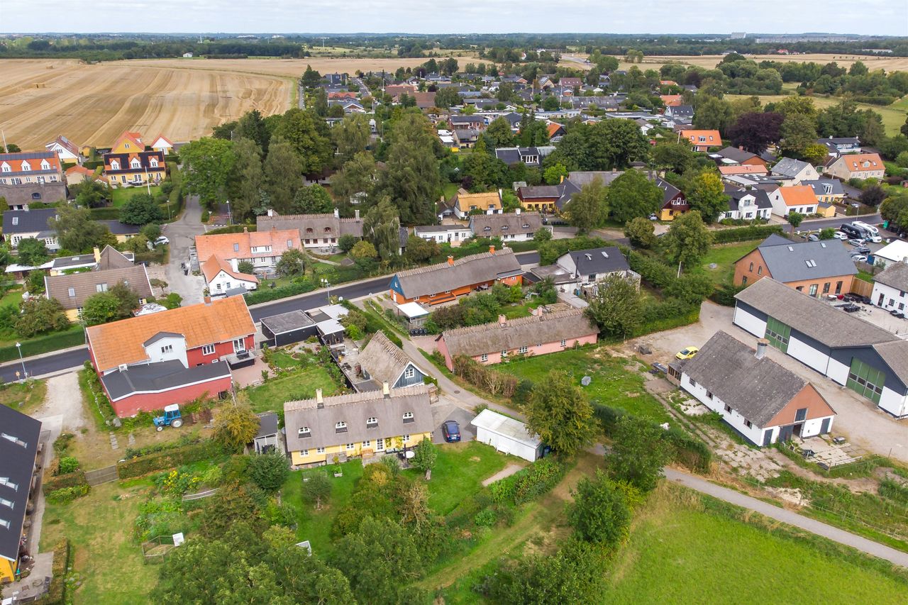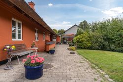 Boligen fremstår med et stråtag fra 2018, der fik ny mønning i 2023, hvilket sikrer mange års holdbarhed og ikke mindst et klassisk, indbydende udtryk. Inde i huset mærkes straks atmosfæren, særligt i den rummelige stue med loft-til-kip og fritliggende bjælker, gavlvindue og en nyere brændeovn, som alt sammen blev etableret i 2021. Der er flotte trægulve i stuen, som er lagt i 2012.