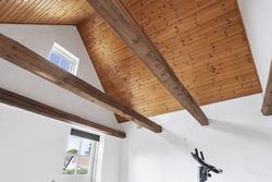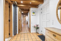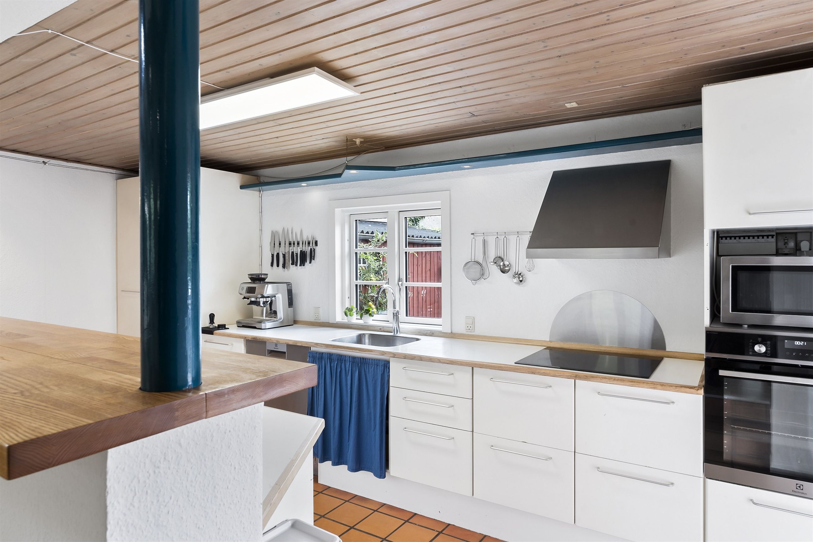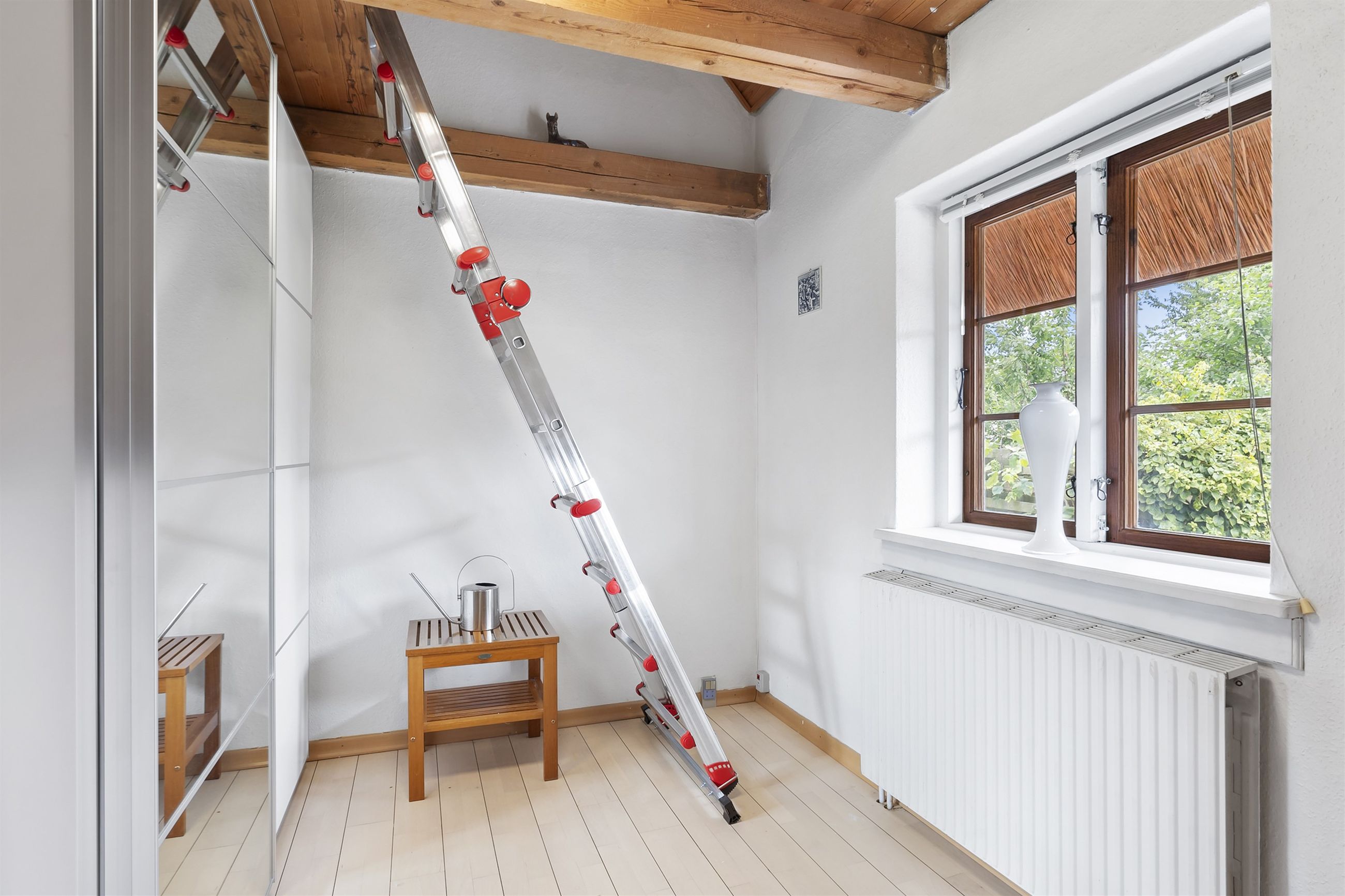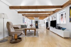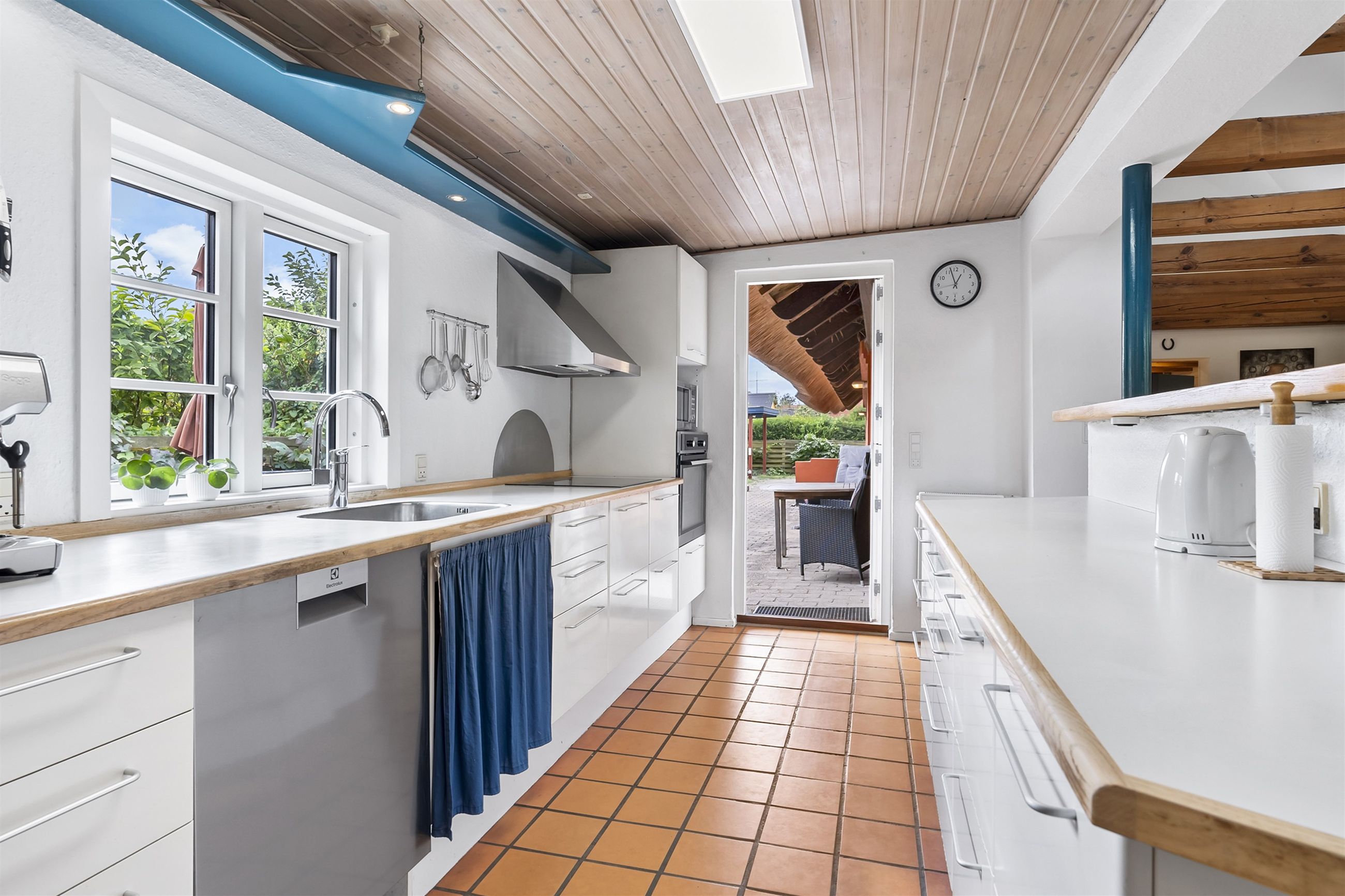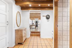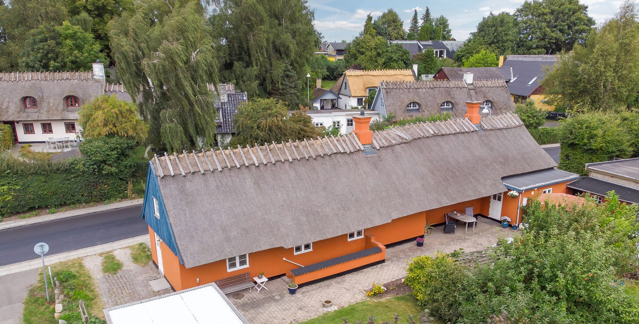 Boligen fremstår med et stråtag fra 2018, der fik ny mønning i 2023, hvilket sikrer mange års holdbarhed og ikke mindst et klassisk, indbydende udtryk. Inde i huset mærkes straks atmosfæren, særligt i den rummelige stue med loft-til-kip og fritliggende bjælker, gavlvindue og en nyere brændeovn, som alt sammen blev etableret i 2021. Der er flotte trægulve i stuen, som er lagt i 2012.
