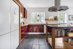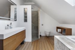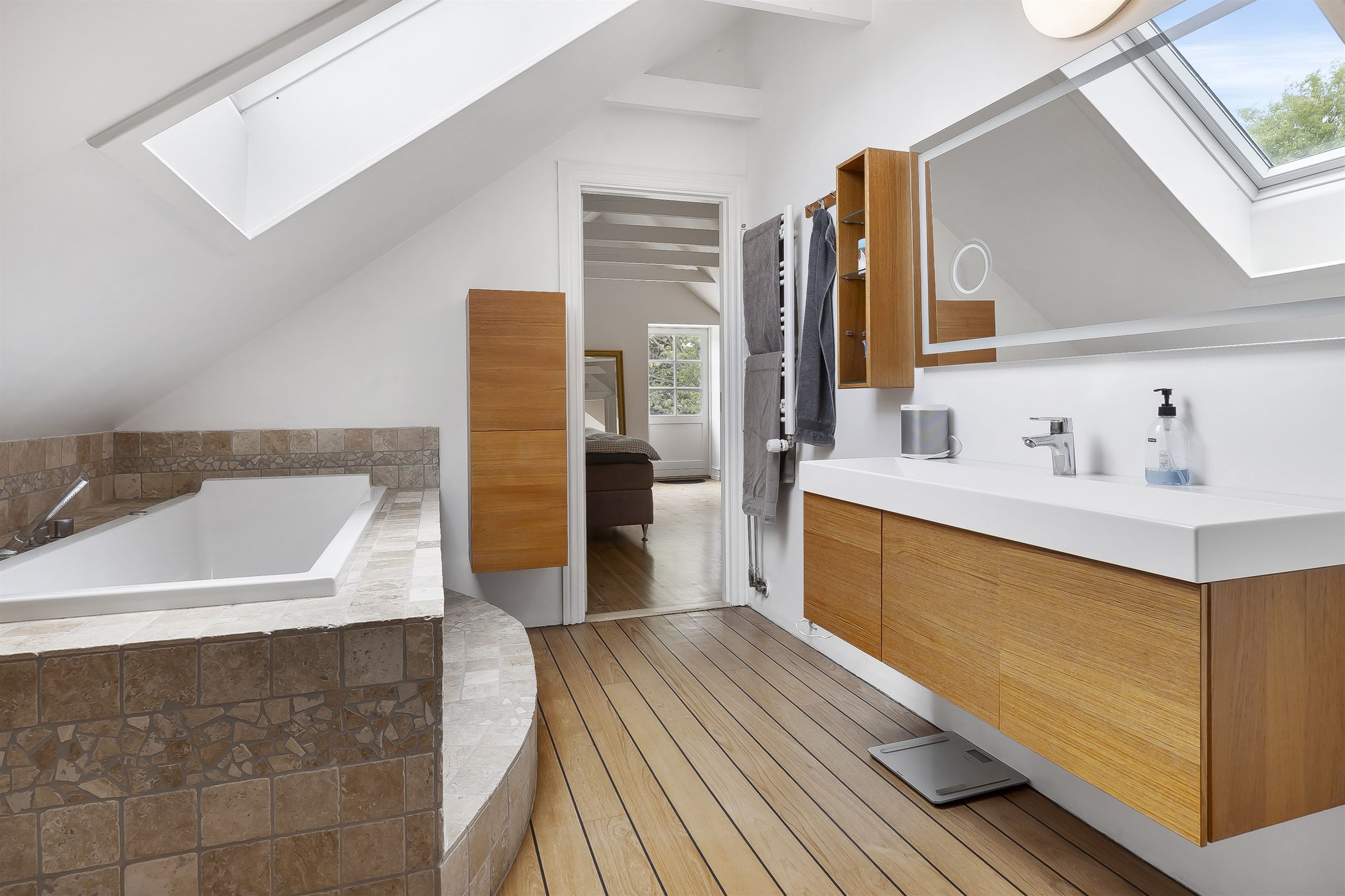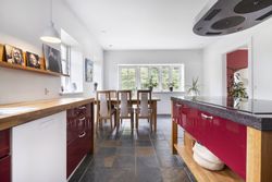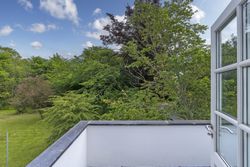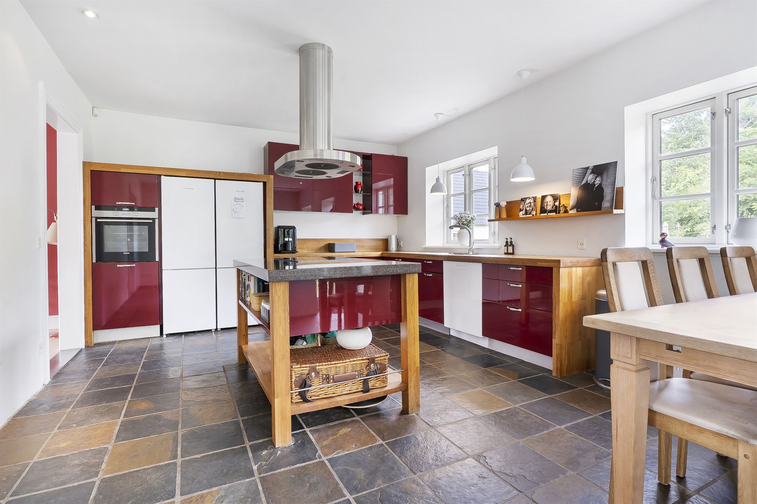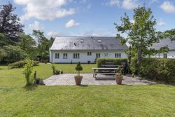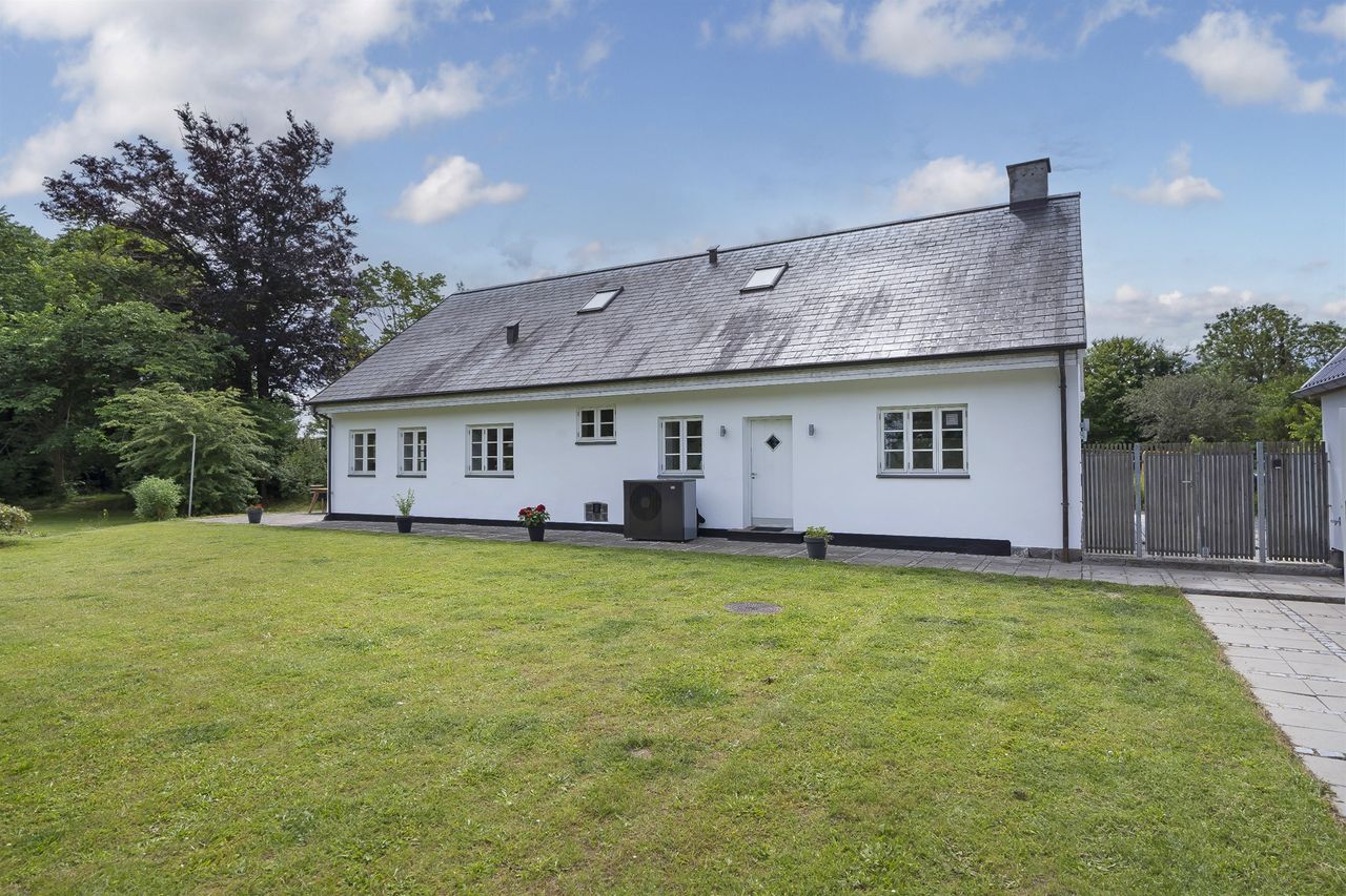 Hovedhusets tagbelægning er naturskiffer og opvarmes med luft-til-vand varmepumpe.