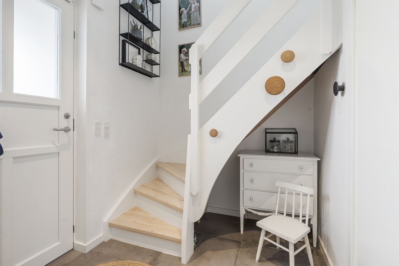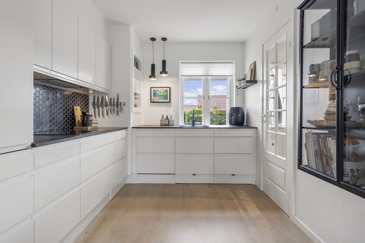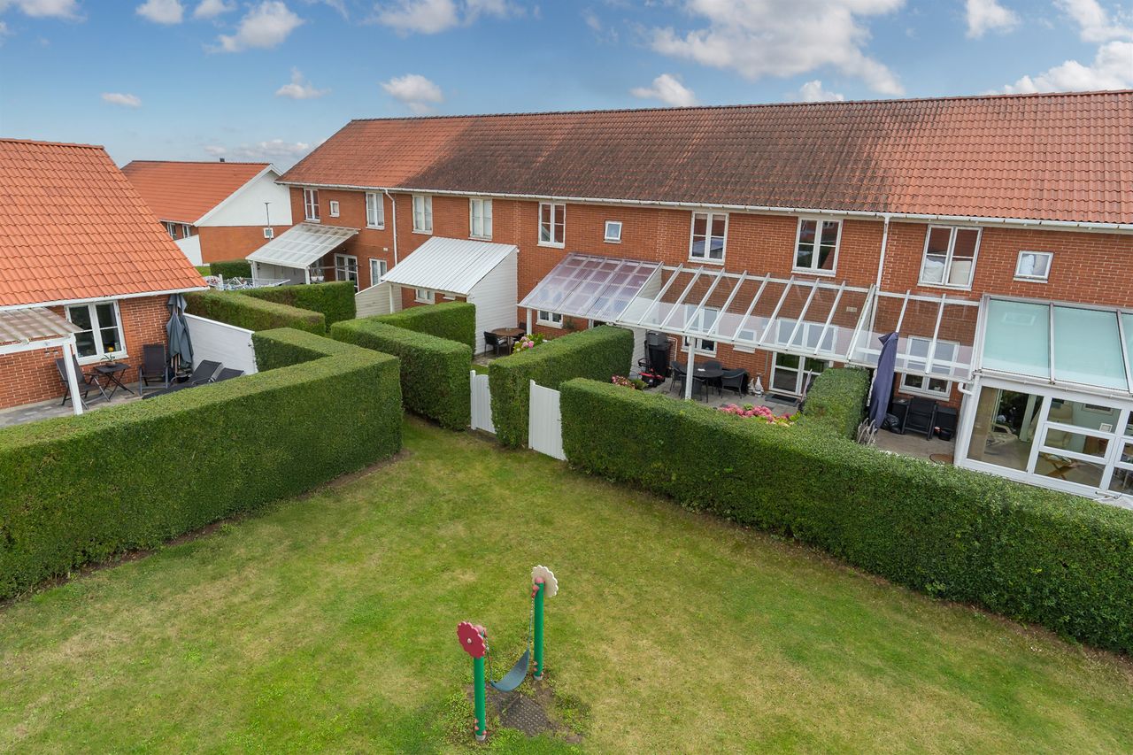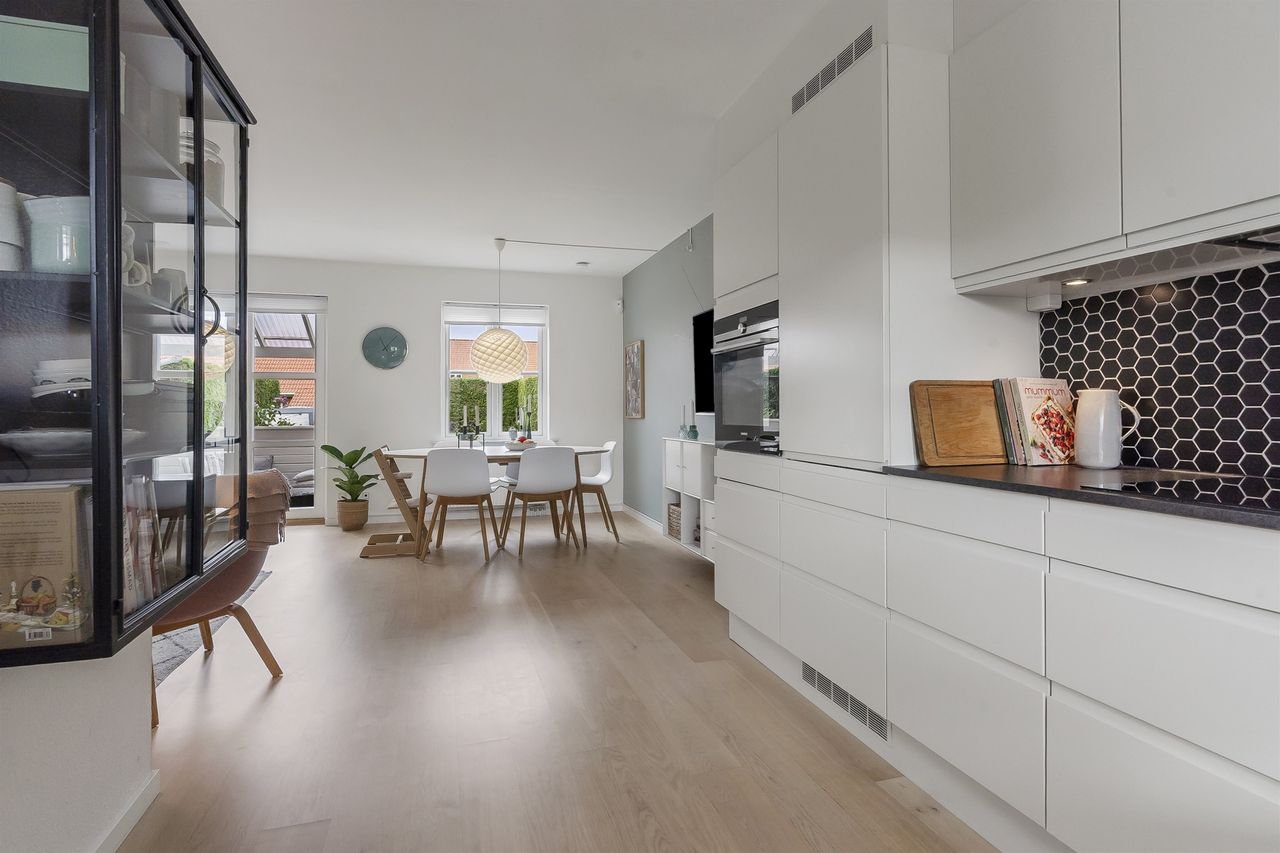 Moderniseret rækkehus i Nøddelunden - med egen indkørsel Vælger man at bosætte sig i Nøddelunden, er man tæt på stort set det hele. Her er gåafstand til børneinstitution samt Netto. De gode stisystemer i Smørum, fører dig ligeledes hurtigt ned til Boesagerskolen, Smørum Centret, hvor der findes indkøb, pizzeria, bager, frisør og meget mere. Ved siden af Centret findes Smørums Idrætspark, som har et hav af sportsfaciliteter, ligeledes er Smørum Golfklub også tæt på. Nøddelunden er et familievenligt område med grønne områder, legepladser og meget mere. Huset har over en årrække gennemgået en modernisering, som kan ses ved første øjekast. Der er blandt andet udskiftet vinduer i 2021. Køkken og gulve fra 2018, fjernvarme unit er udskiftet i 2024. Gæstetoilet i stueplan er etableret i 2018. Rækkehuset har parkering på egen grund- til gæster er der parkeringsplads lige ved siden af huset, hvor der er gode parkeringsforhold. Der er ligeledes grønt område med legeplads til de små, lige ved huset. Huset indeholder: Entre med trappe op til 1. sal samt adgang til husets gæstetoilet og til køkkenet. Husets køkken er utrolig flot og tidløst, og her er god arbejdsplads samt plads til køkkengrejet. Fra køkkenet er der direkte adgang til den rummelige stue, som har et dejligt lysindfald. Herfra adgang til overdækket terrasse og haven 1. sal byder på et stort værelse som pt er opdelt i kontor og børneværelse, rummeligt soveværelse samt et stort badeværelse med bruseniche. Adgang til loftrum, med god plads til opbevaring.