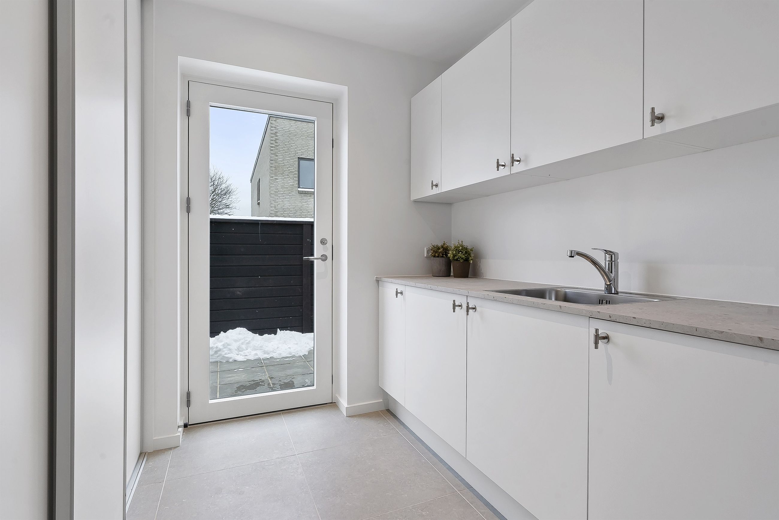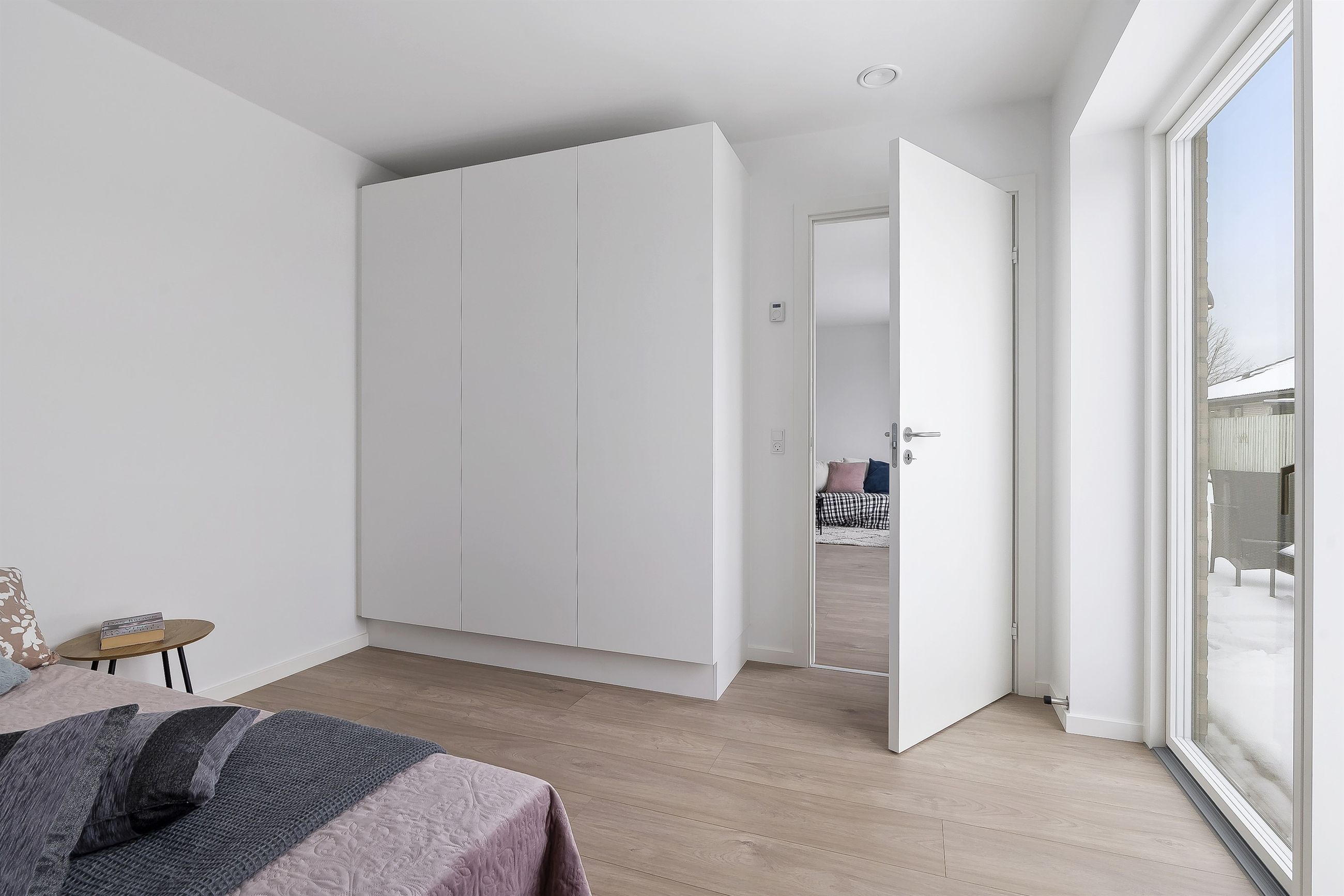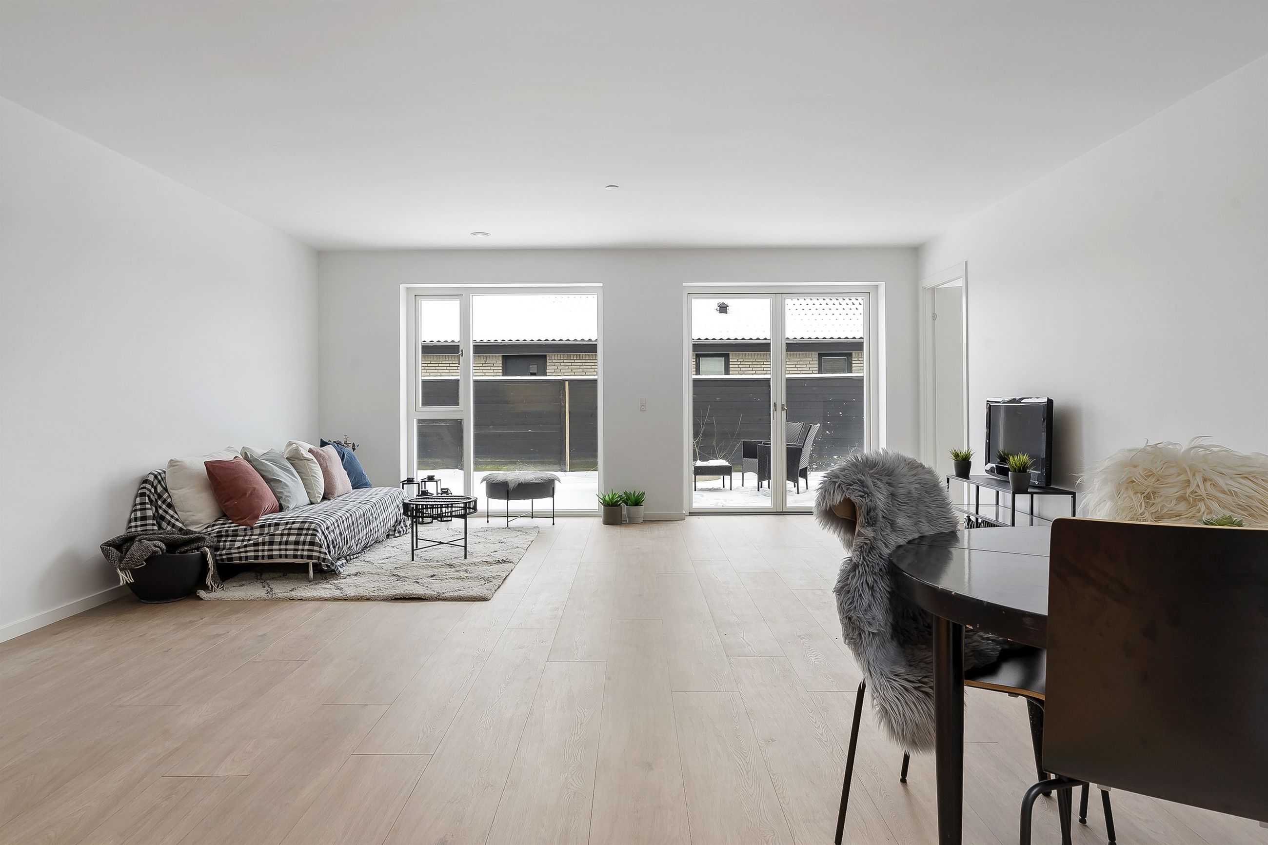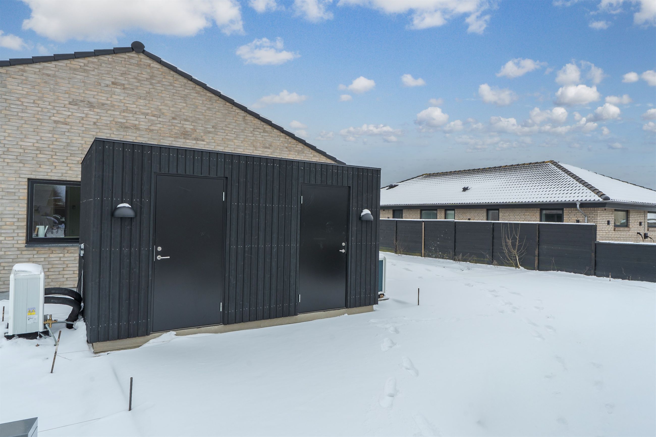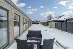 Halvt dobbelthus på 121 m2, opført i ét plan og lever op til BR20 laveneergi, som det står beskrevet i byggereglementet, hvilket sikrer et godt indeklima og et lavt energiforbrug. Huset opvarmes med gulvvarmeanlæg via fjernvarme og er derudover udstyret med varmegenvindingsanlæg fra Nilan og regnvandsopsamlingsanlæg. Materialevalget er harmonisk afstemt således, at der gennem hele huset er holdt en "rød tråd" hvor der er sammenhæng og harmoni mellem bordplader, fronter, gulvbelægning og farvevalg etc. Planløsningen indeholder: Rummelig bryggers med vaskefaciliteter og teknik. HTH køkken i åben forbindelse med opholdsstue, i stuen er der god plads til indretning af både spisestue og sofaarrangement. Tre gode store soveværelser samt stort badeværelse.