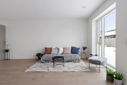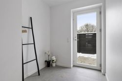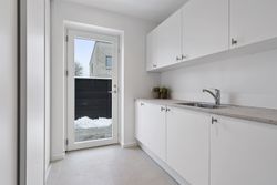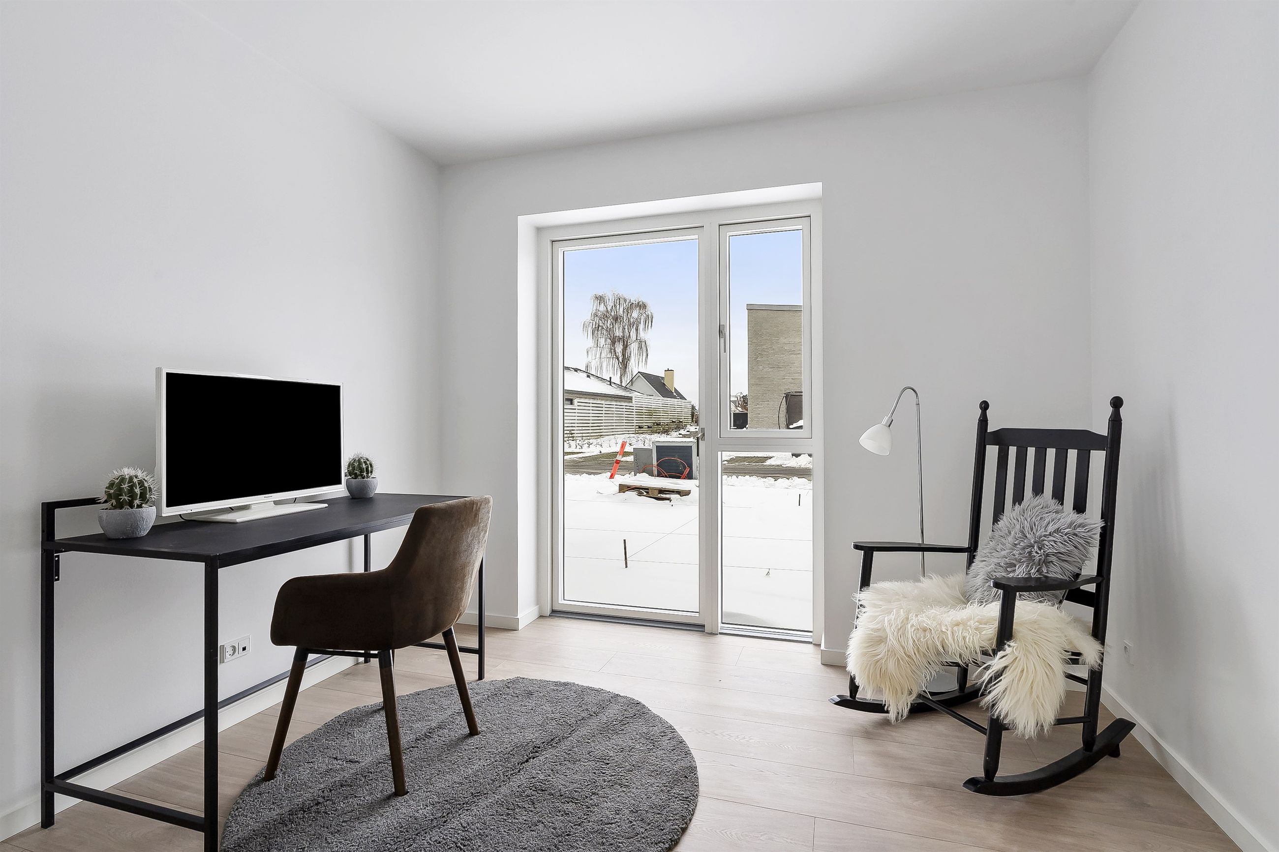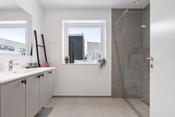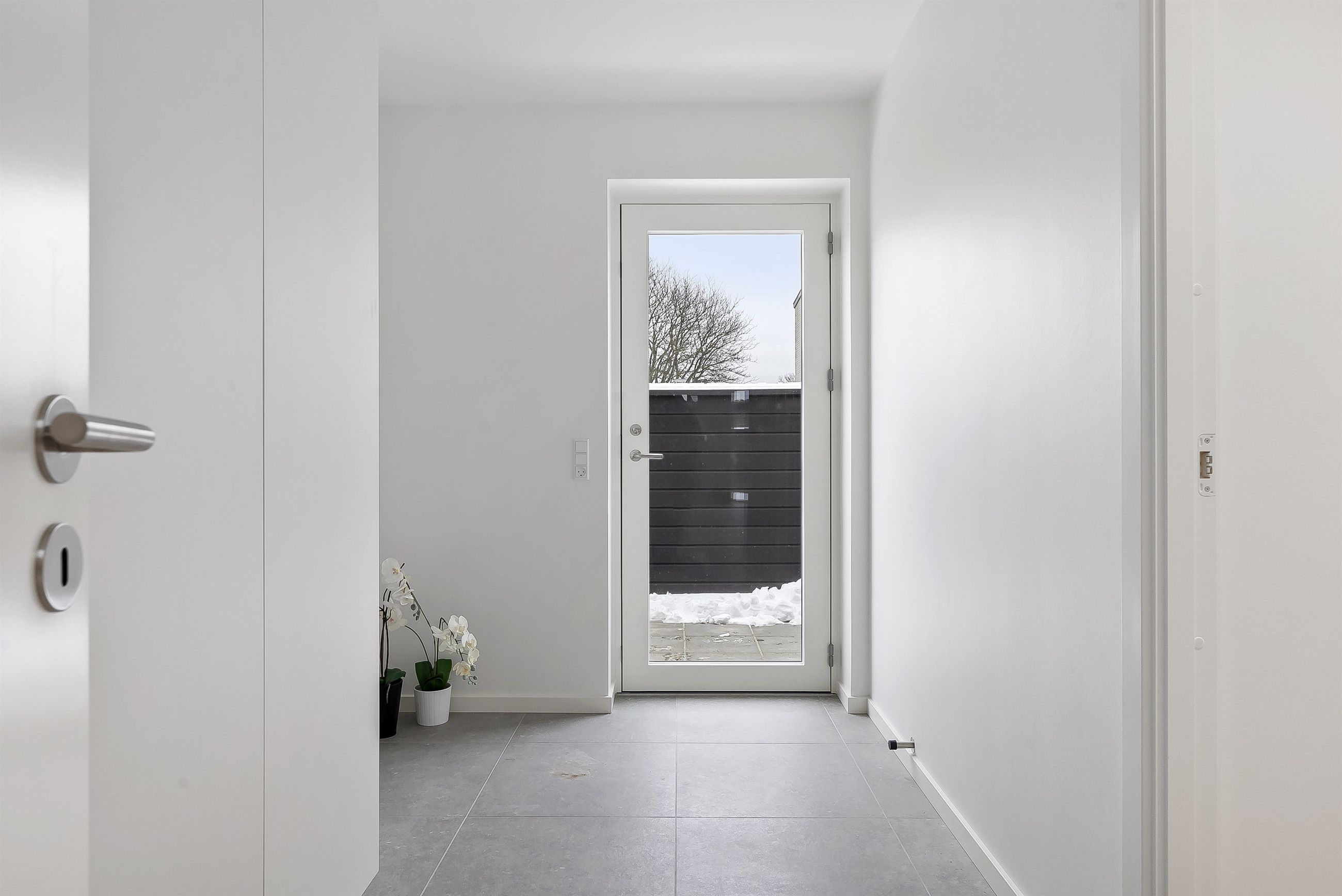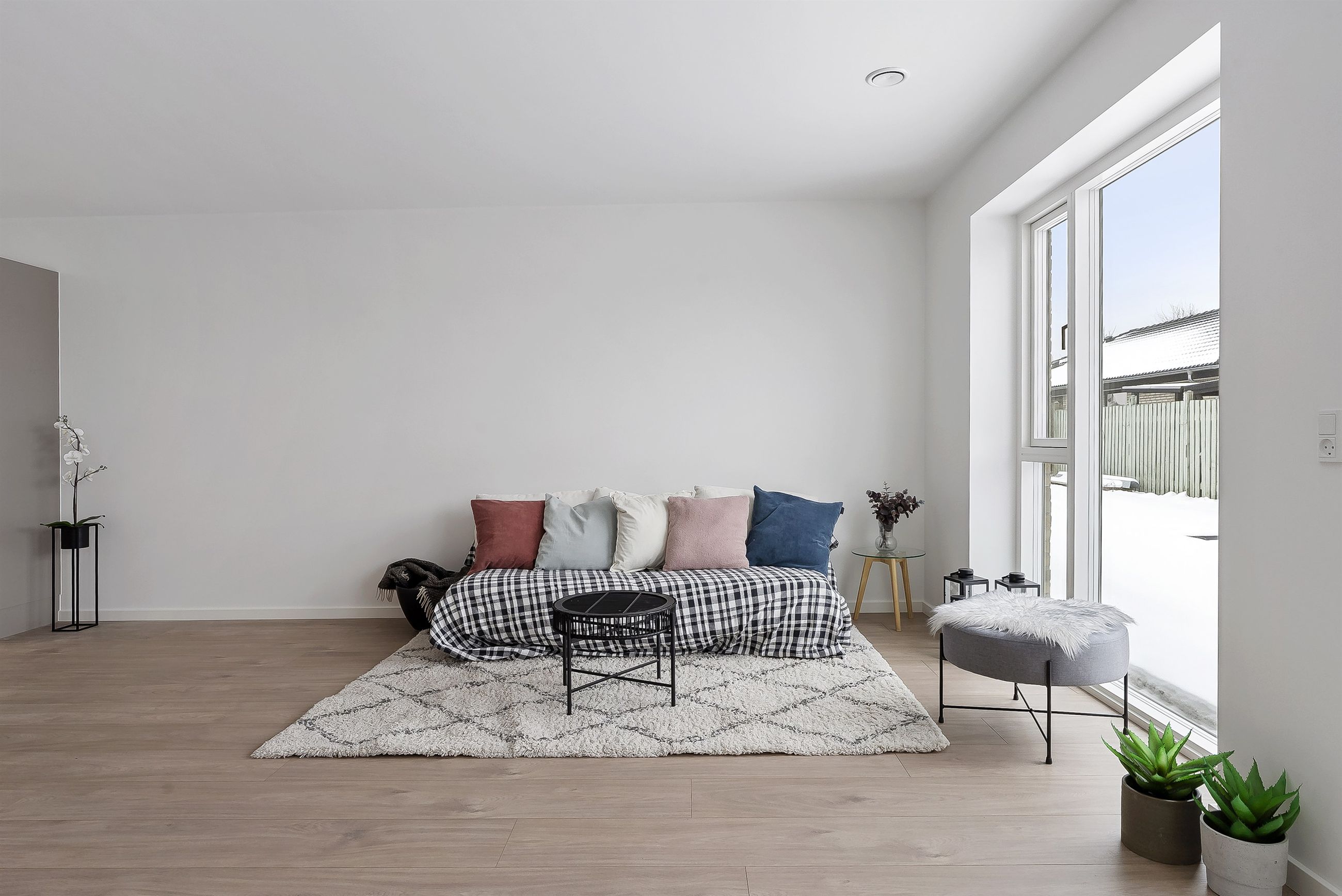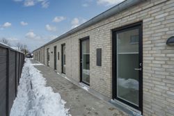 Halvt dobbelthus på 121 m2, opført i ét plan og lever op til BR20 laveneergi, som det står beskrevet i byggereglementet, hvilket sikrer et godt indeklima og et lavt energiforbrug. Huset opvarmes med gulvvarmeanlæg via fjernvarme og er derudover udstyret med varmegenvindingsanlæg fra Nilan og regnvandsopsamlingsanlæg. Materialevalget er harmonisk afstemt således, at der gennem hele huset er holdt en "rød tråd" hvor der er sammenhæng og harmoni mellem bordplader, fronter, gulvbelægning og farvevalg etc. Planløsningen indeholder: Rummelig bryggers med vaskefaciliteter og teknik. HTH køkken i åben forbindelse med opholdsstue, i stuen er der god plads til indretning af både spisestue og sofaarrangement. Tre gode store soveværelser samt stort badeværelse.
