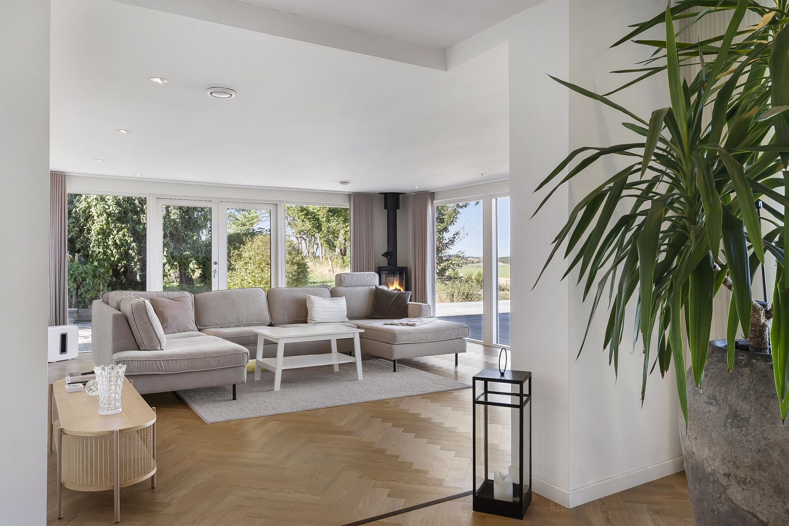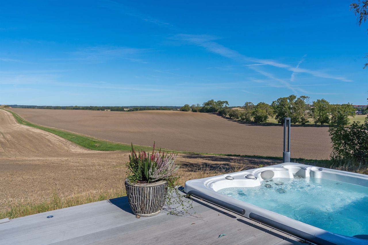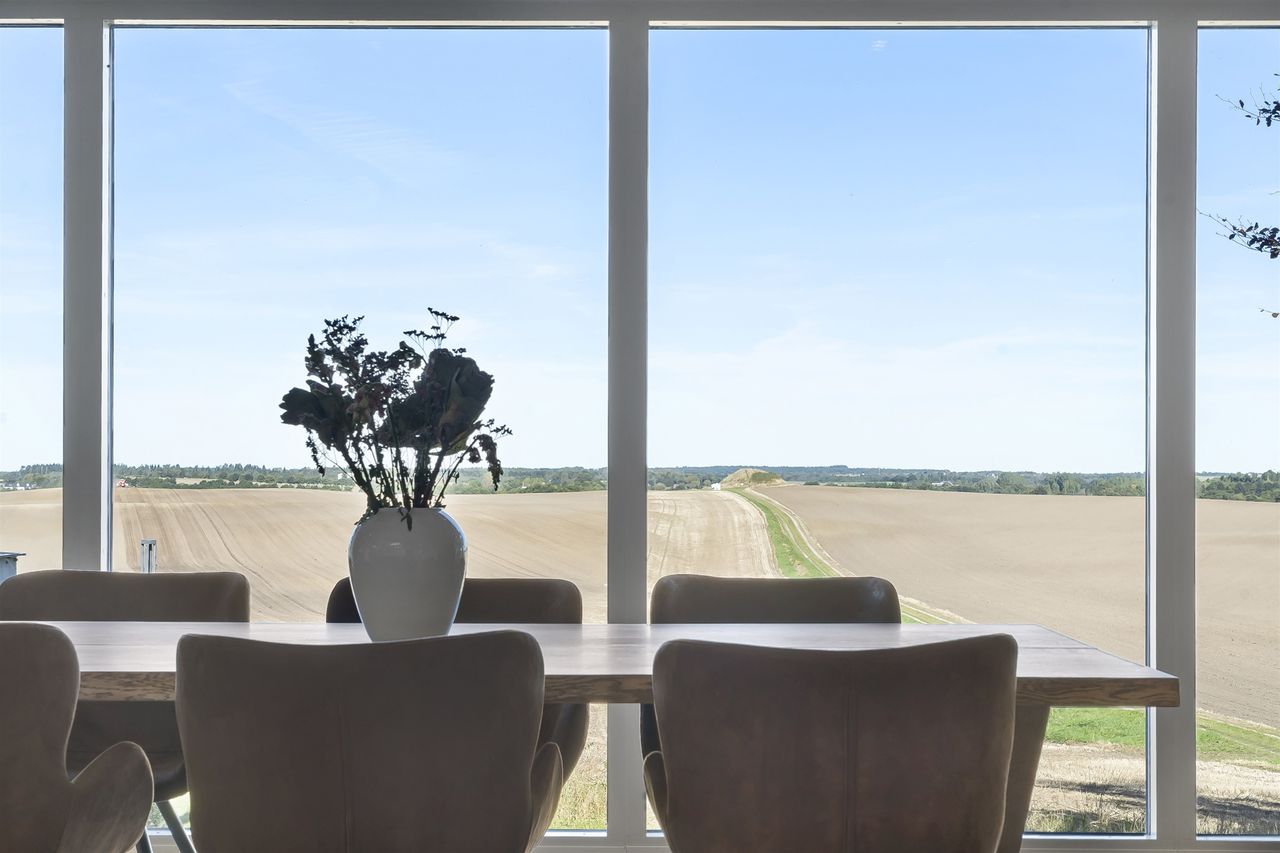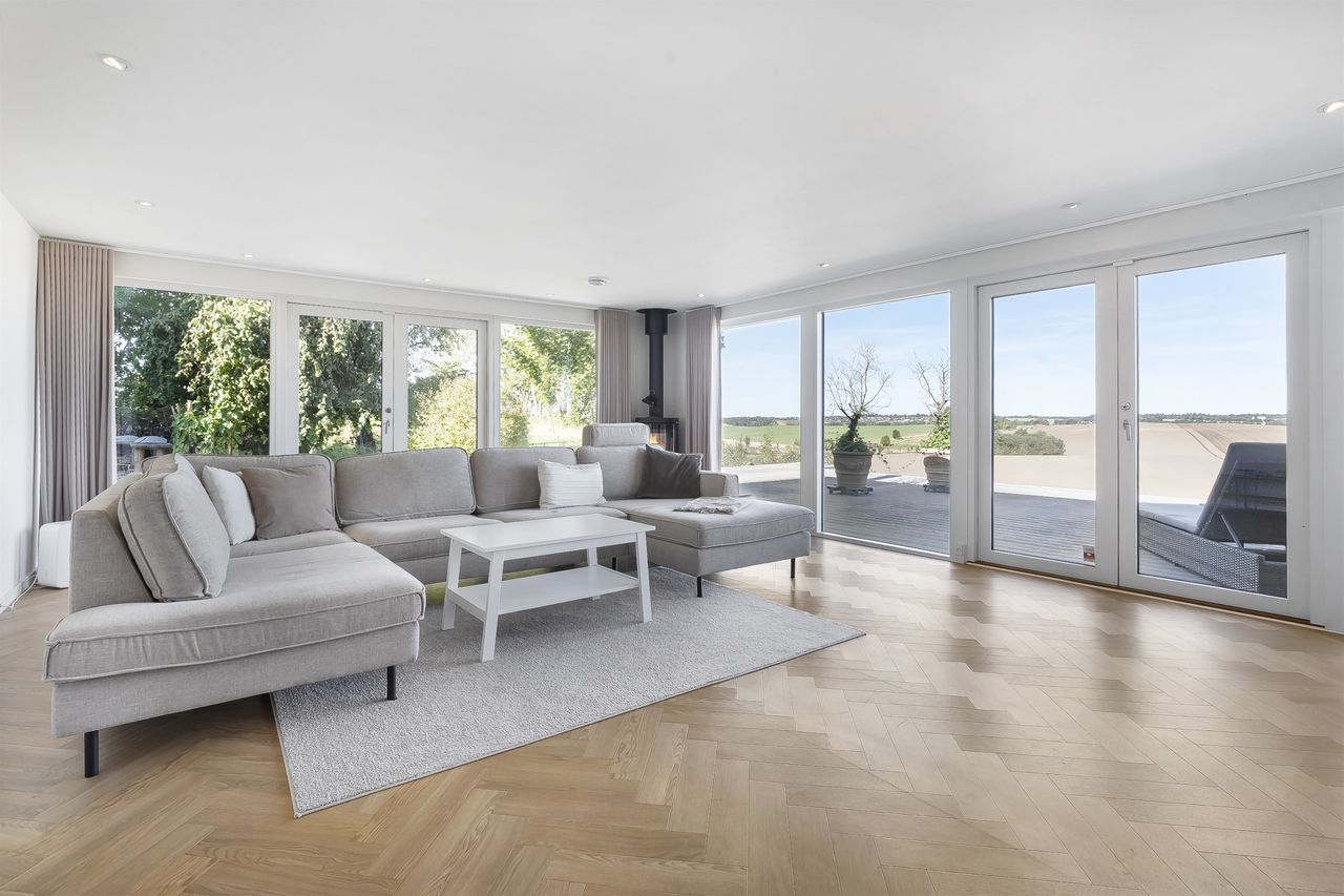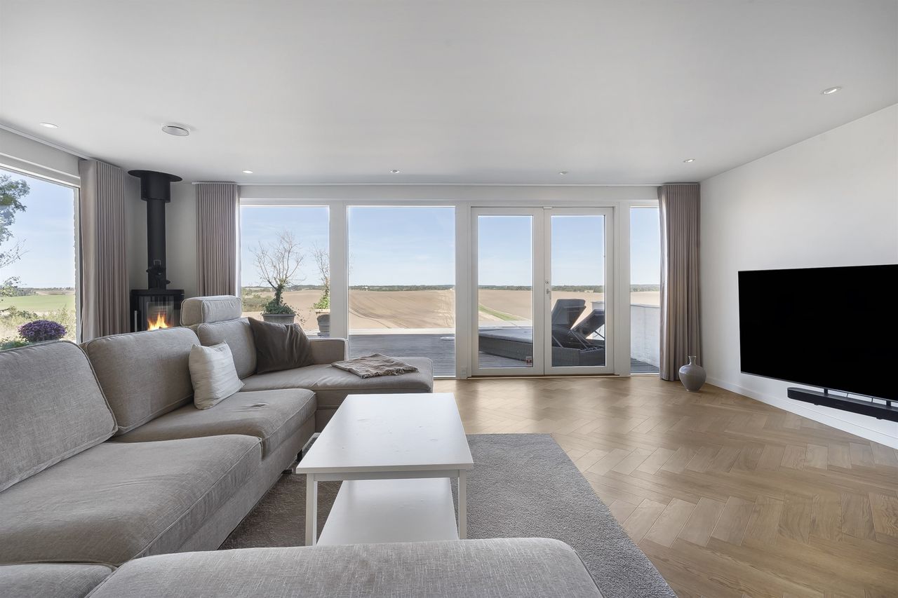 Dejlig lys opholdsstue med brændeovn og med super godt lysindfald fra de store vinduer, her er ligeledes panoramaudsigt over åbent landskab. Fra stuen er der udgang til stor vestvendt terrasse i komposit med masser af plads og udespa indbygget. Her er der rig mulighed for hygge med venner og familie, og samtidig nye udsigten.