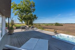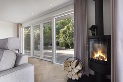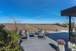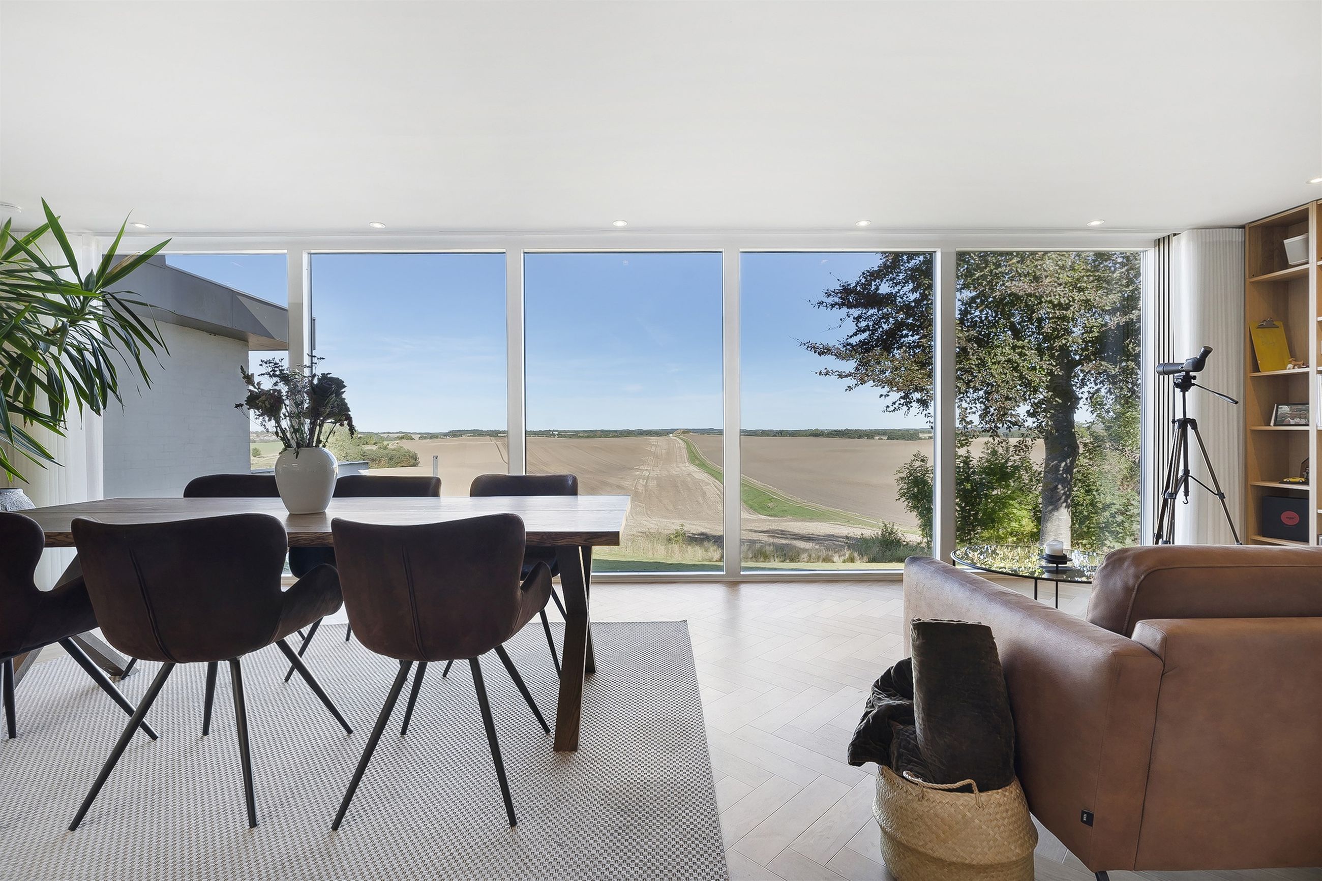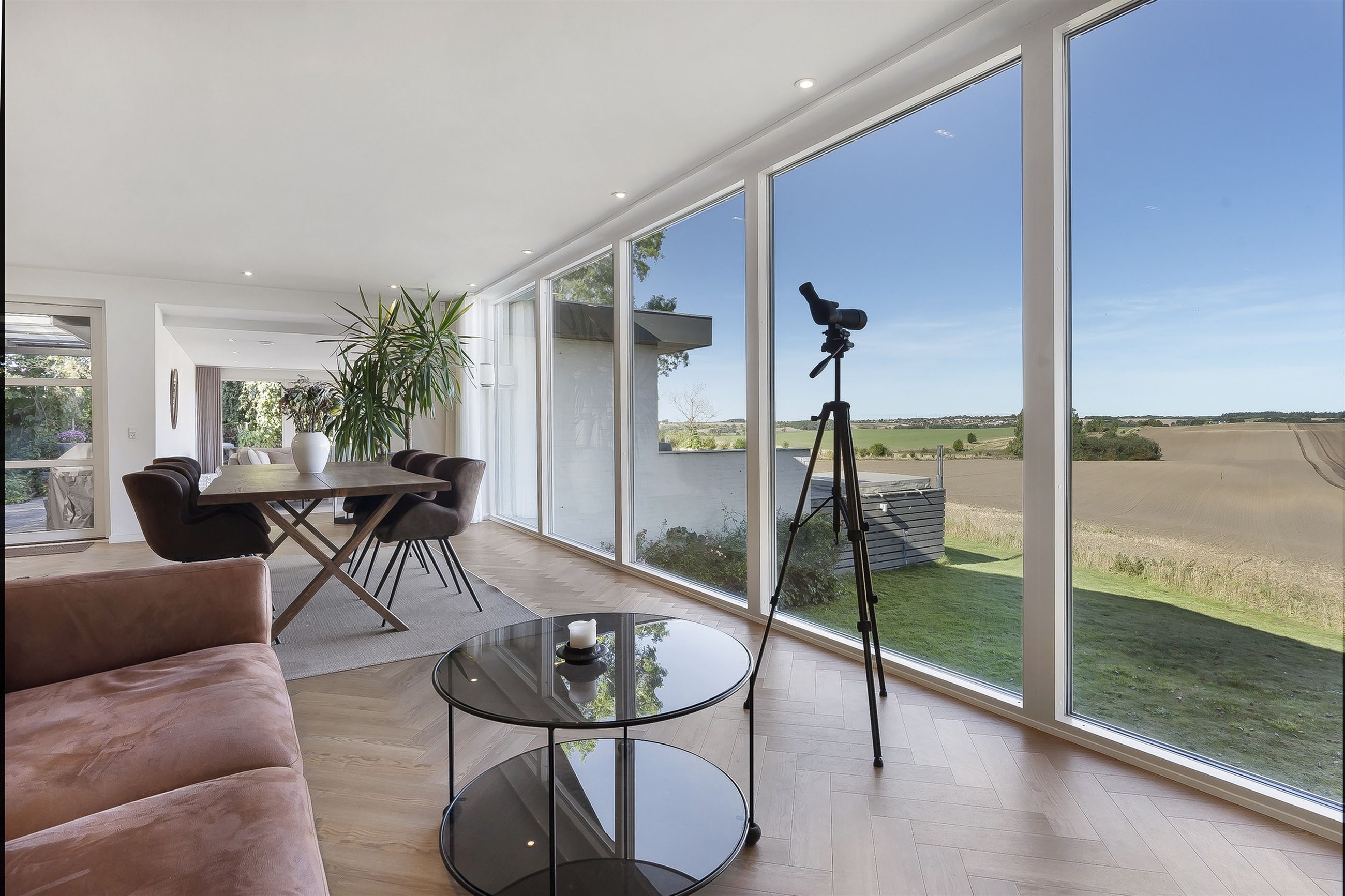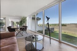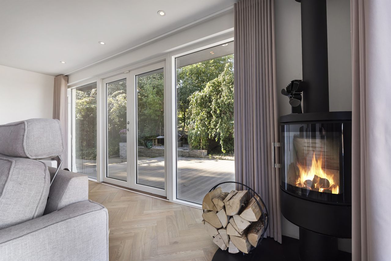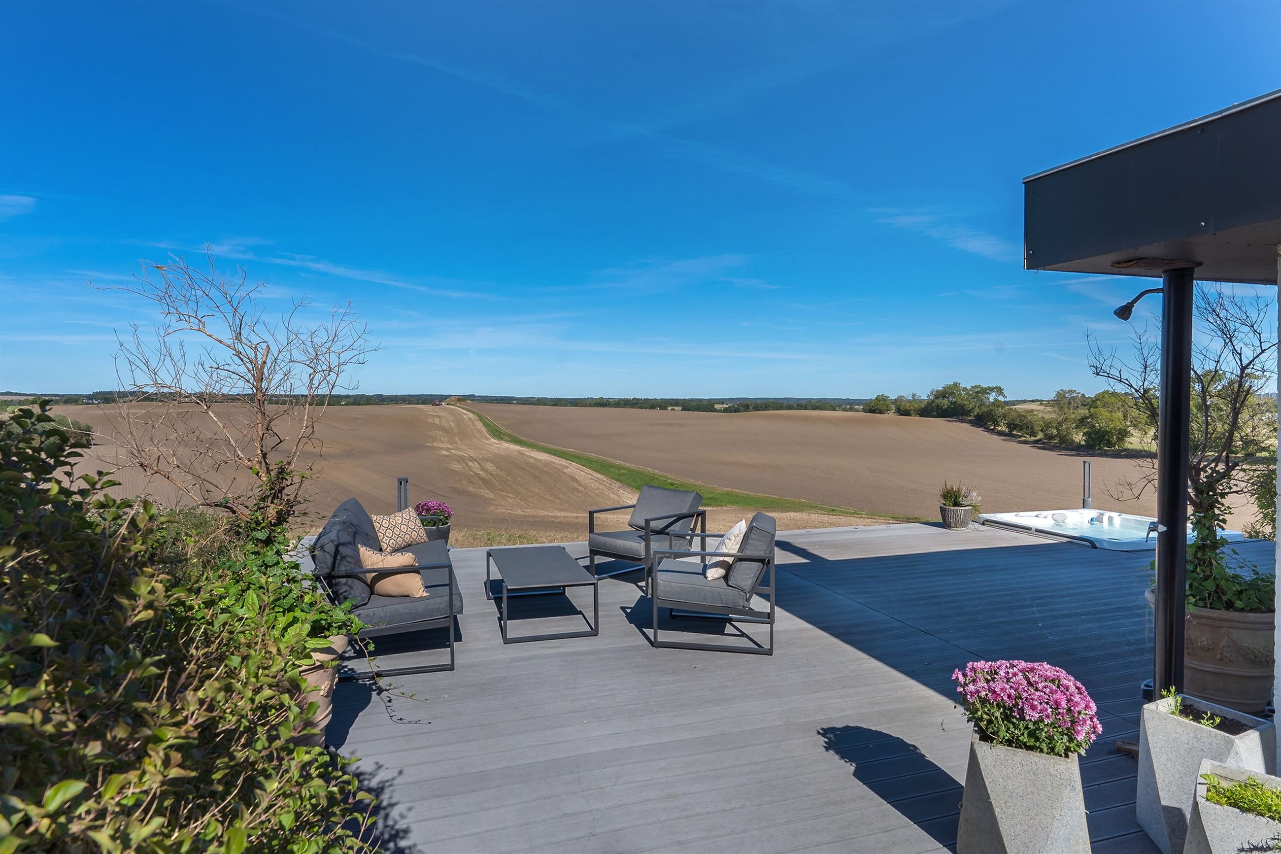 Dejlig lys opholdsstue med brændeovn og med super godt lysindfald fra de store vinduer, her er ligeledes panoramaudsigt over åbent landskab. Fra stuen er der udgang til stor vestvendt terrasse i komposit med masser af plads og udespa indbygget. Her er der rig mulighed for hygge med venner og familie, og samtidig nye udsigten.