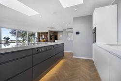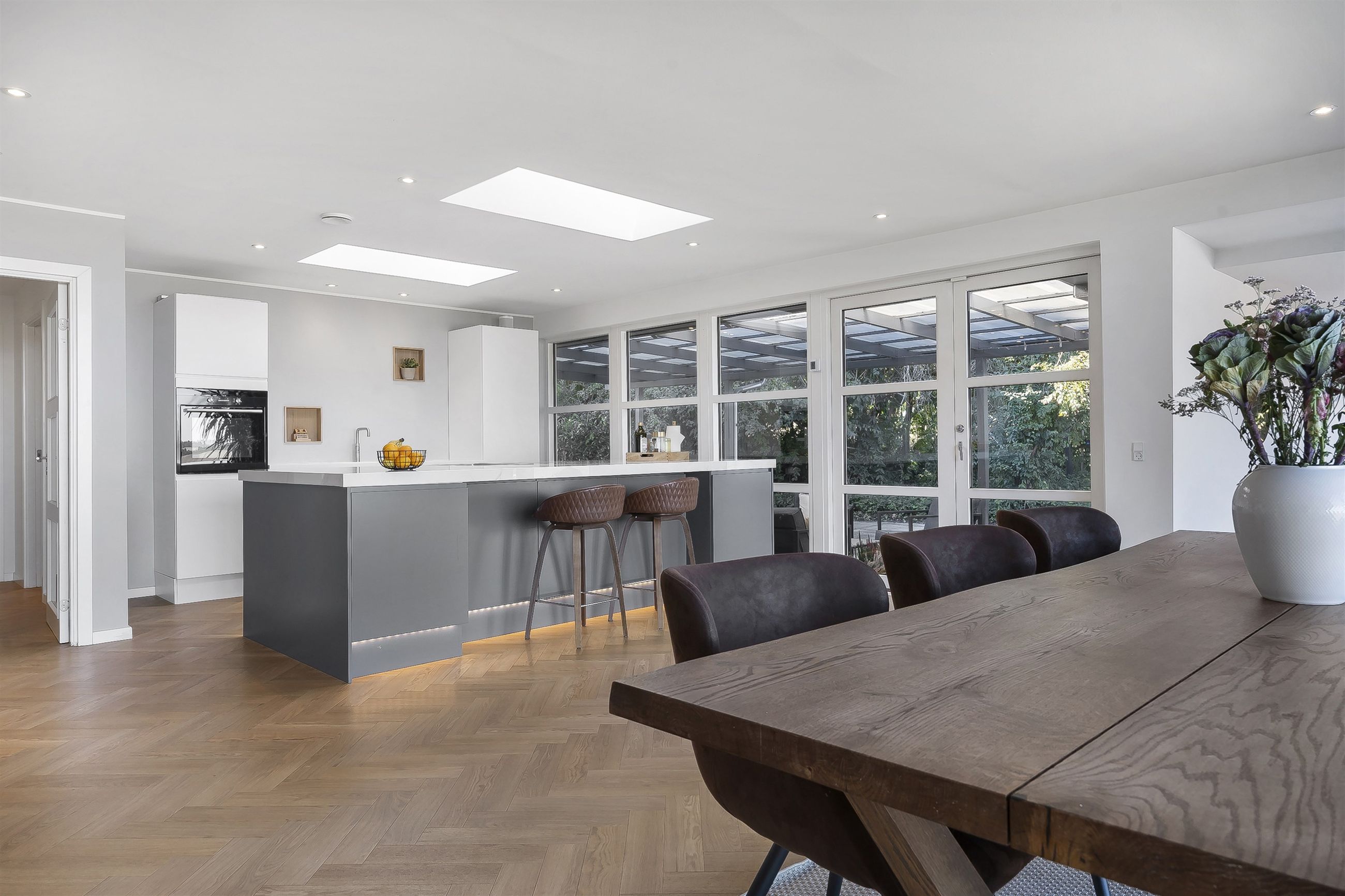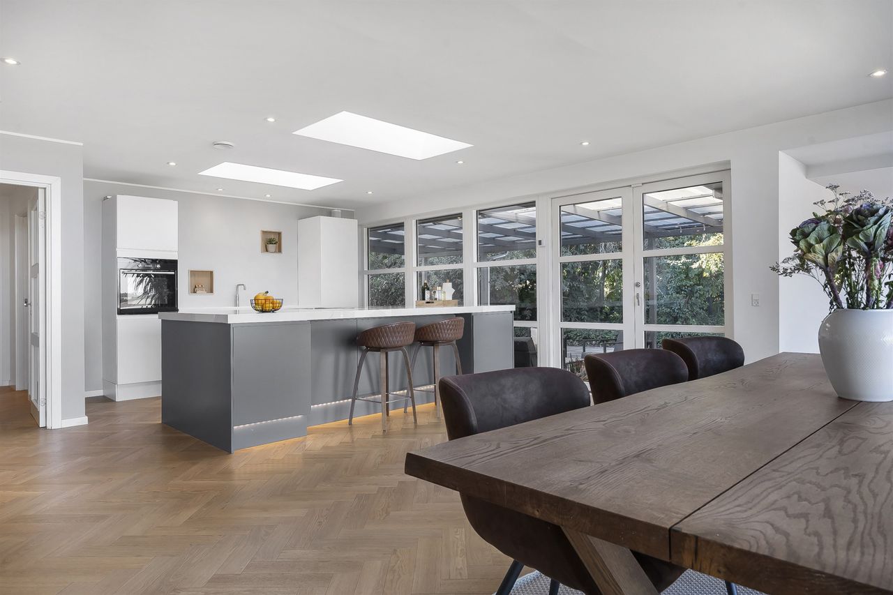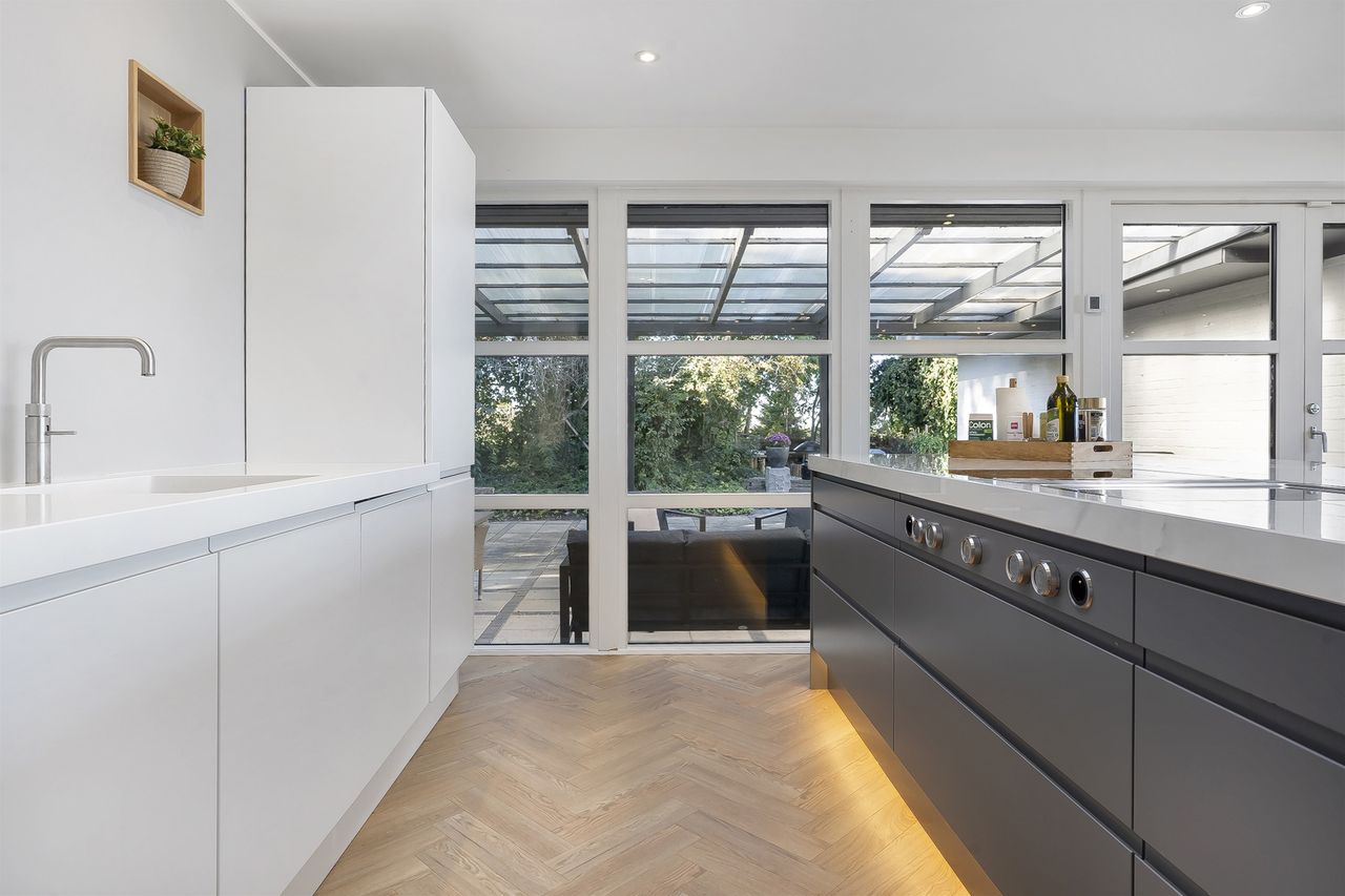 Åben entre som fører direkte ind til et kæmpe køkken-alrum. Køkkenet fremstår åbent og lyst, bl.a. med ovenlysvinduer, vinduespartier mod overdækket vestvendt fliseterrasse og ikke mindst med gulv-til-loft vinduespartier med panoramaudsigt. Køkkenet er med grebsløst design med hvide skuffer og skabslåger på den ene side og med antracit stor køkken-ø i den anden side, som står godt i kontrast i de mørke farver. Der er installeret luft-til-luft varmepumpe i køkkenet.