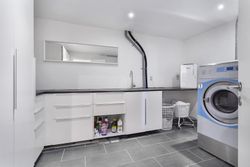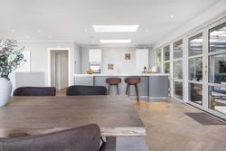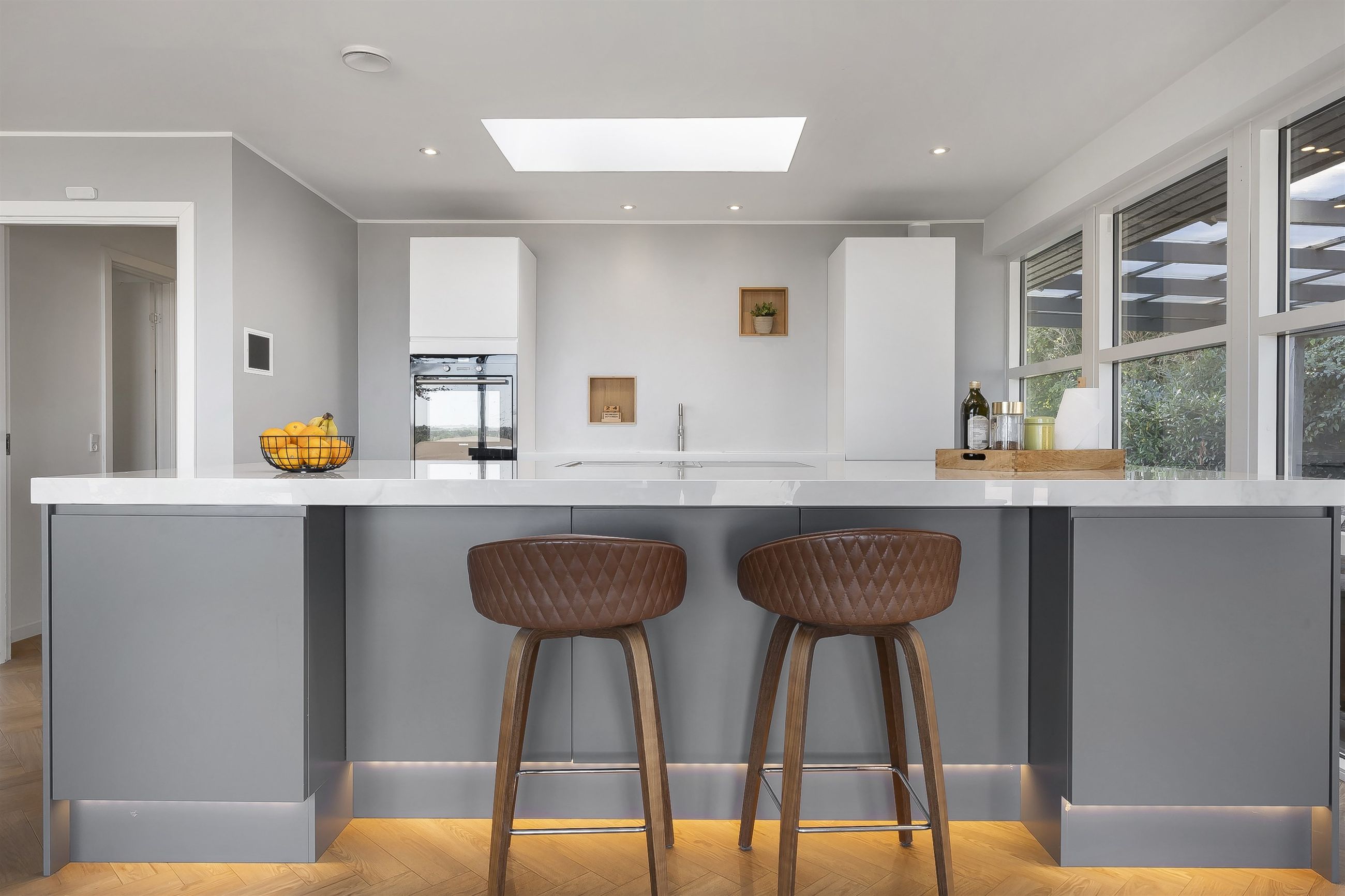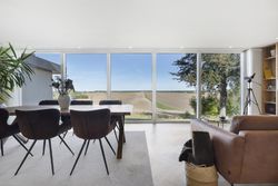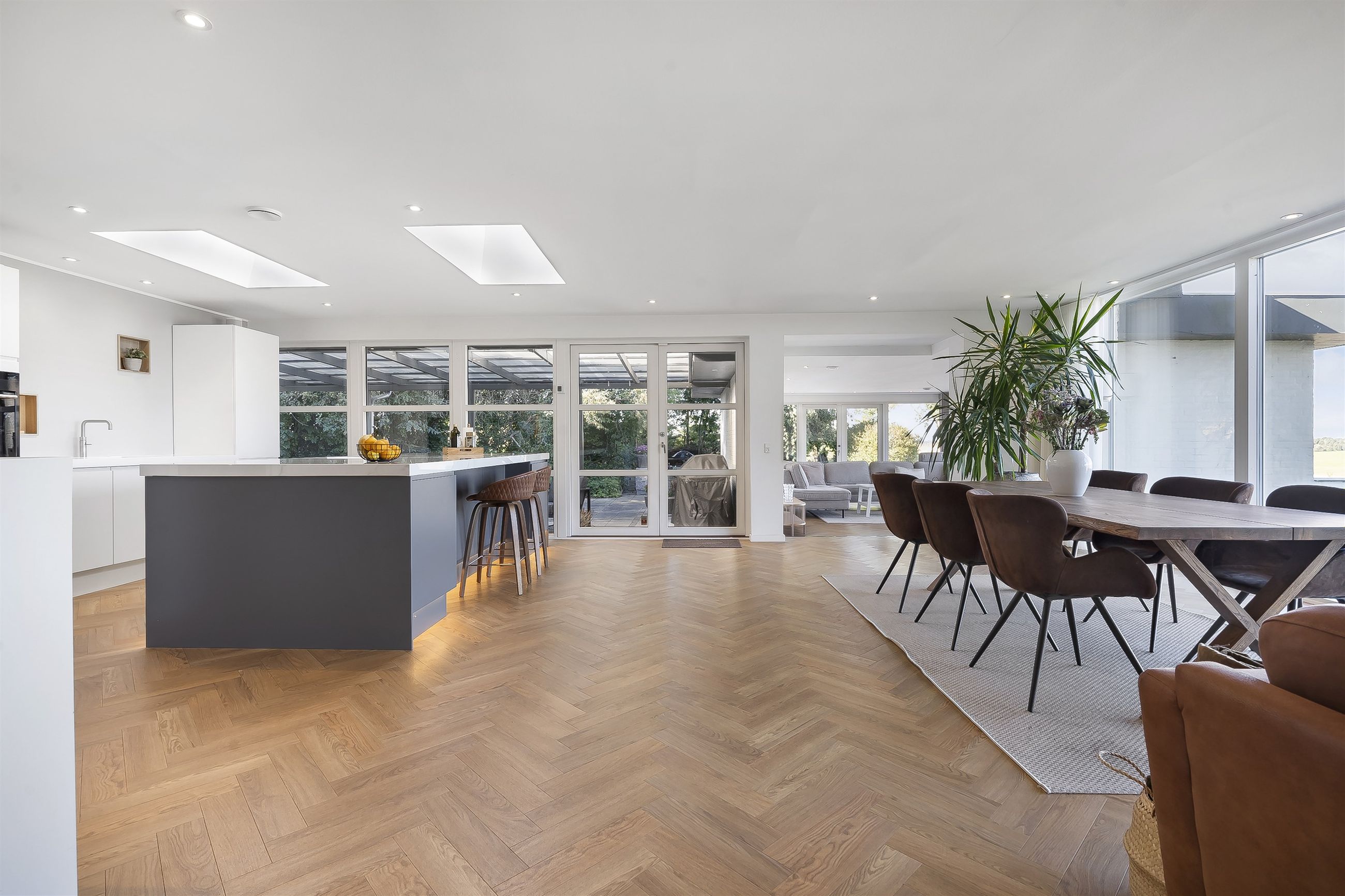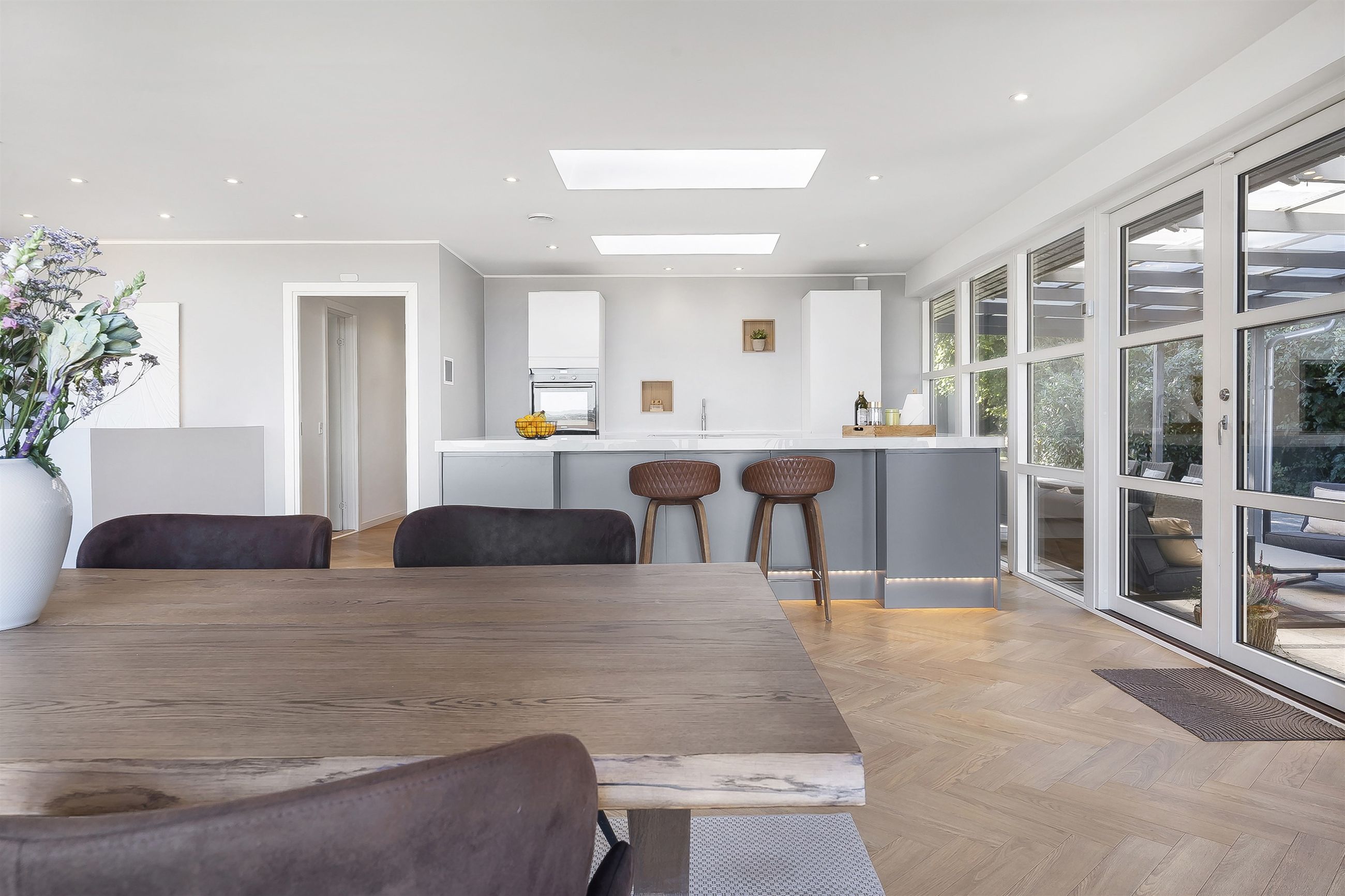 Åben entre som fører direkte ind til et kæmpe køkken-alrum. Køkkenet fremstår åbent og lyst, bl.a. med ovenlysvinduer, vinduespartier mod overdækket vestvendt fliseterrasse og ikke mindst med gulv-til-loft vinduespartier med panoramaudsigt. Køkkenet er med grebsløst design med hvide skuffer og skabslåger på den ene side og med antracit stor køkken-ø i den anden side, som står godt i kontrast i de mørke farver. Der er installeret luft-til-luft varmepumpe i køkkenet.