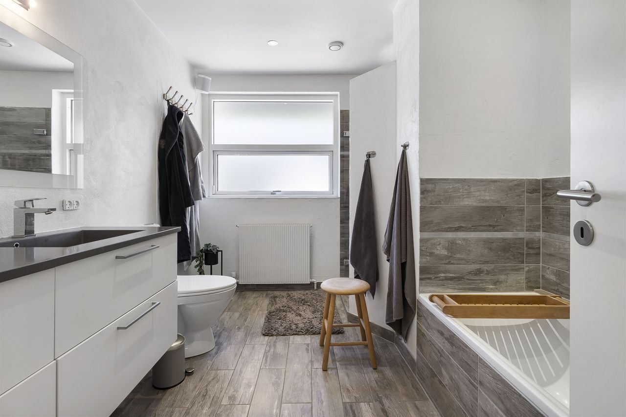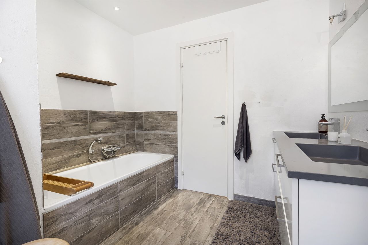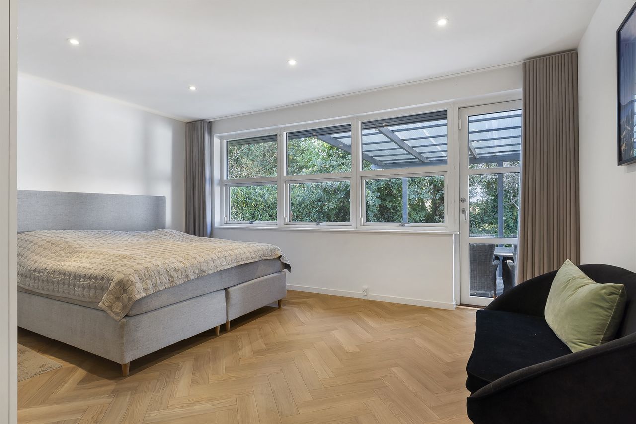 Stort forældreafdeling bestående af to værelser samt badeværelse med både badekar og bruseniche.