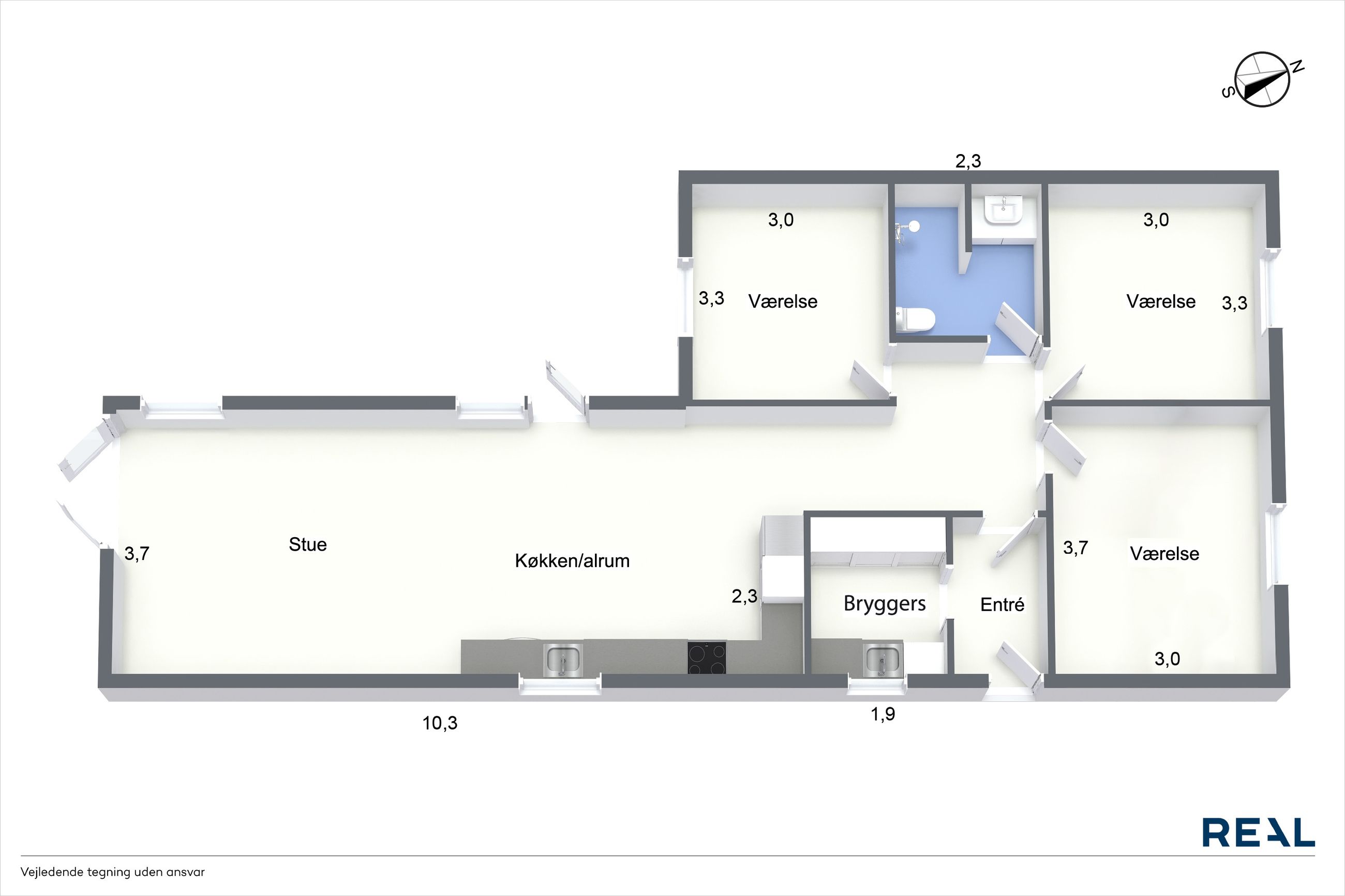 Boligen byder på en optimal planløsning, som gør den nem at indrette og skaber en naturlig opdeling mellem opholds- og soveafdeling. De 3 lyse værelser er indrettet i gode størrelser, hvilket giver plads til både børneværelser, kontor, gæsterum eller walk-in efter behov. Alle rum fremstår lyse med et moderne og venligt udtryk.