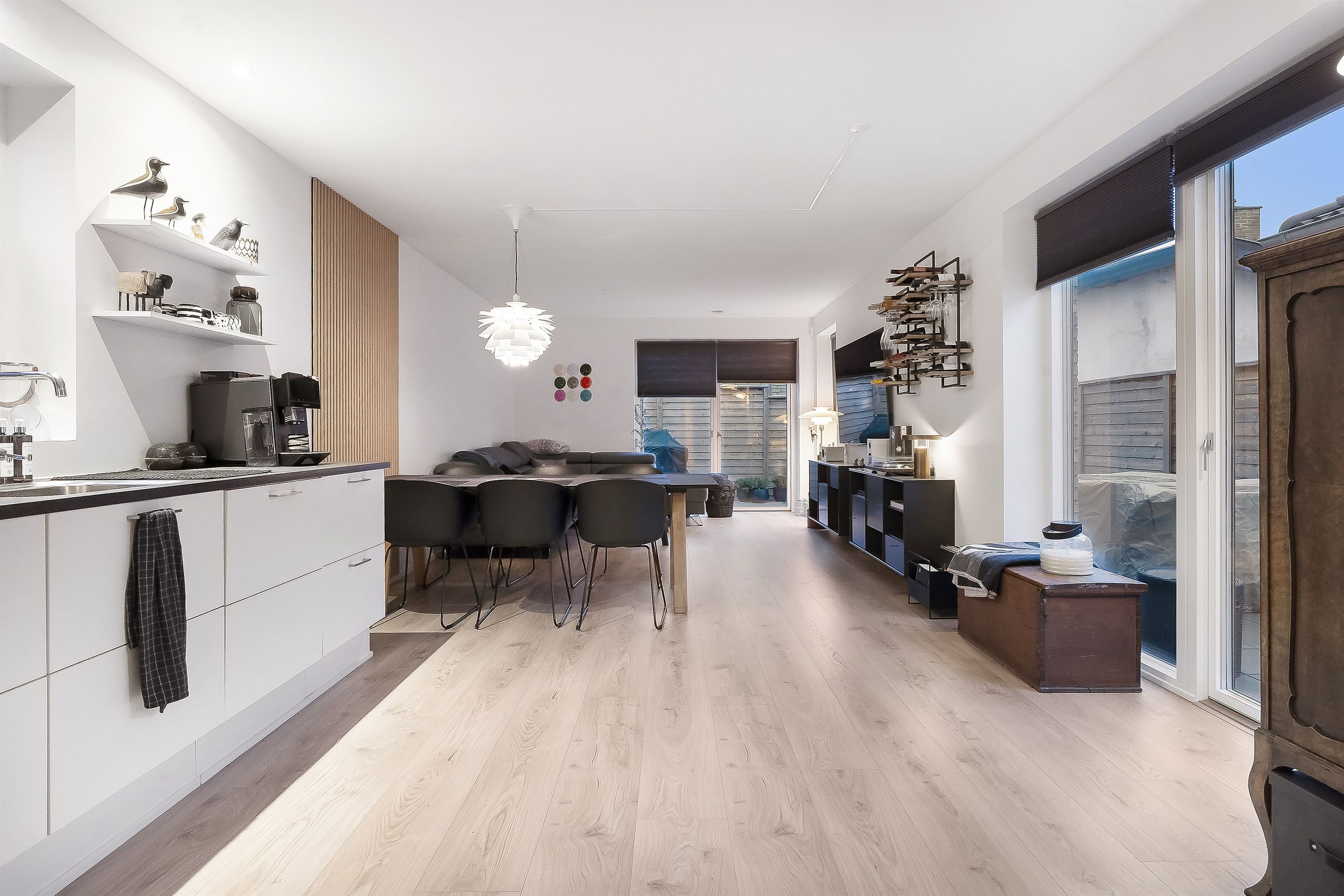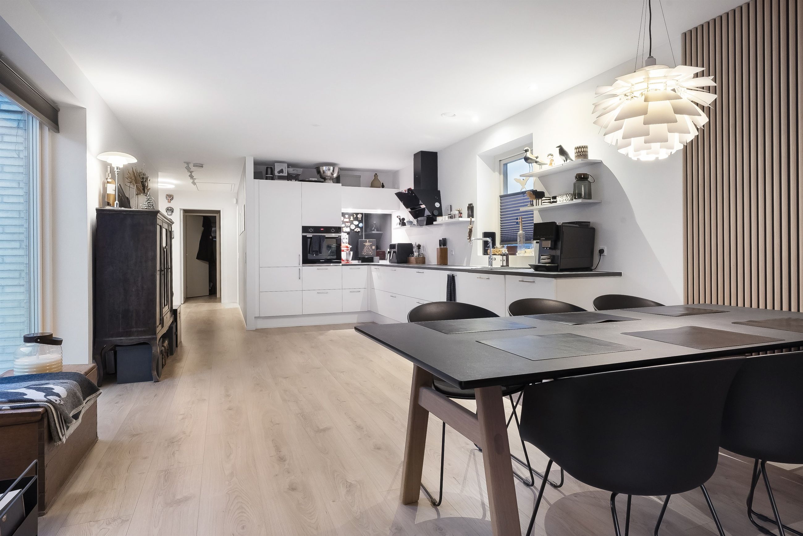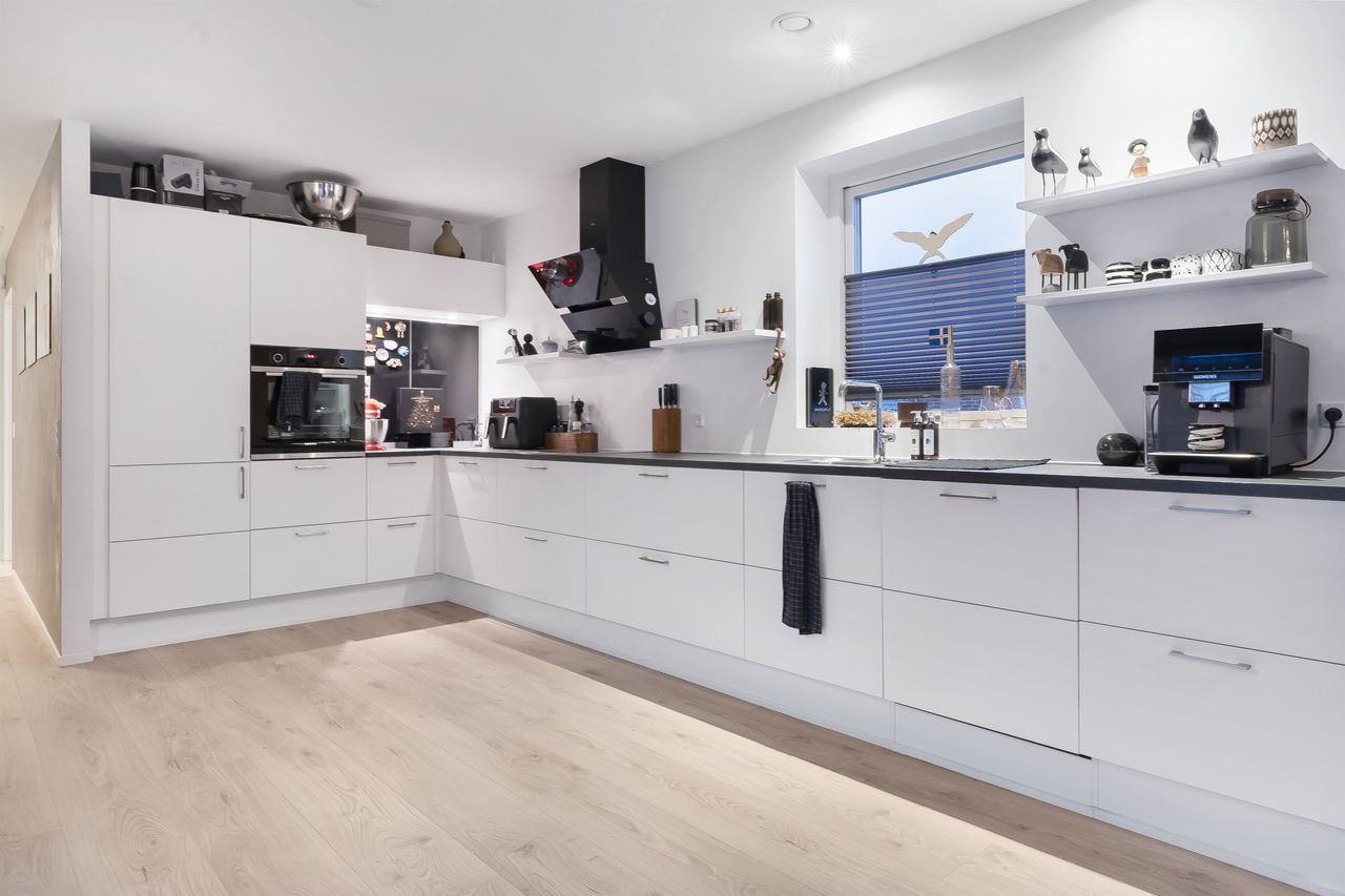 Det store køkken-alrum er husets hjerte. Her er der plads til hverdagsmad, gæster og nærvær, alt sammen i et åbent og indbydende miljø. Køkkenet er opført i moderne stil med lækre materialer, massere af bordplads og kvalitetshvidevarer. Rummet er designet til både praktik og æstetik, så madlavningen bliver en fornøjelse for hele familien.