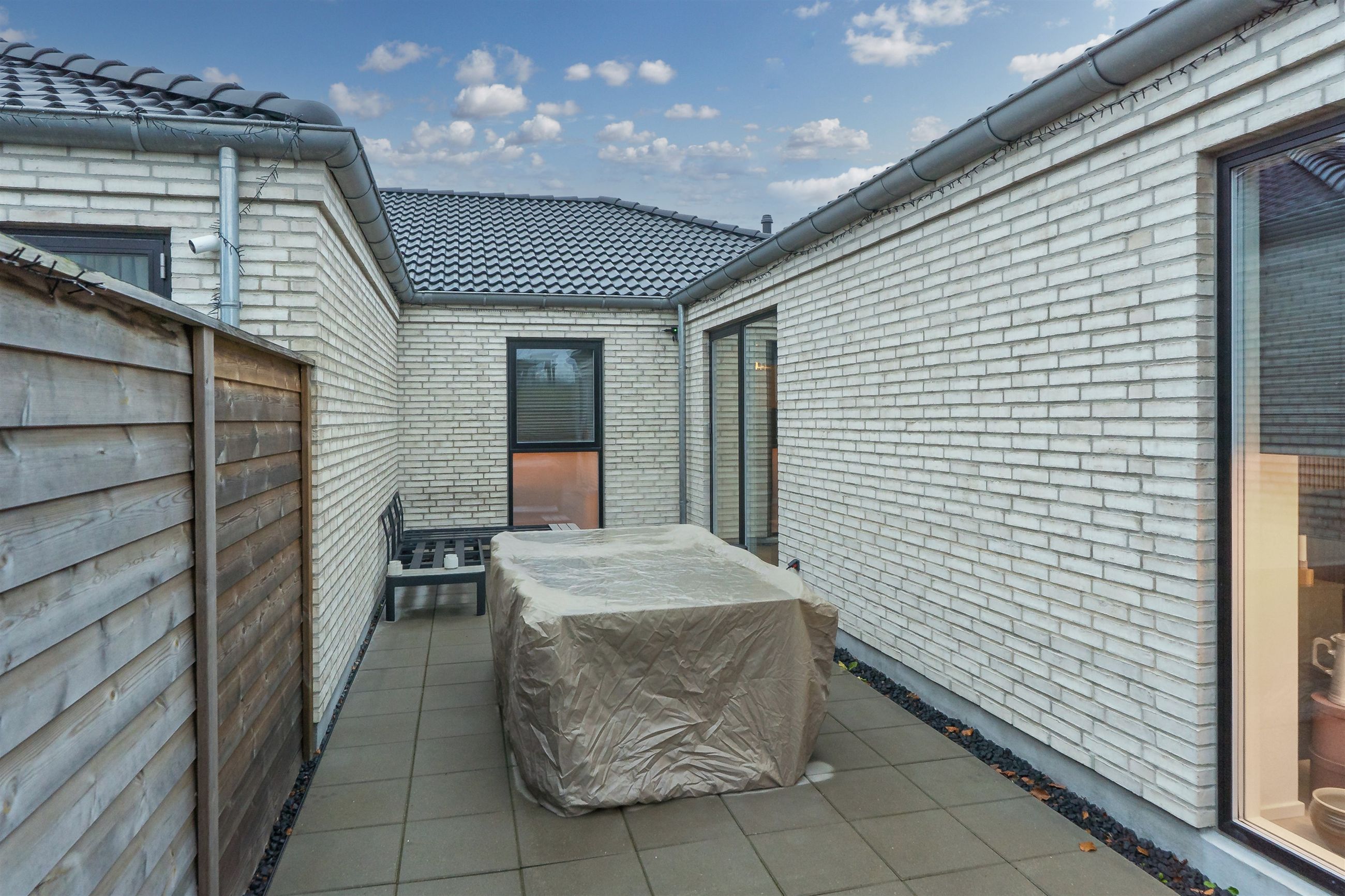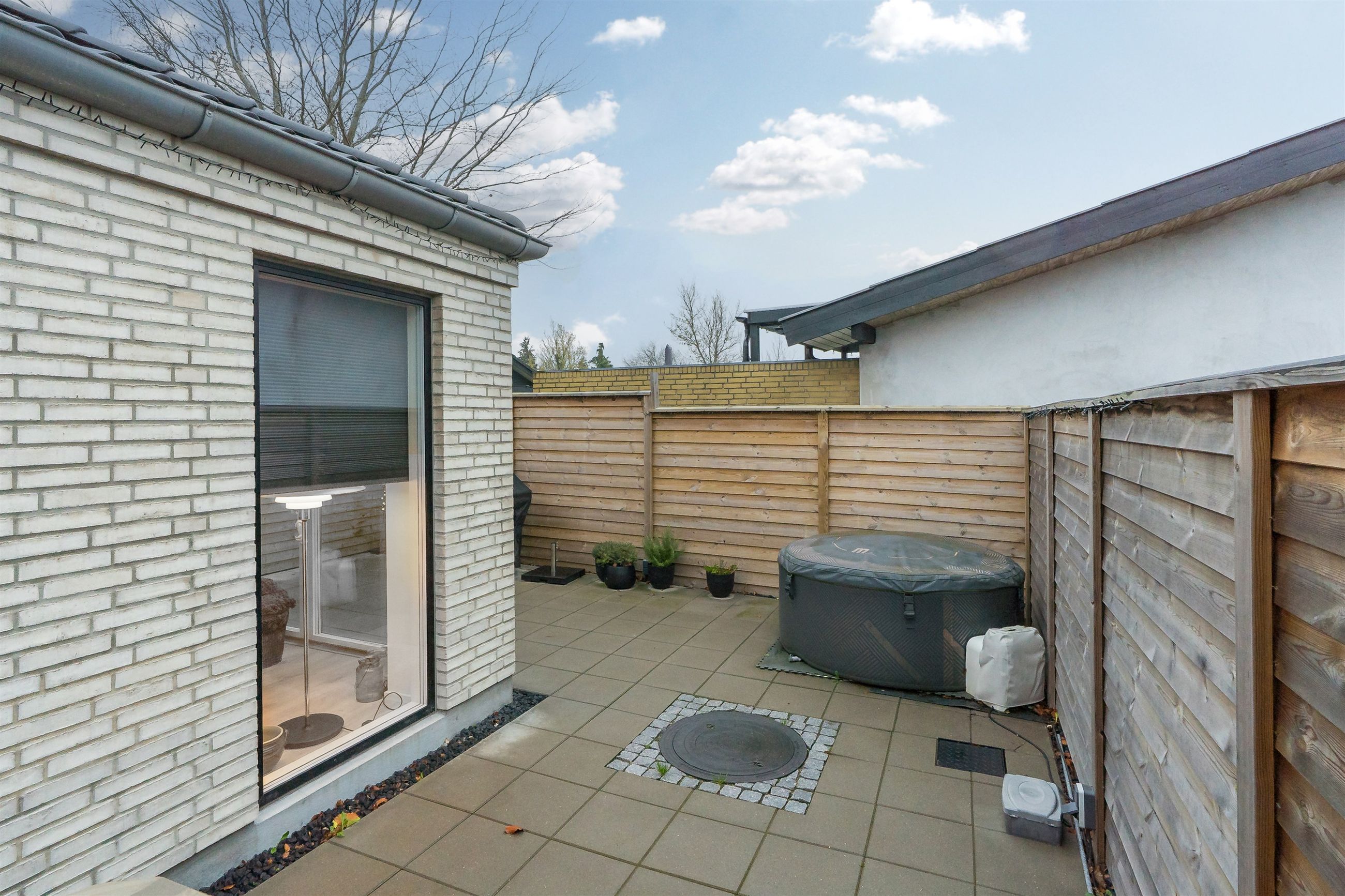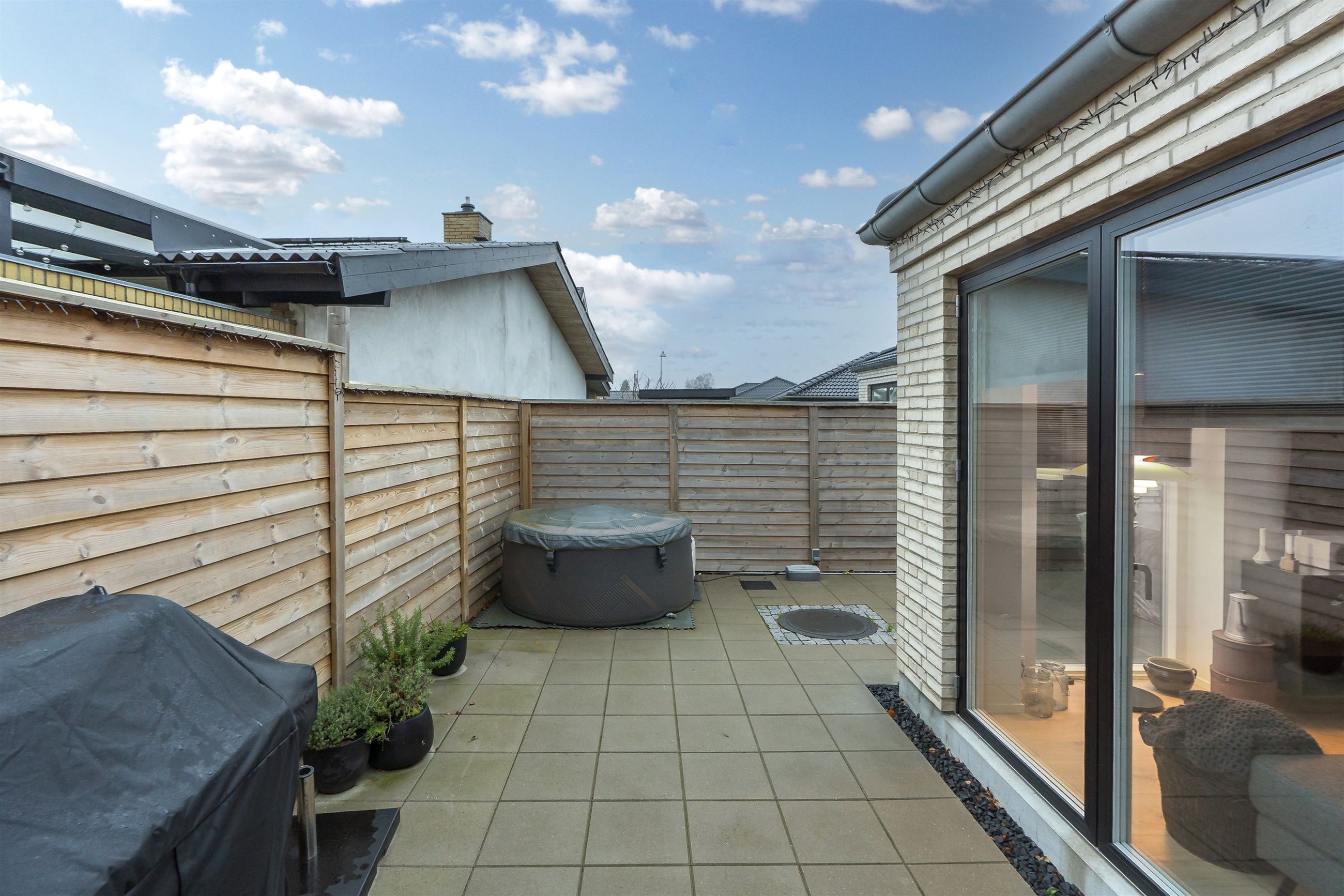 Fra alrummet træder du direkte ud på den store sydvendte, flisebelagte terrasse, som giver optimale rammer for udeliv. Her kan du nyde solen det meste af dagen, arrangere hyggelige grillaftener, skabe et loungeområde eller bare læne dig tilbage og nyde de fredelige omgivelser. Terrassen fungerer som en naturlig forlængelse af boligens opholdsrum og er ideel til både afslapning og sociale aktiviteter.
